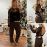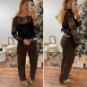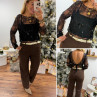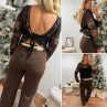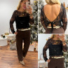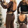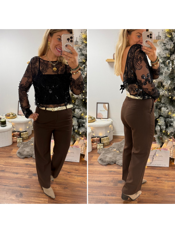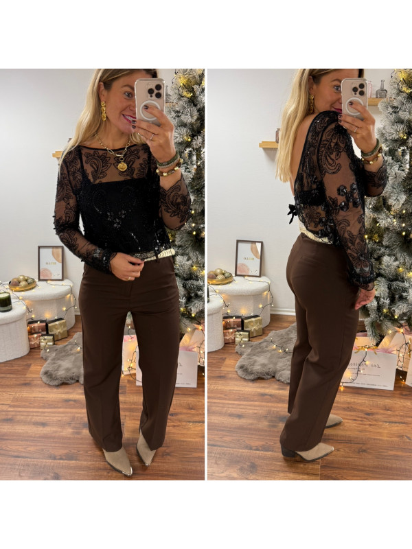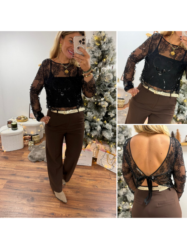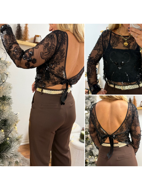 Blouse noire en voile avec perles et sequins dos nu avec noeud satin avec bandeau noir sur le devant