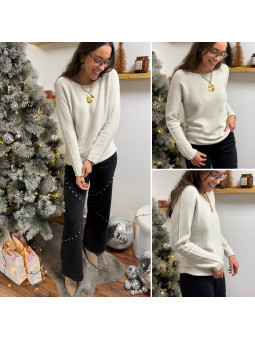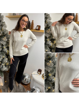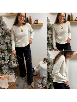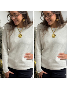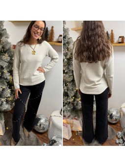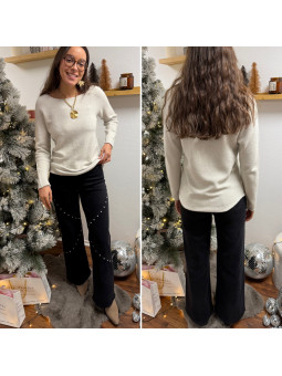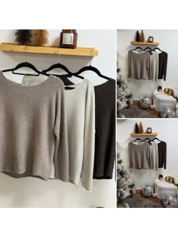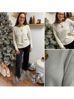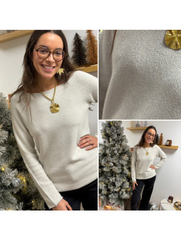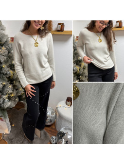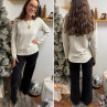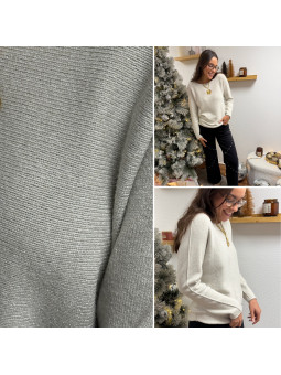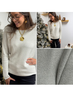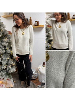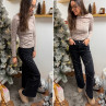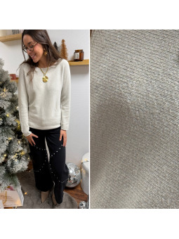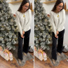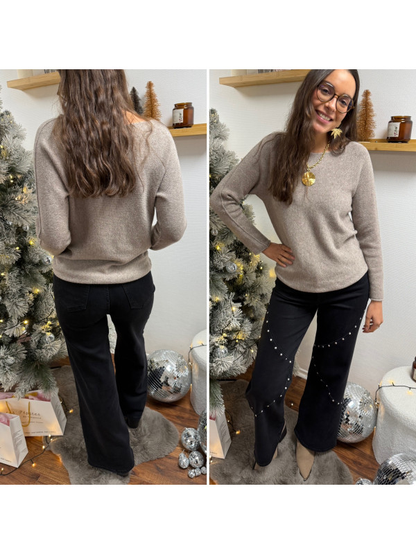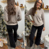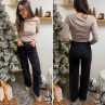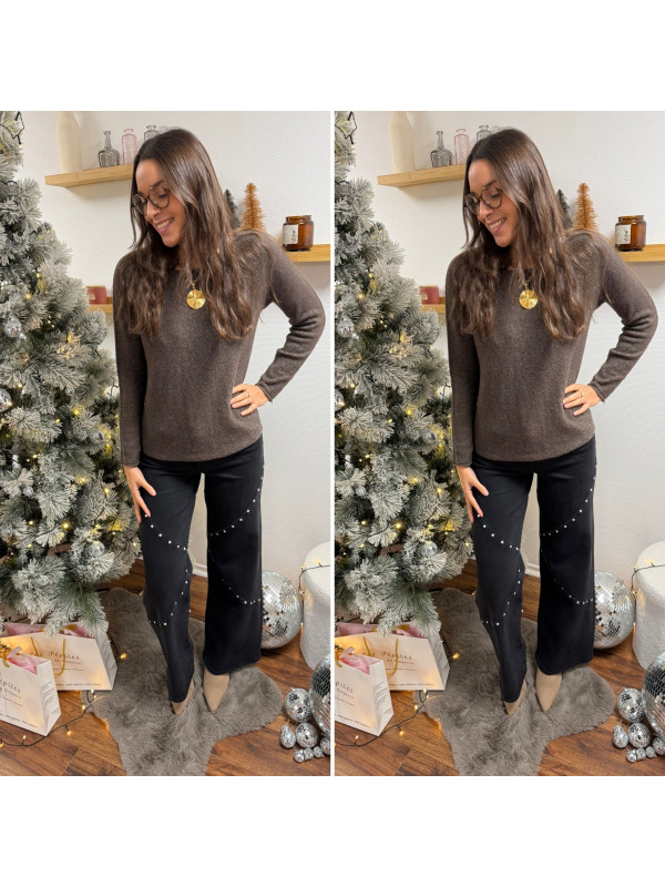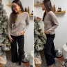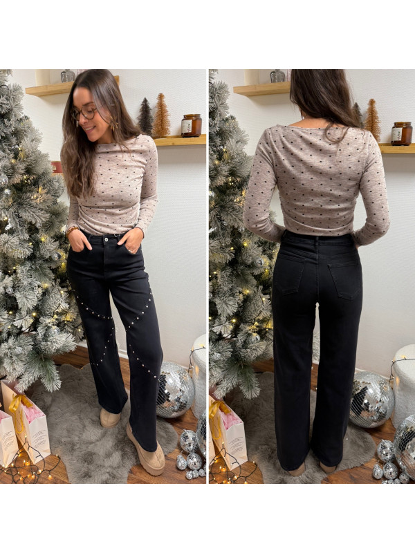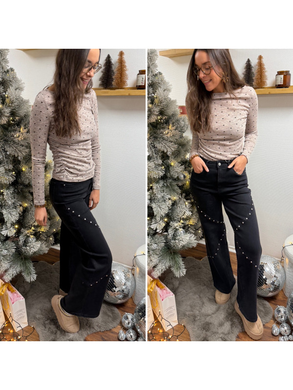Tee shirt à manches longues taupe avec des pois noirs froncé...