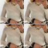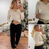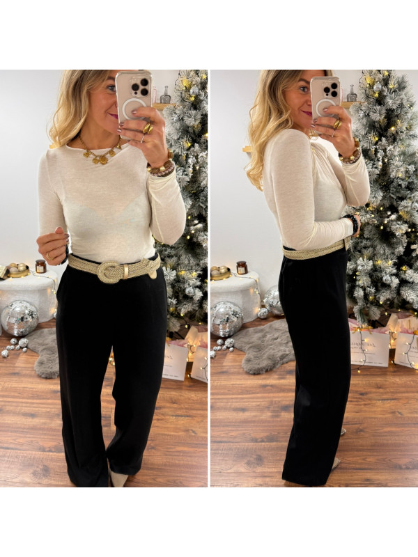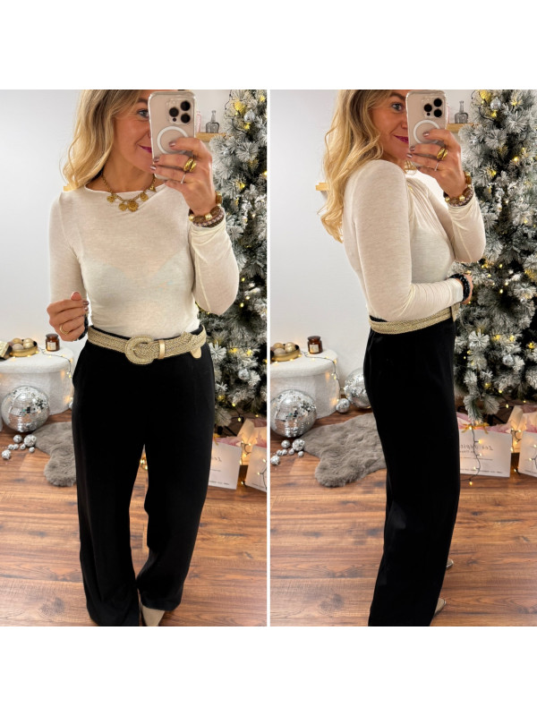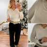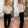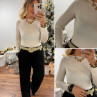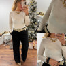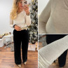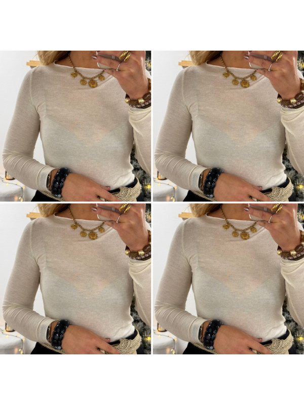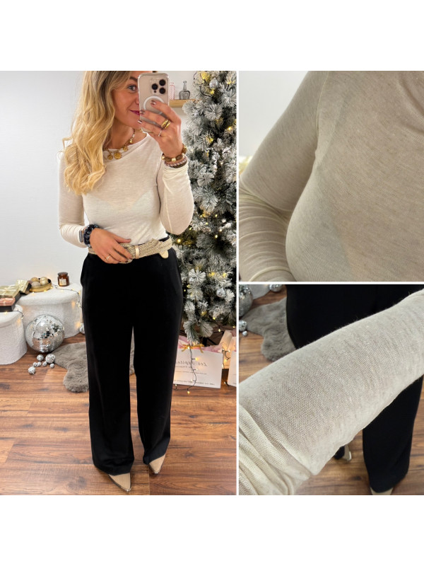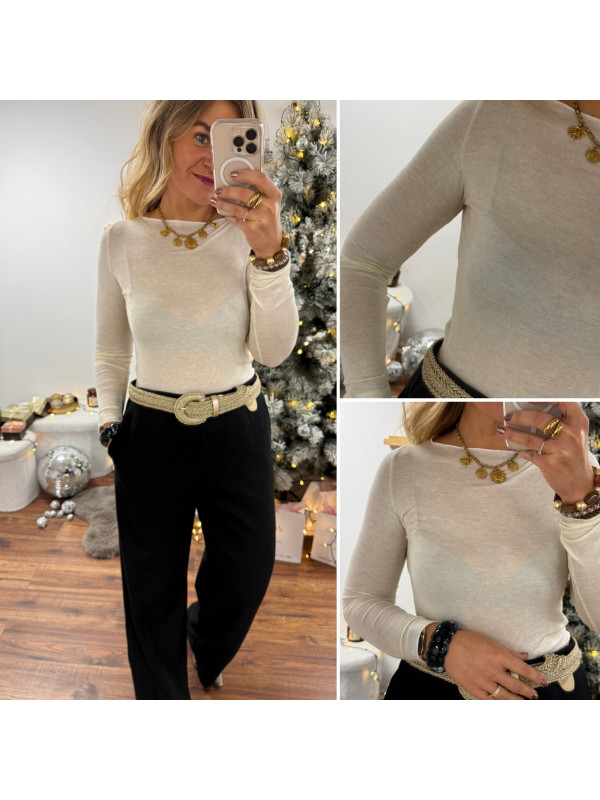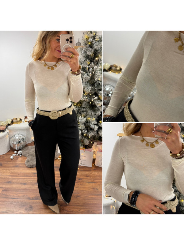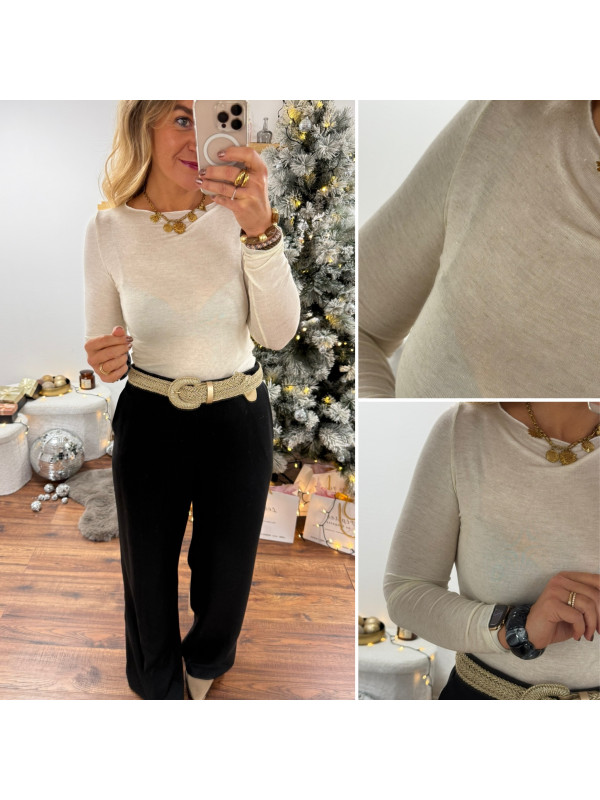 Tee shirt à manches longues fin beige en cachemire avec points de lurex dorés