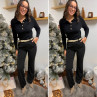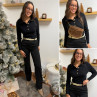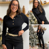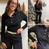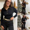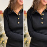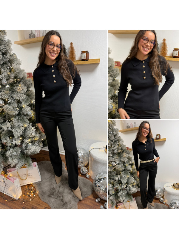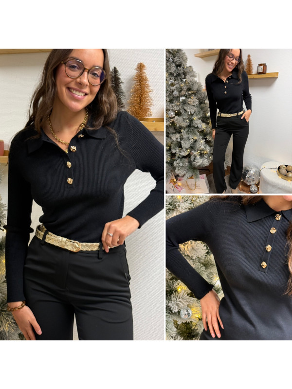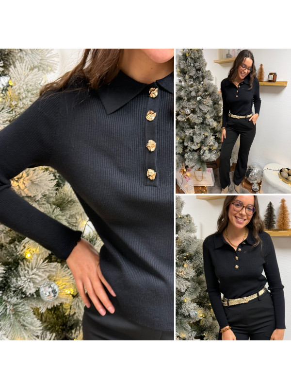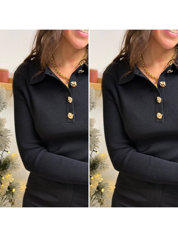 Pull col polo noir en mailles côtelées avec boutons dorés