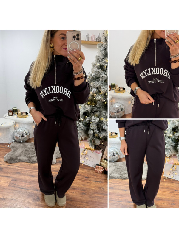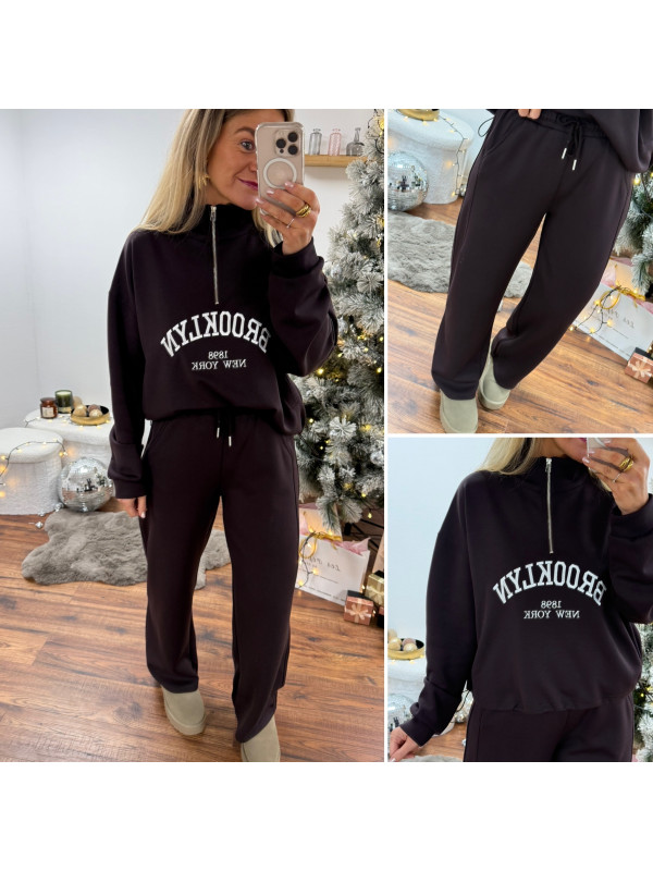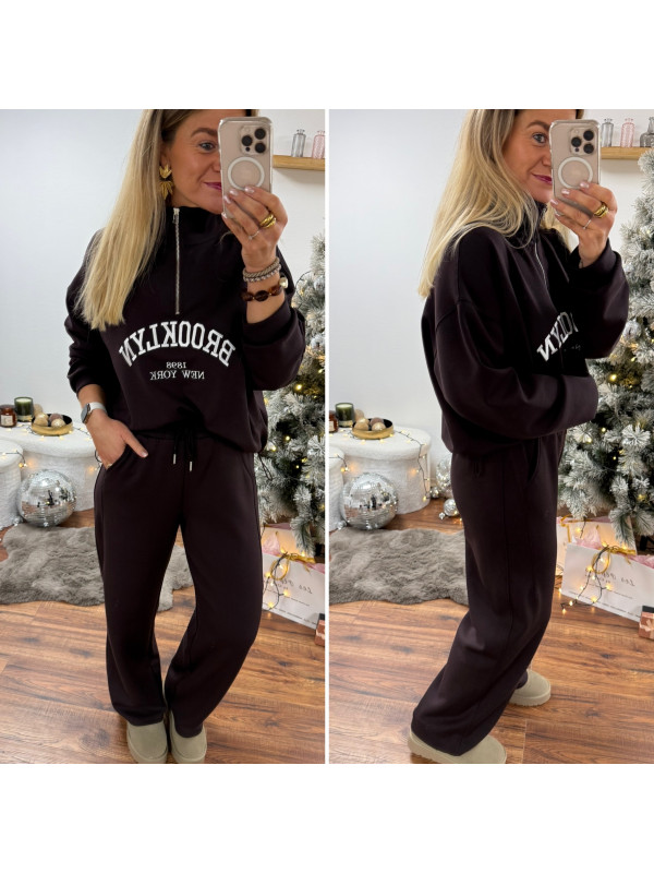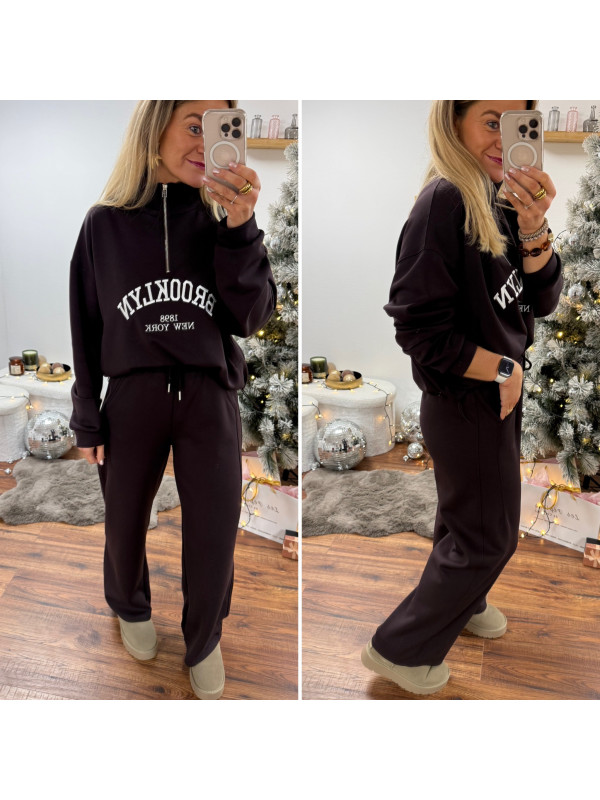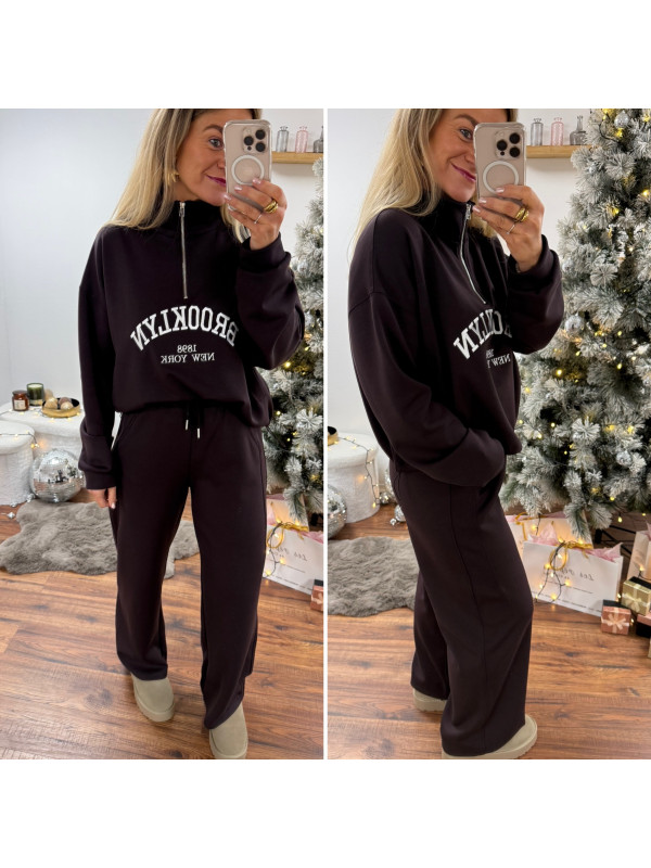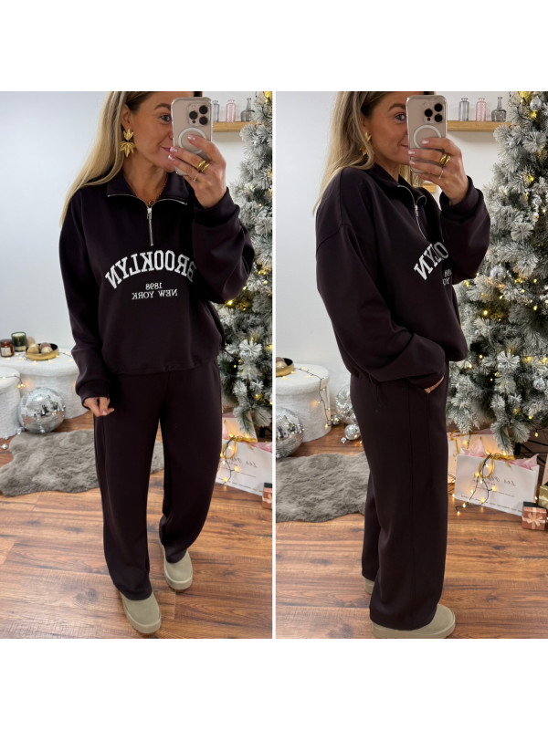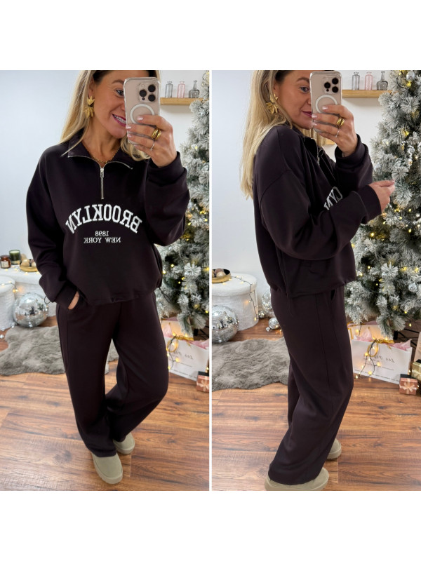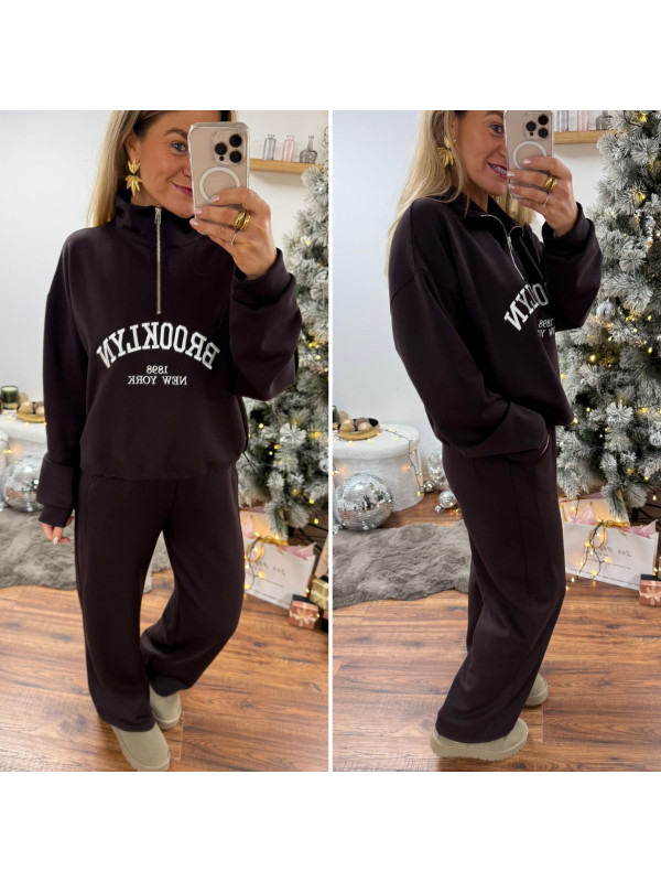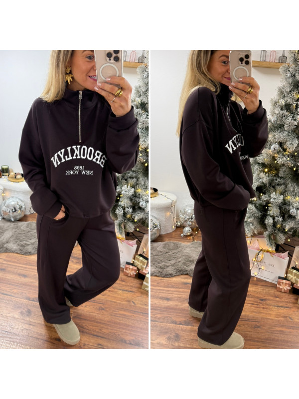 Sweat chocolat avec col zippé, poches et inscription Brooklyn...