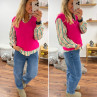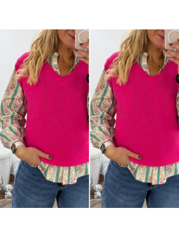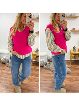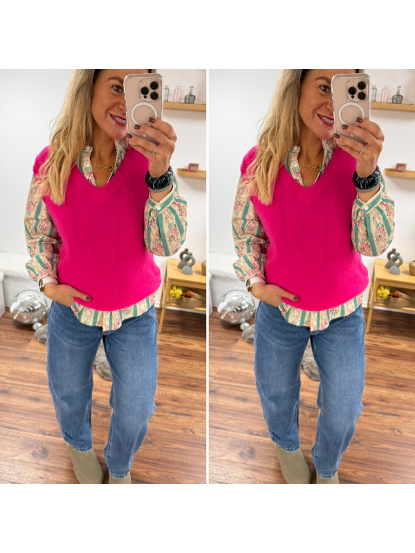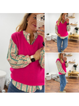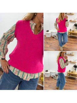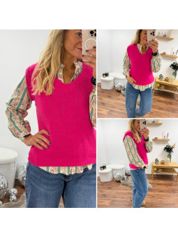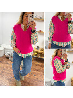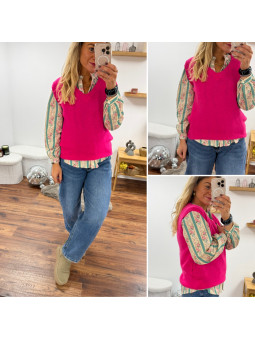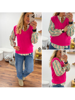 Pull sans manches en alpaga col V rose fuchsia flashy Cet...
