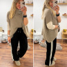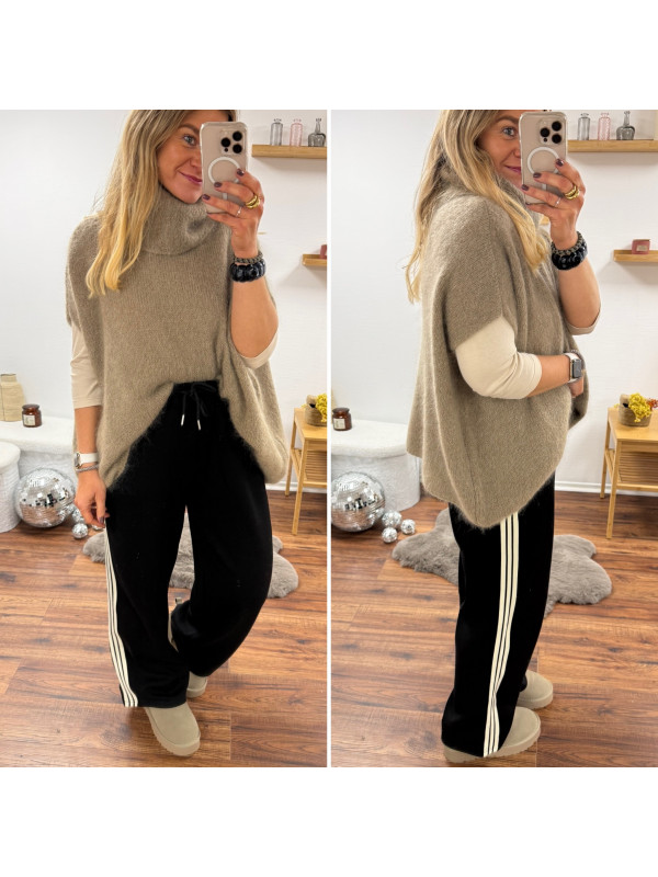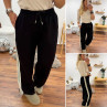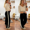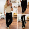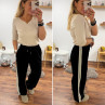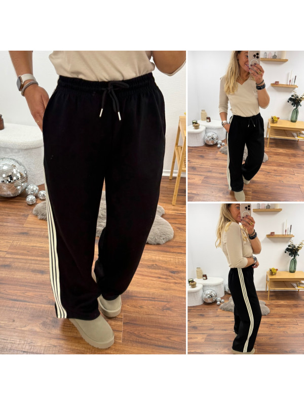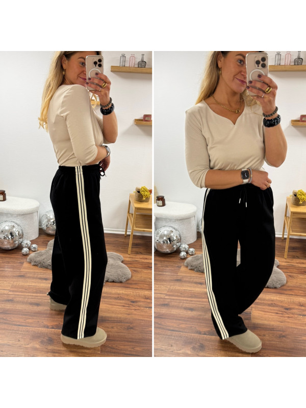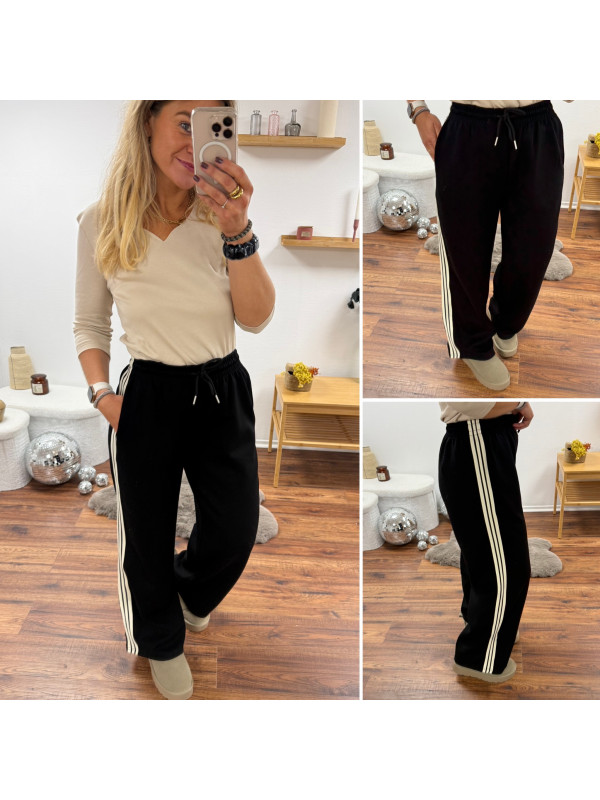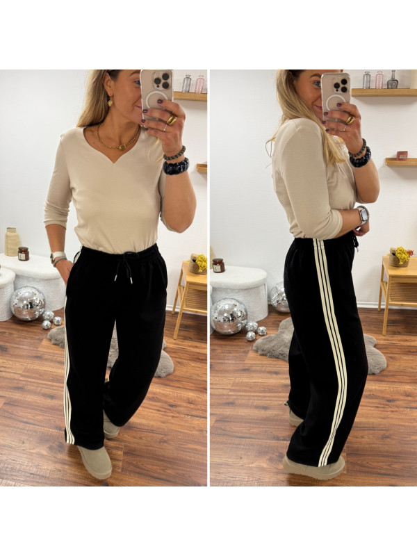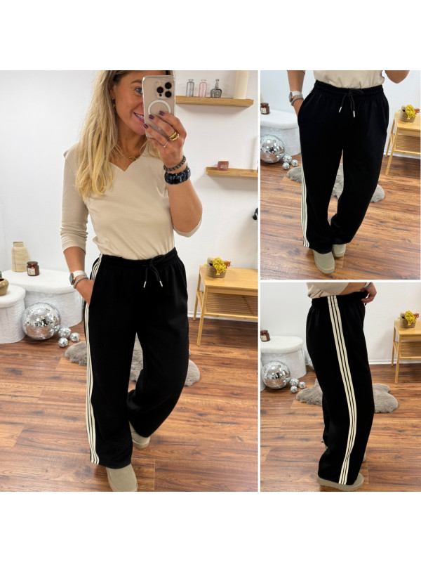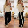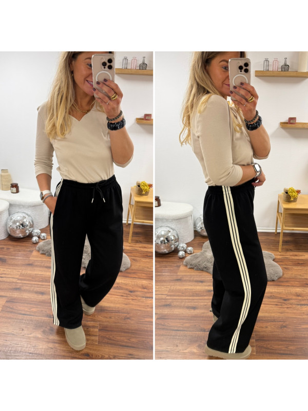 Pantalon fluide souple noir avec lignes beiges sur le côté et lien pour resserrer à la taille