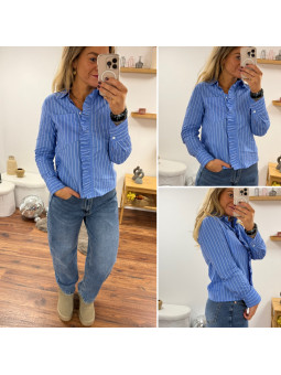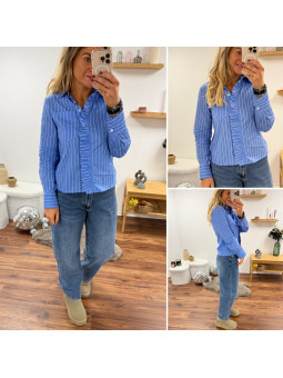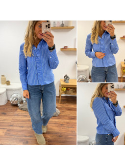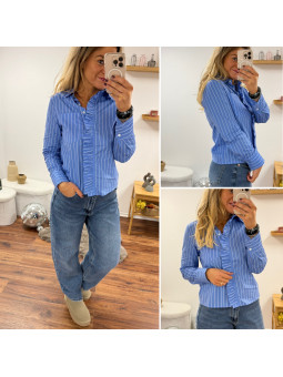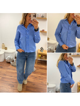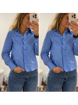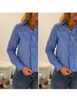 Chemise rayée bleu foncé et blanc avec volants sur le devant...