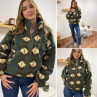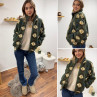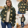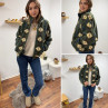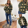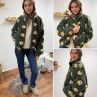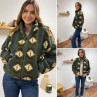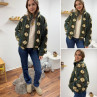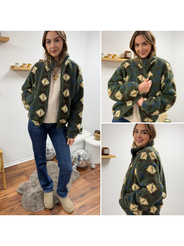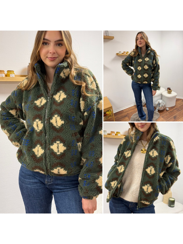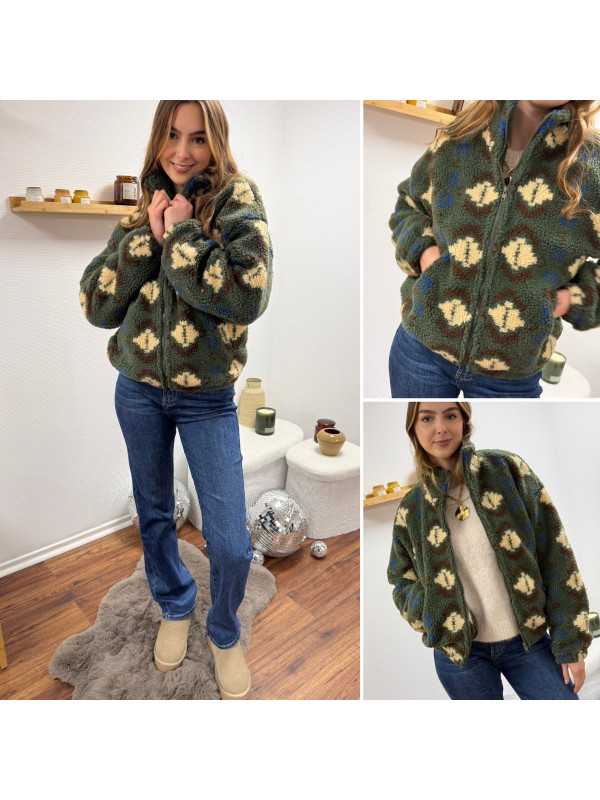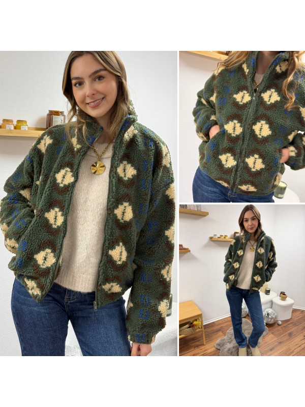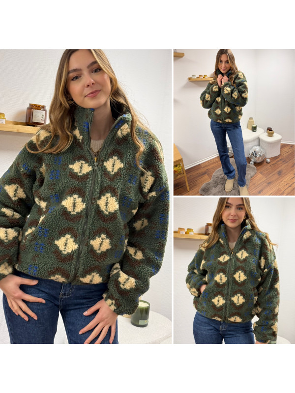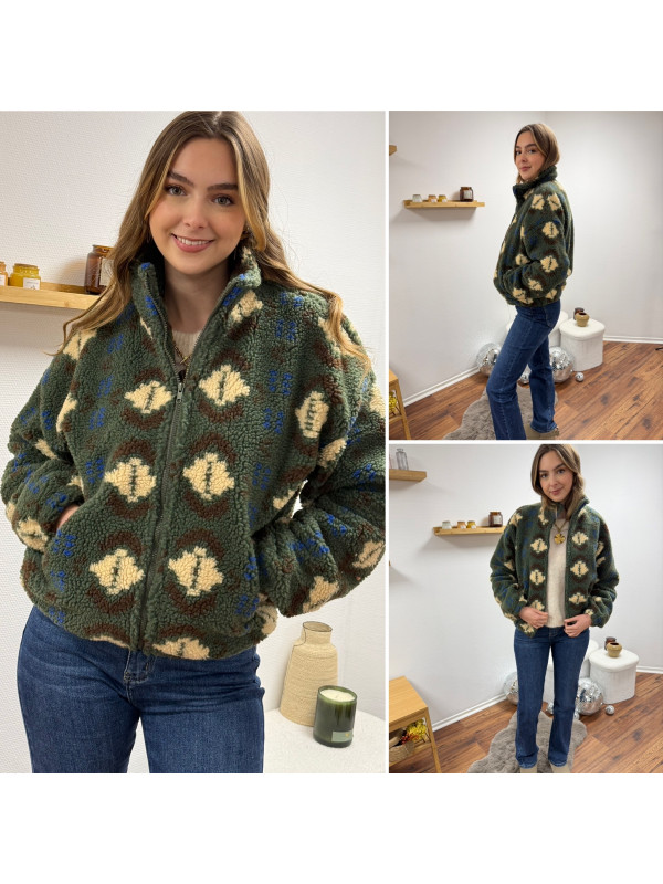 Veste à bouclettes col montant kaki avec des motifs chocolats, écrus et bleus
