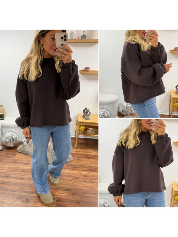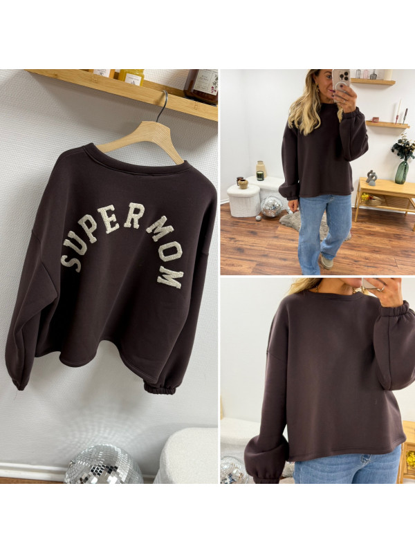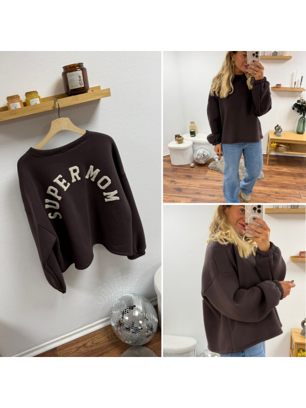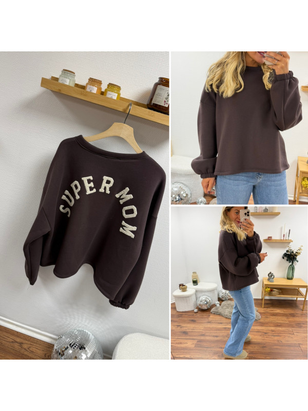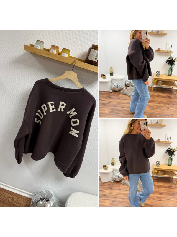 Sweat oversize chocolat tout doux logo super mom dans le dos