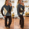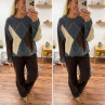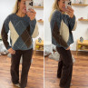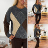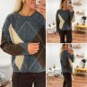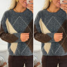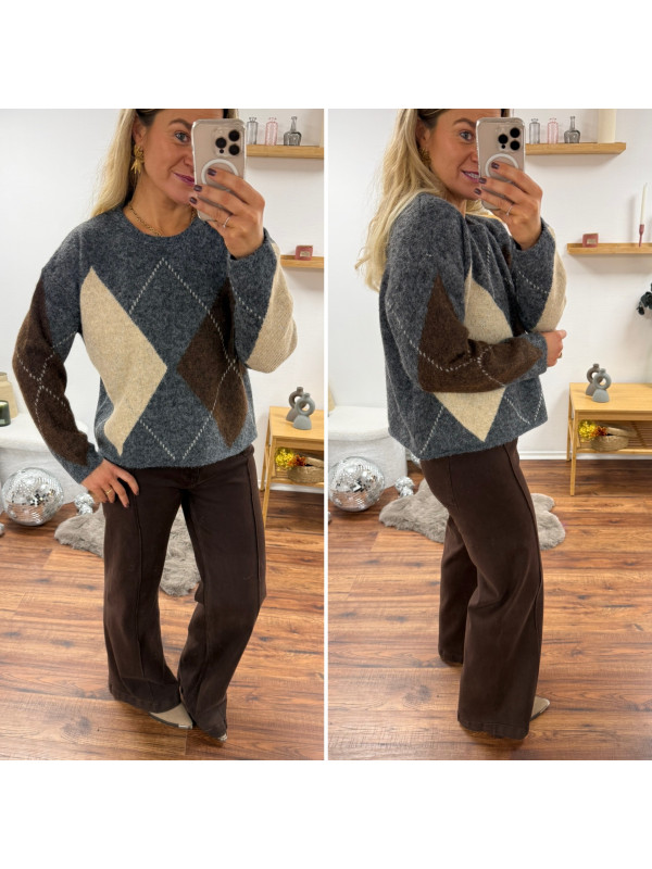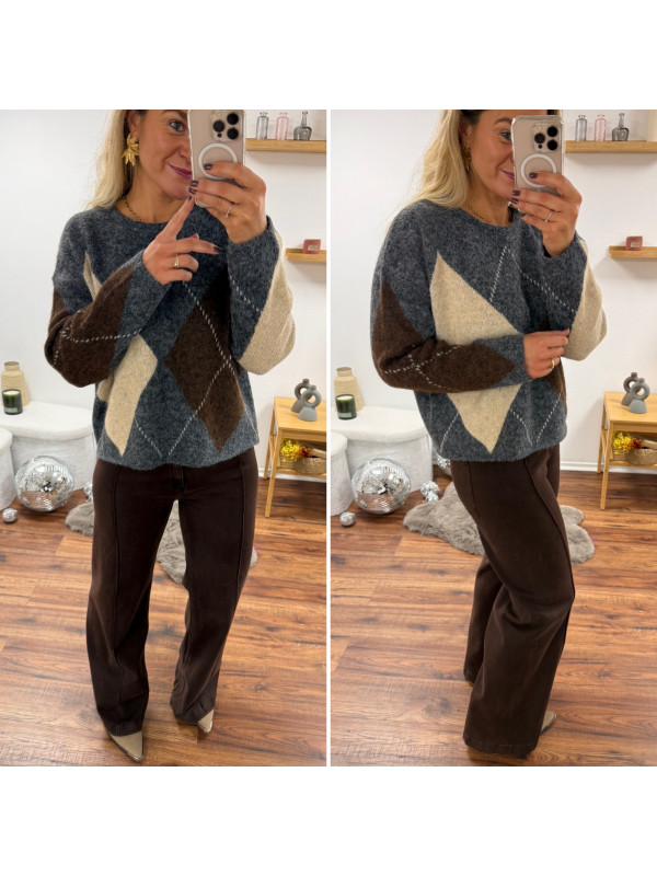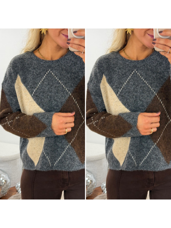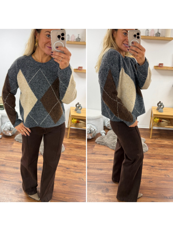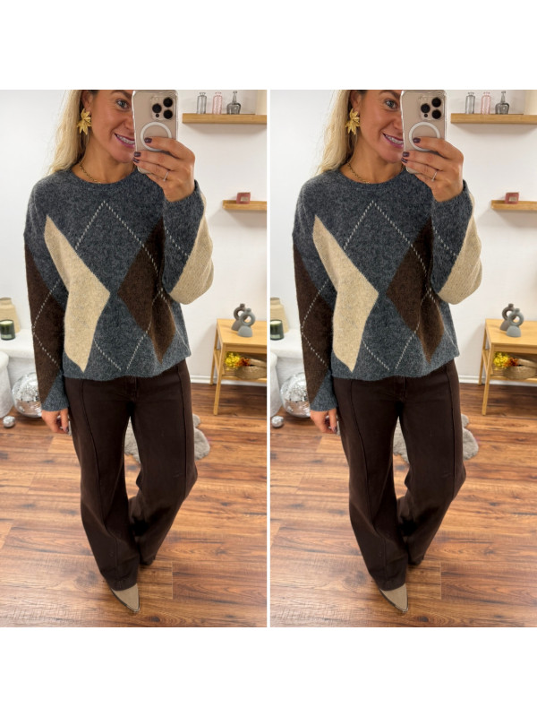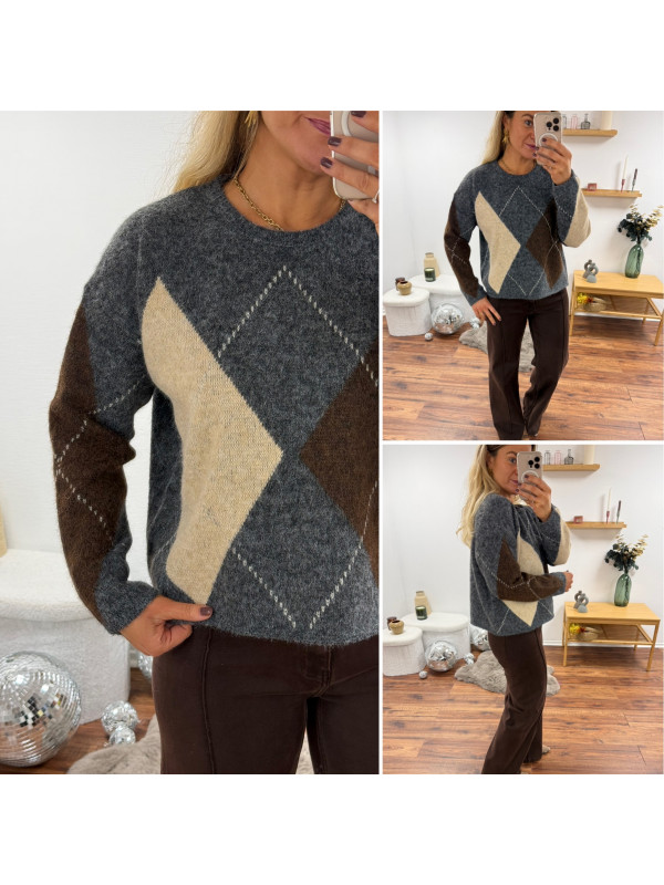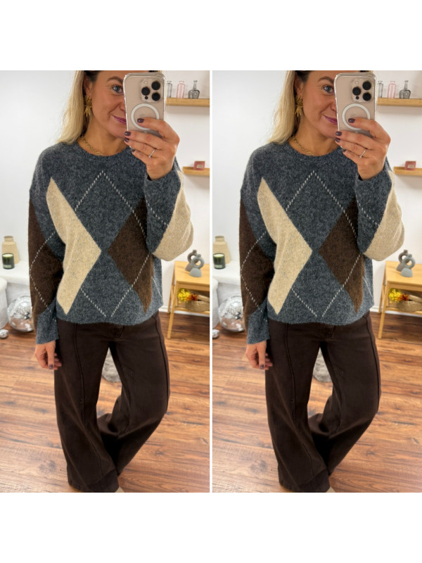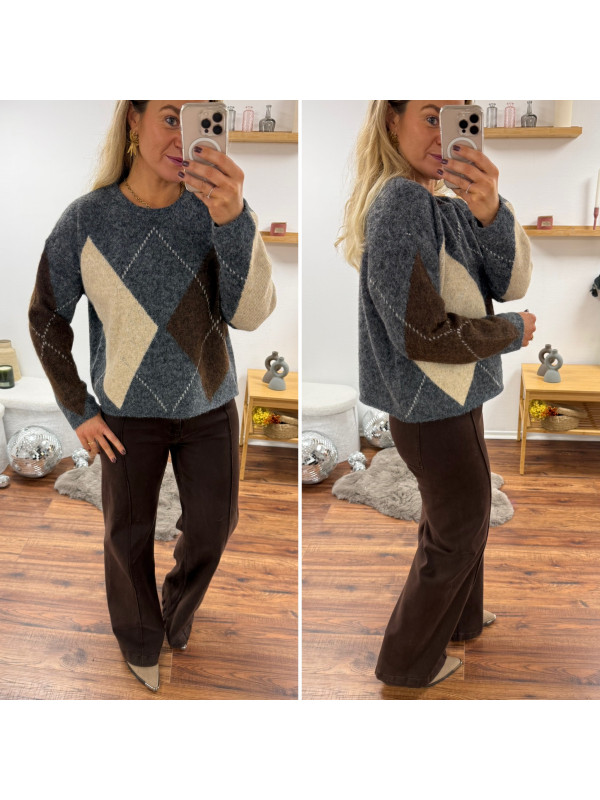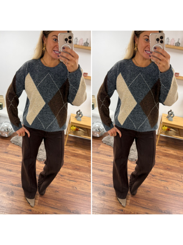 Pull gris anthracite avec losanges beiges et chocolats