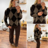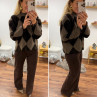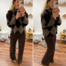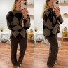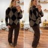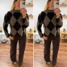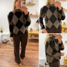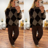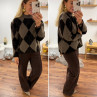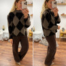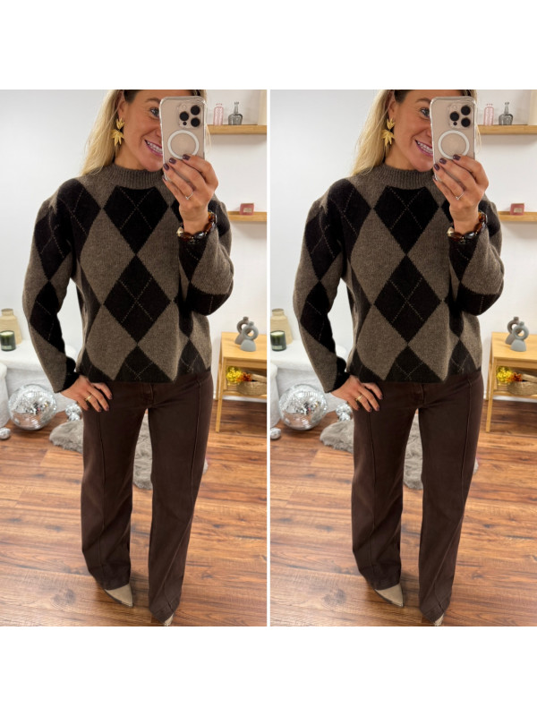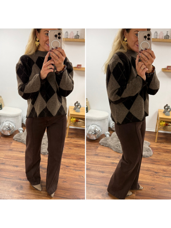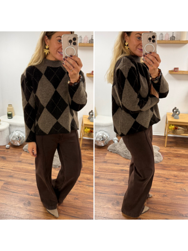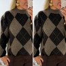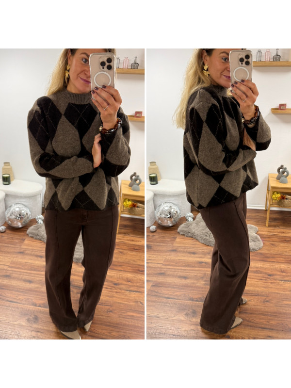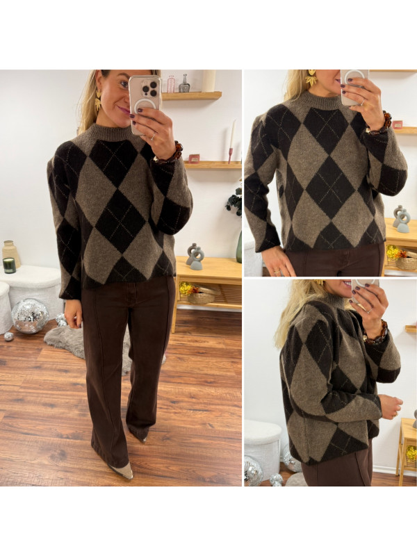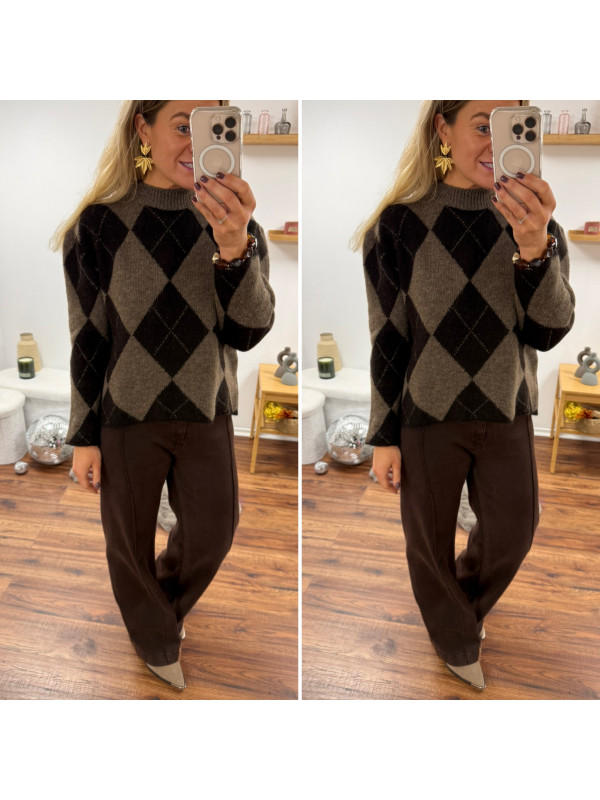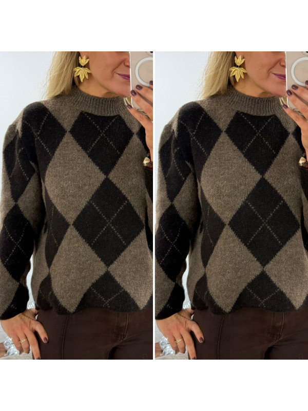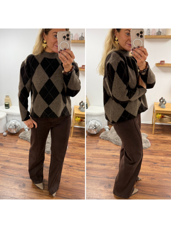 Pull taupe et noir à losanges avec col légèrement montant et manches ballon