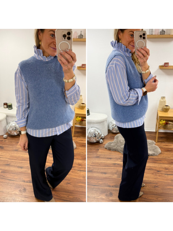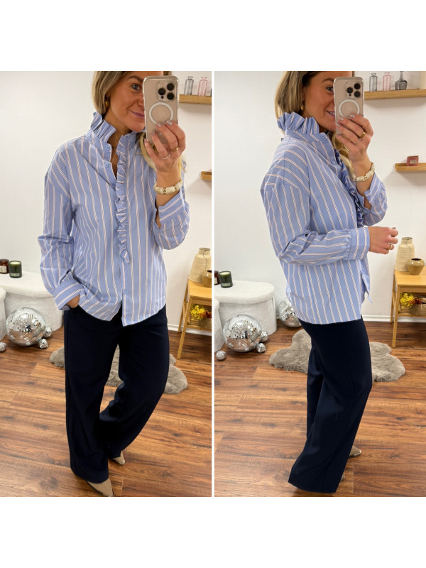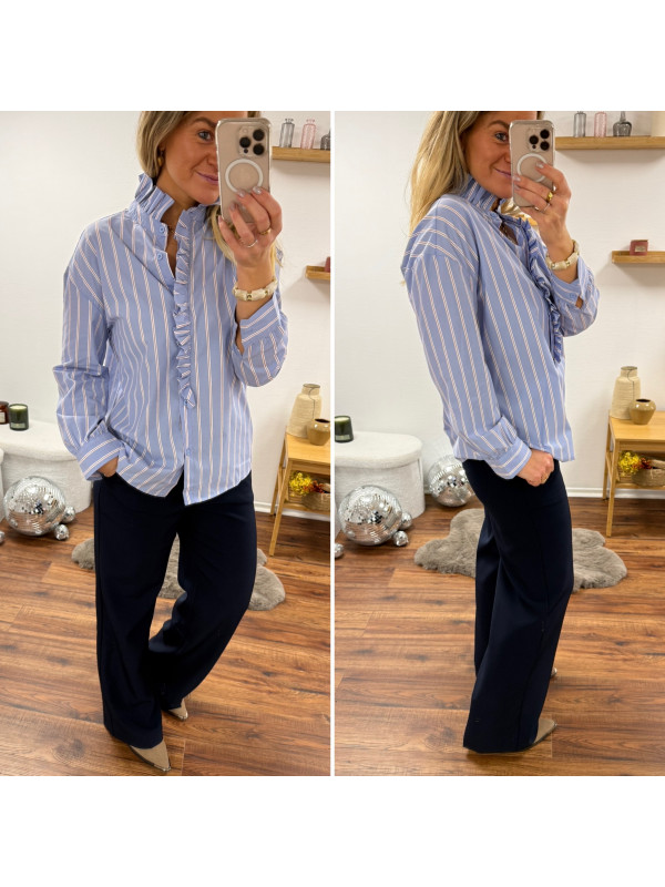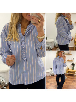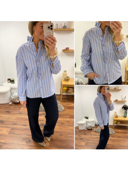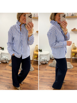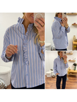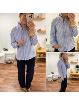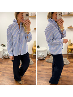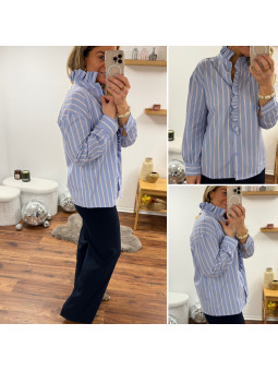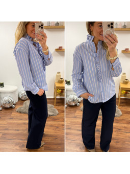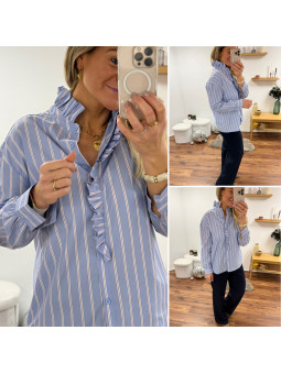 Chemise bleu ciel avec rayures blanches et rouge et volants...