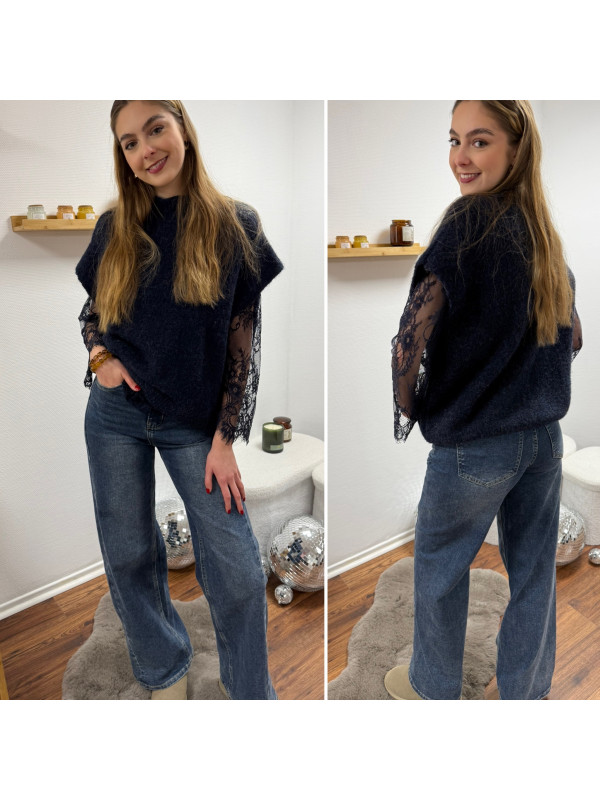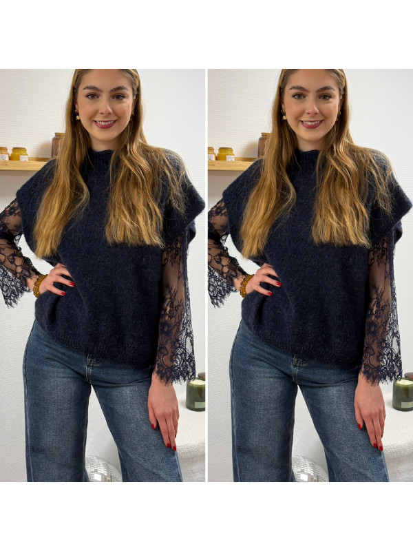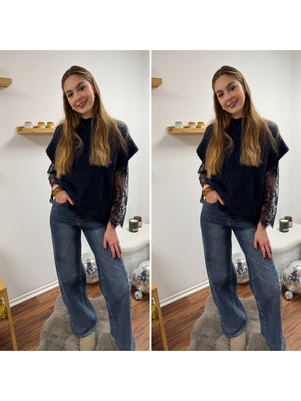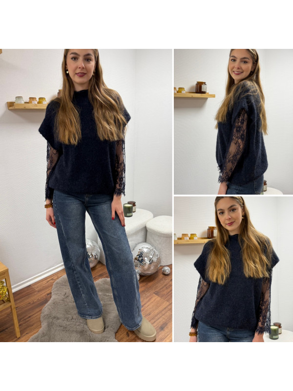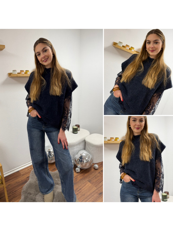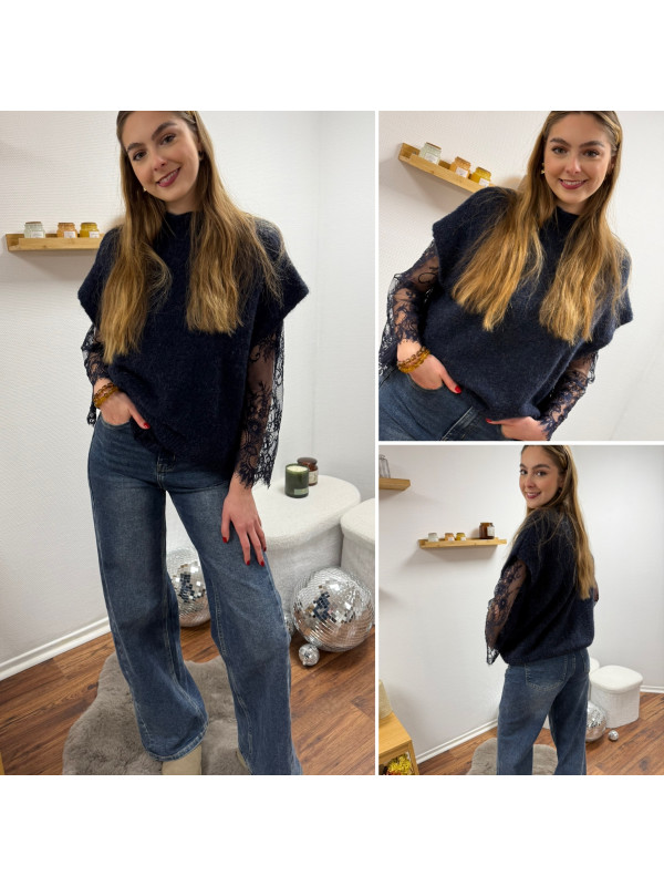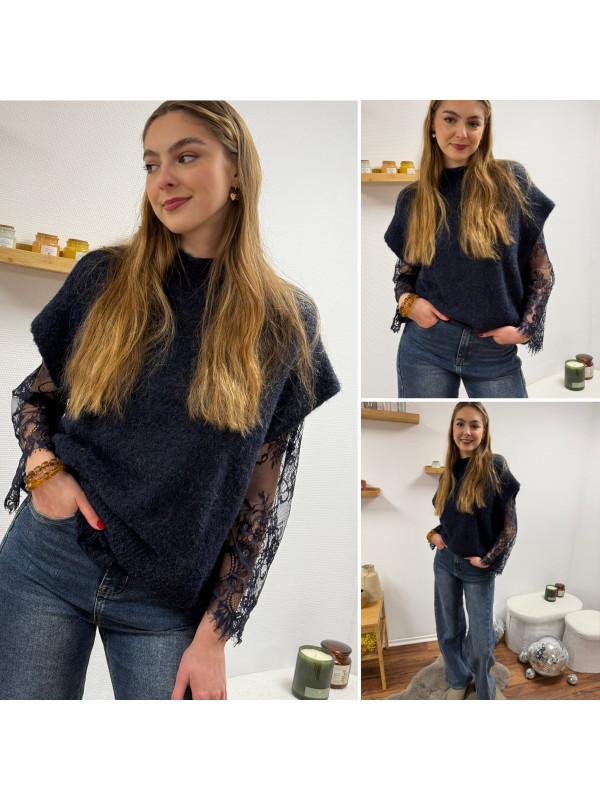 Pull sans manches bleu marine avec manches en dentelle intégrées