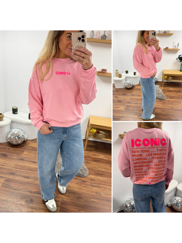 Sweat couleur rose pastel avec écritures iconic en rose fluo et orange