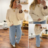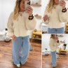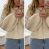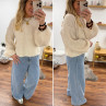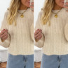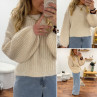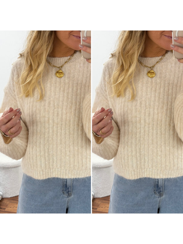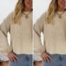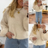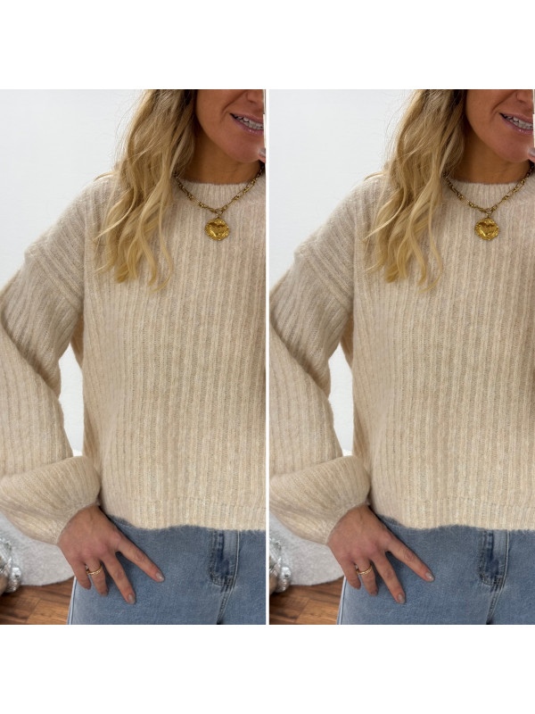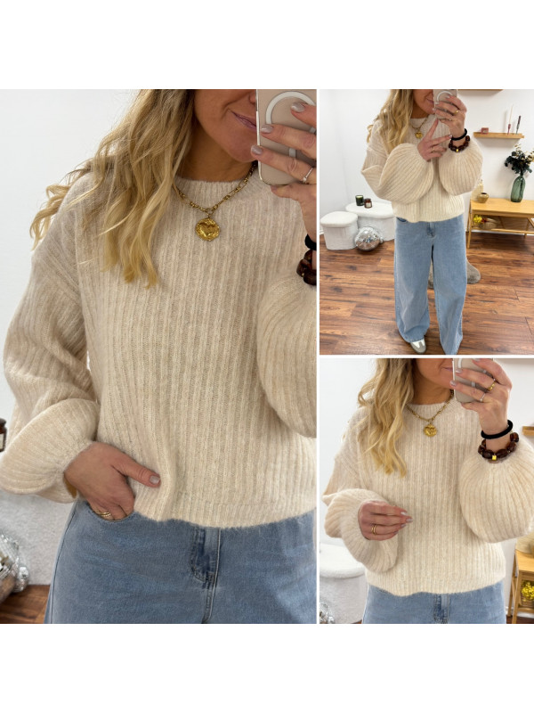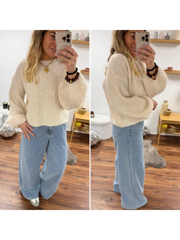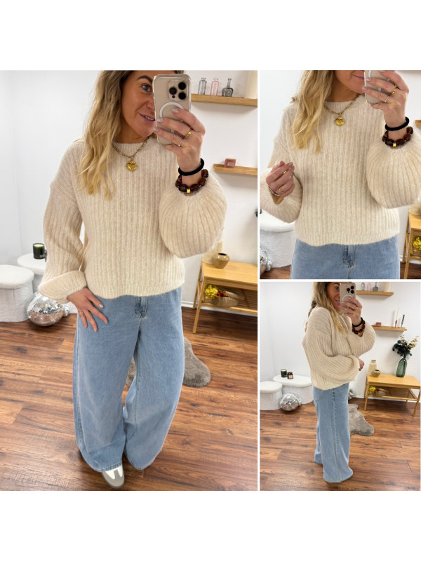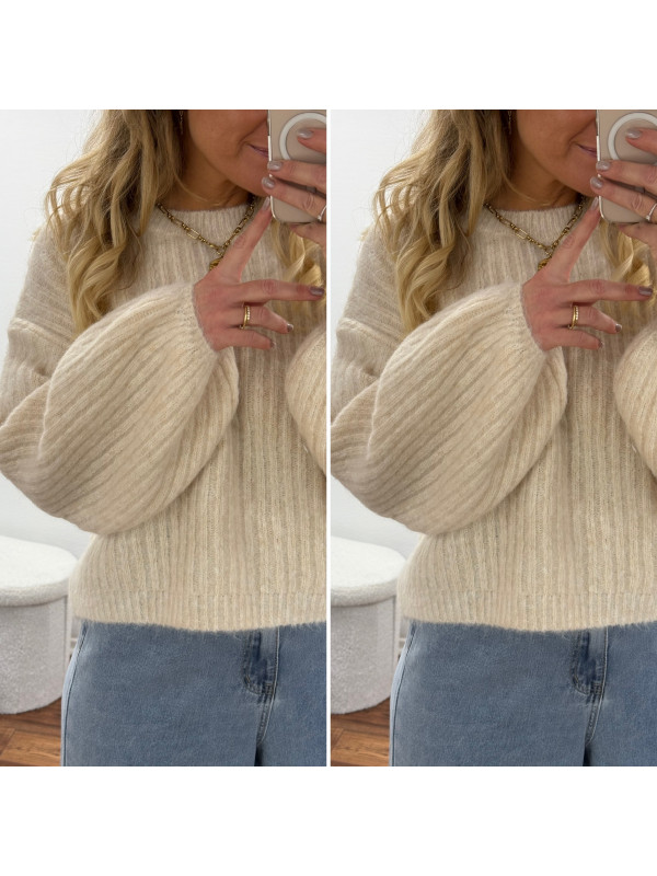 Pull beige clair chiné col rond en grosses mailles avec manches bouffantes