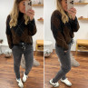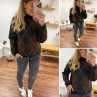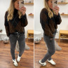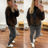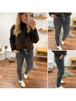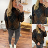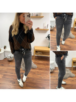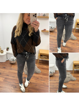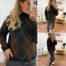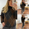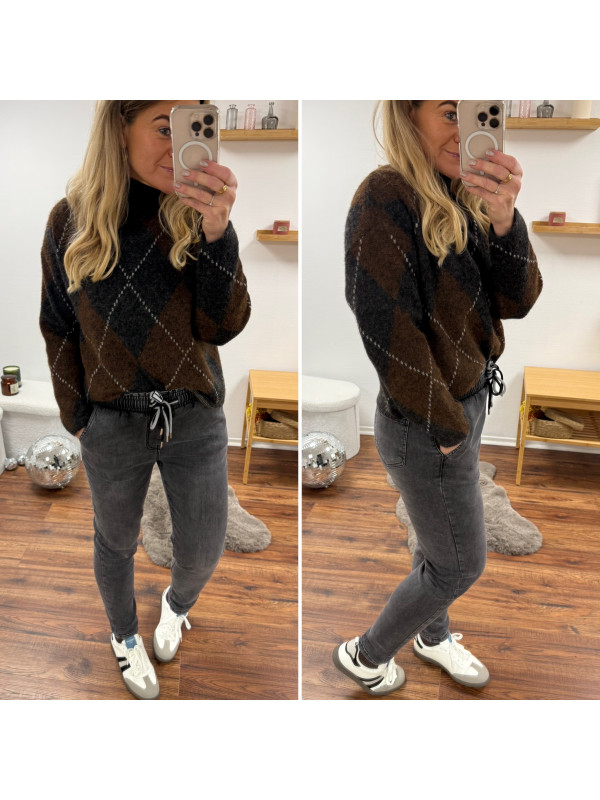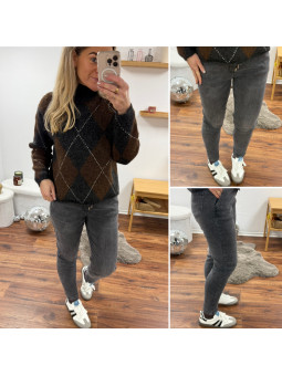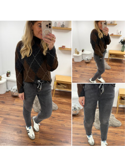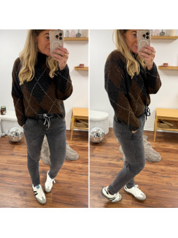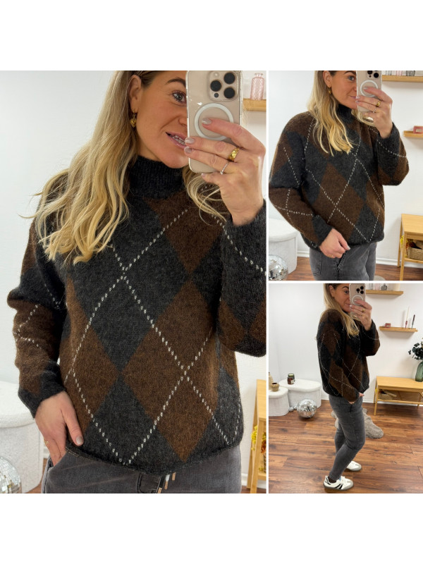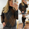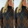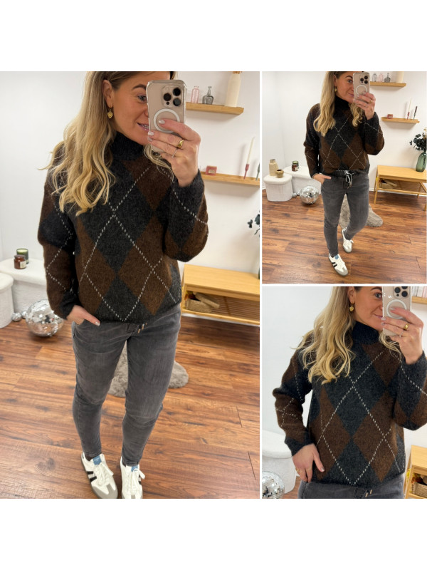 Pull avec col légèrement montant gris anthracite à losanges marrons