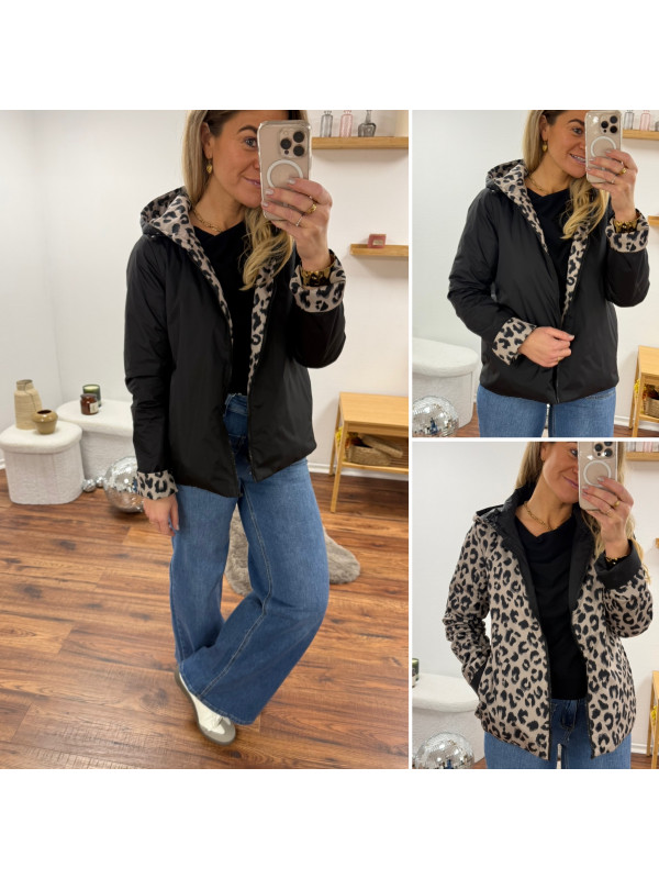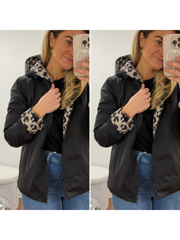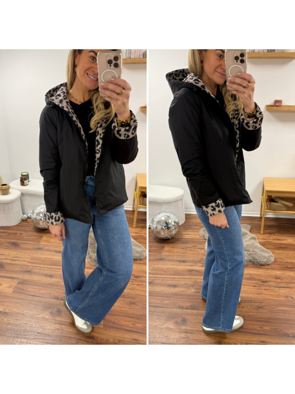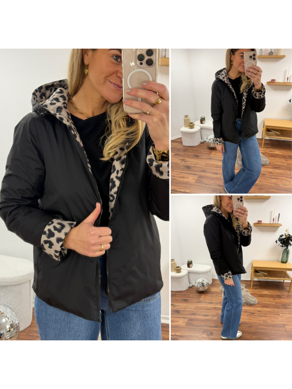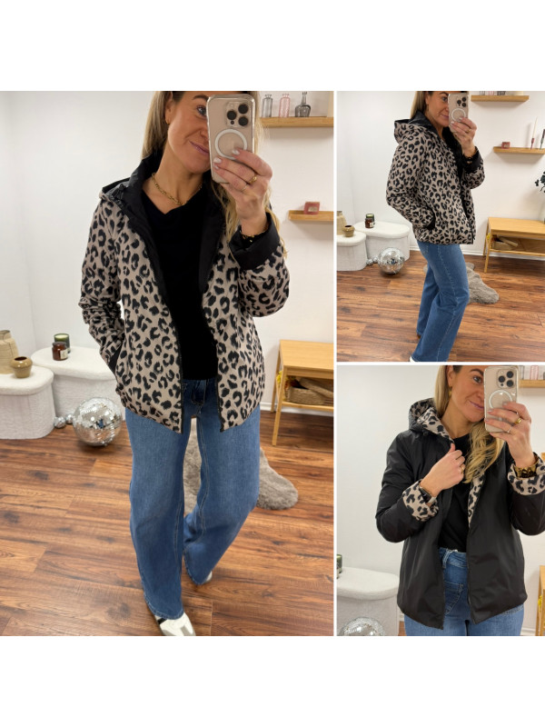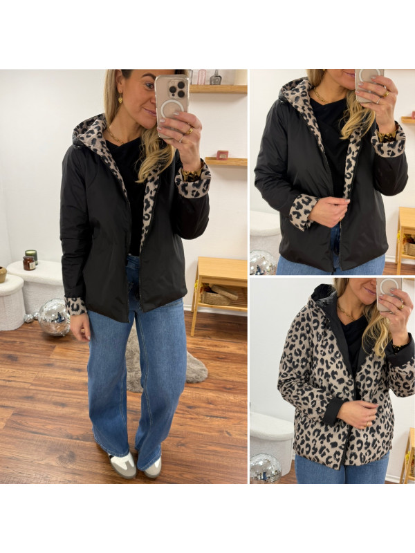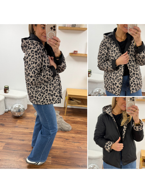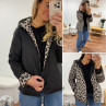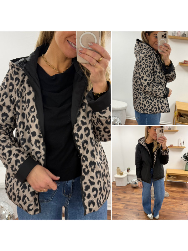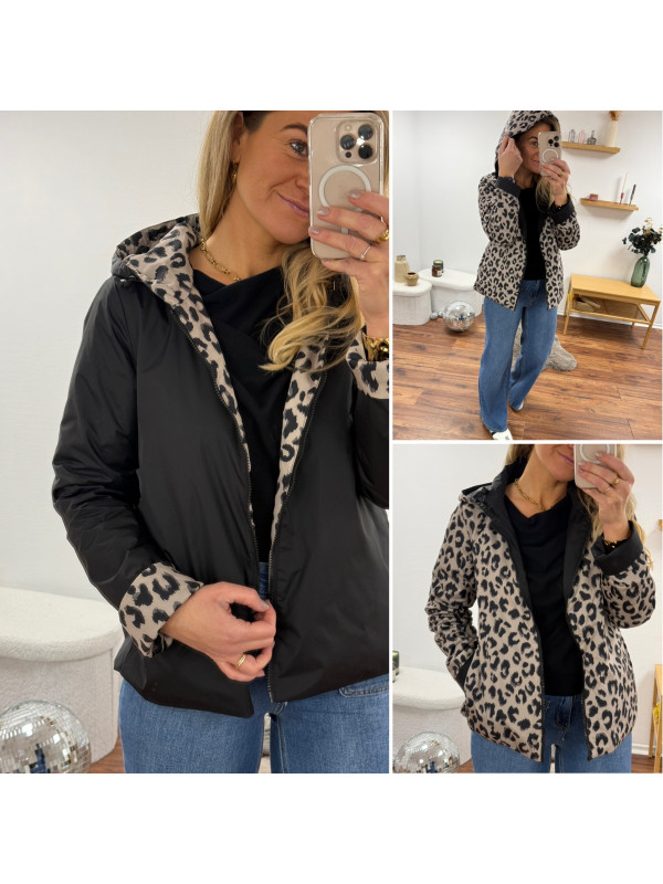 Parka courte réversible avec capuche léopard beige et noir molletonnée parfaite pour la mi saison !