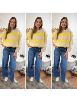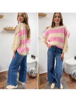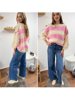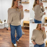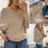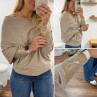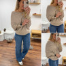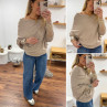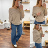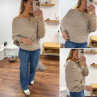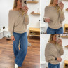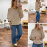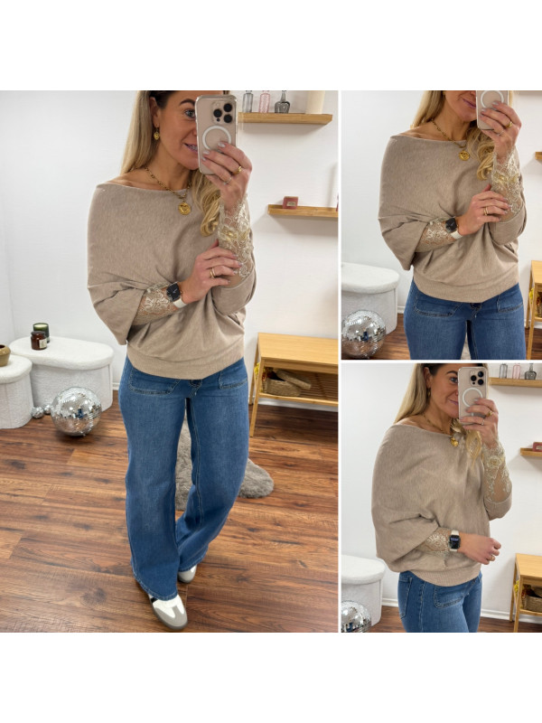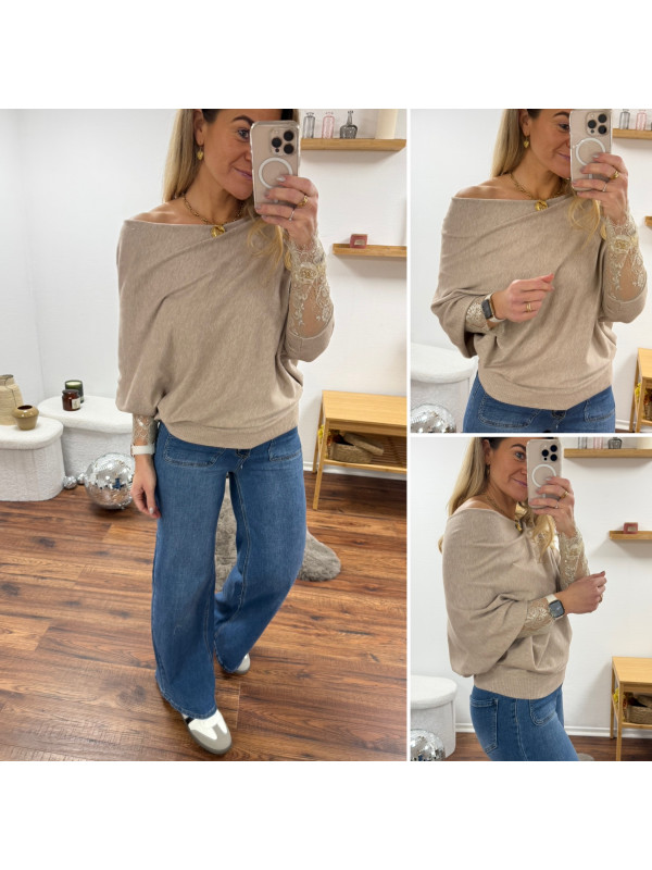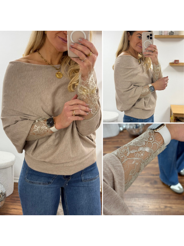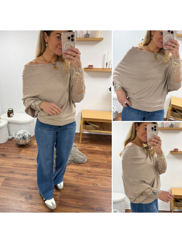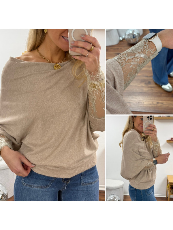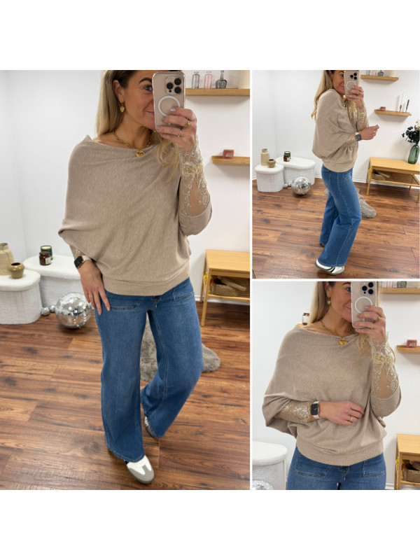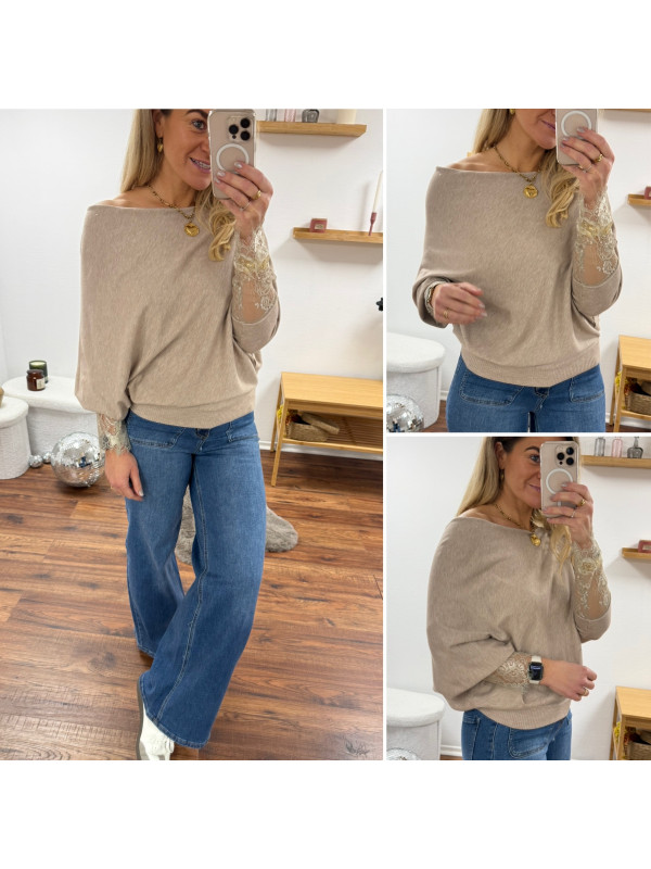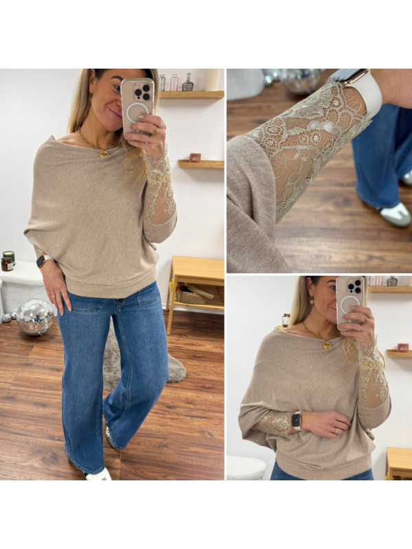 Pull fin beige manches chauve souris et encolure asymétrique avec manches dentelle