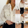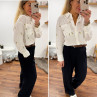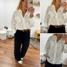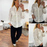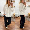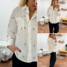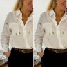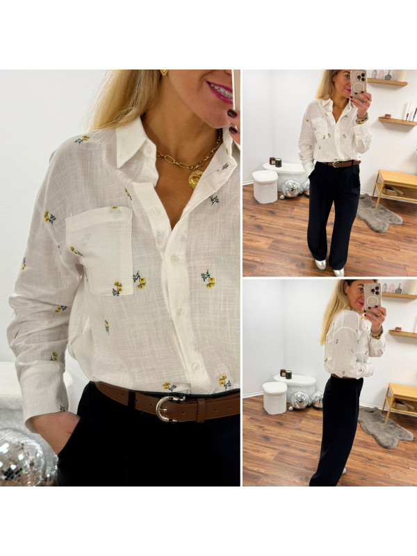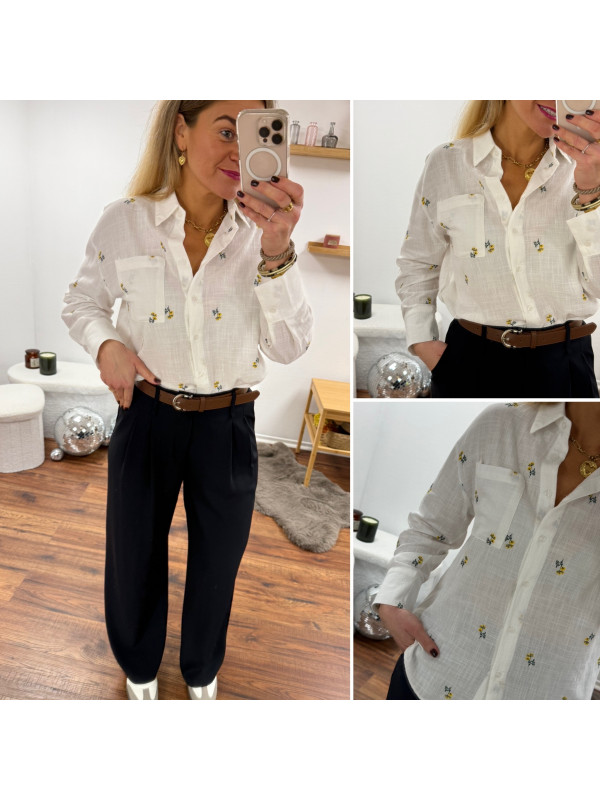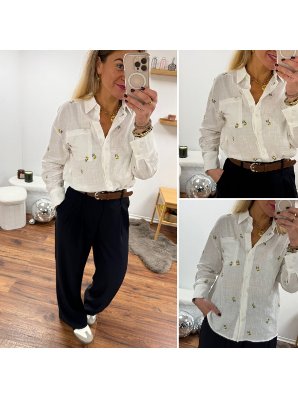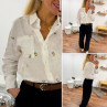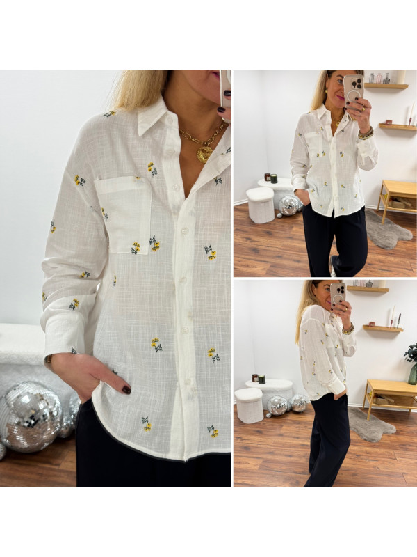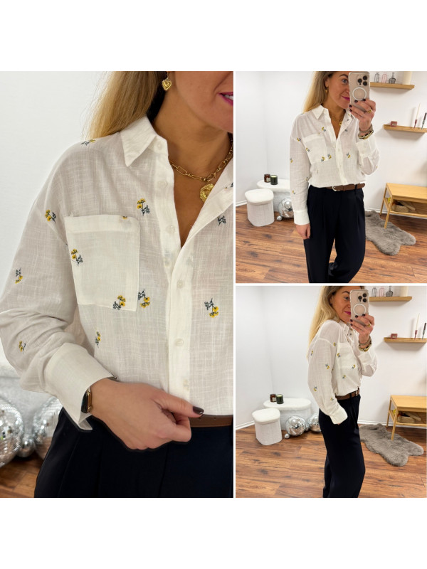 Chemise blanche avec broderies florales vertes et jaune et poche plaquée sur le devant