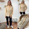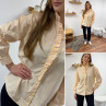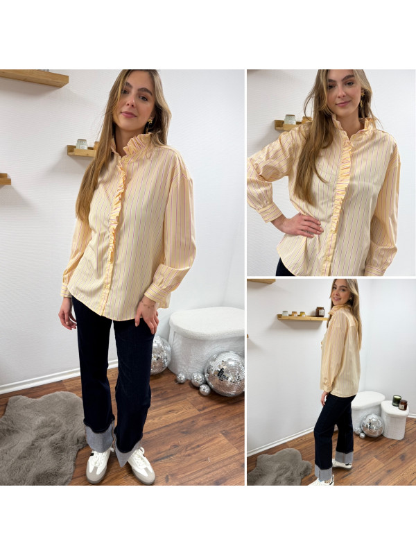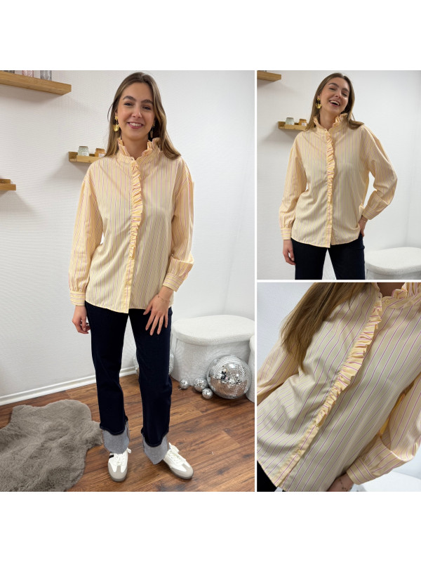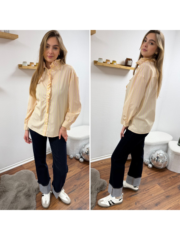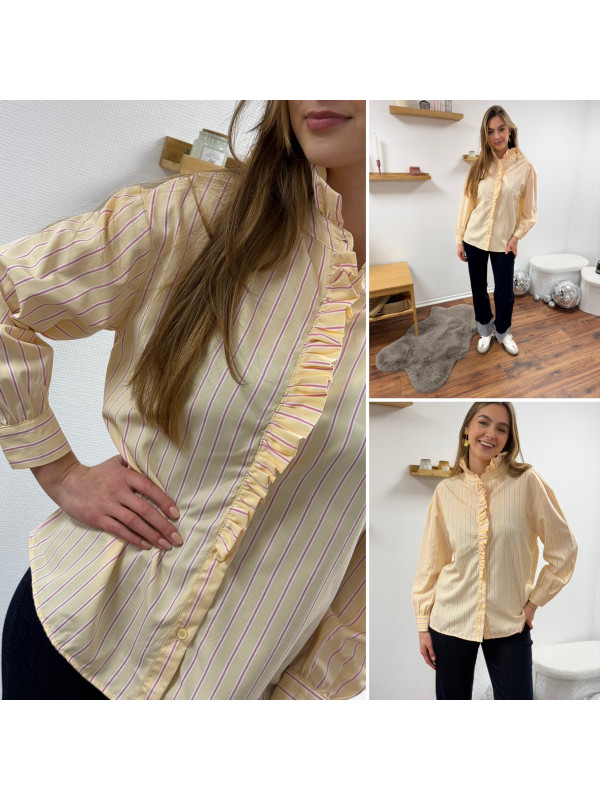 Chemise jaune à rayures rose et blanches avec volants sur le col et la boutonnière