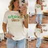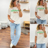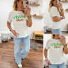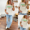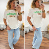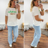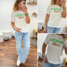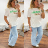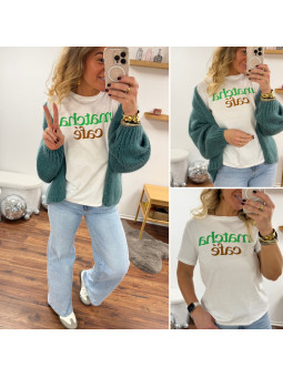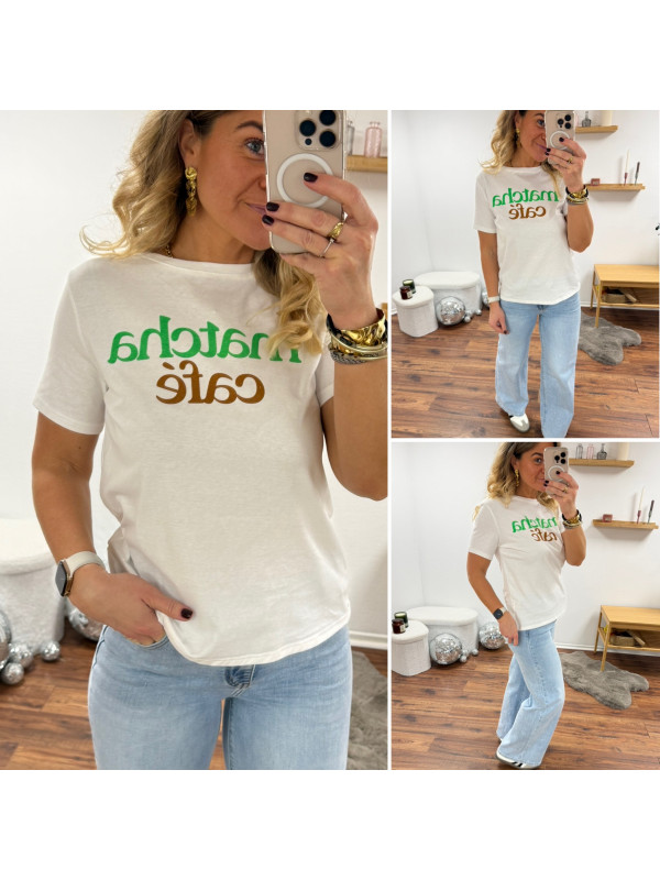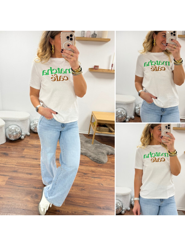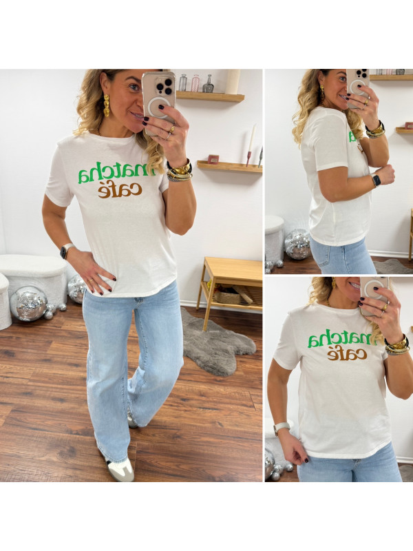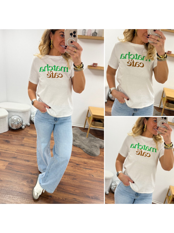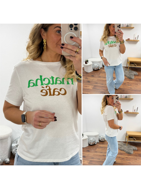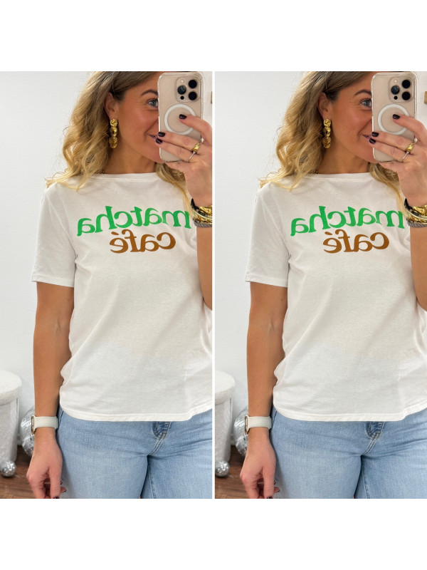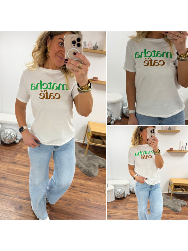 Tee shirt blanc avec écriture matcha café en vert et chocolat