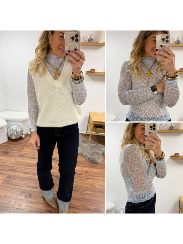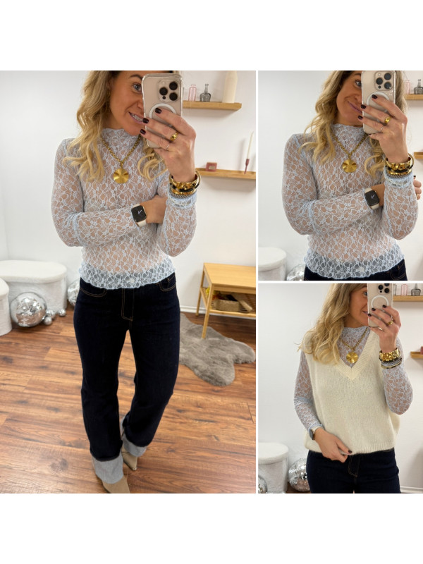 Blouse moulante en dentelle bleue ciel Le SM équivaut au...