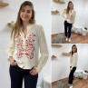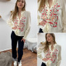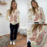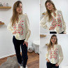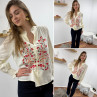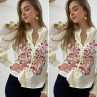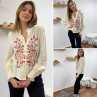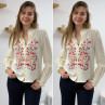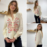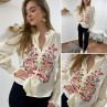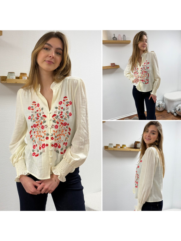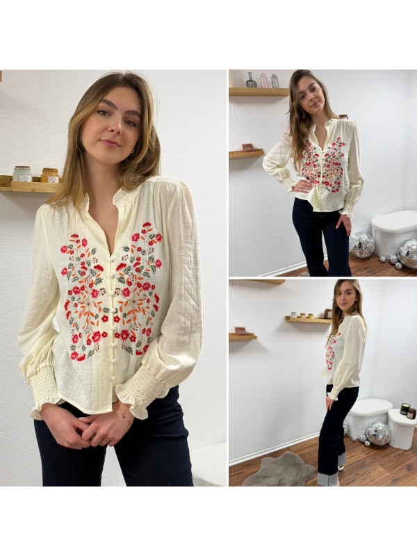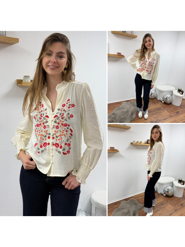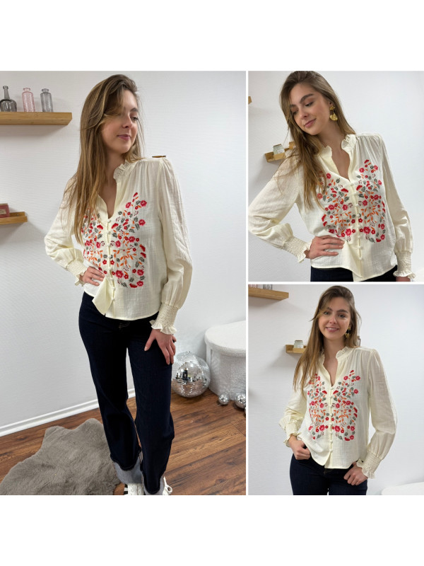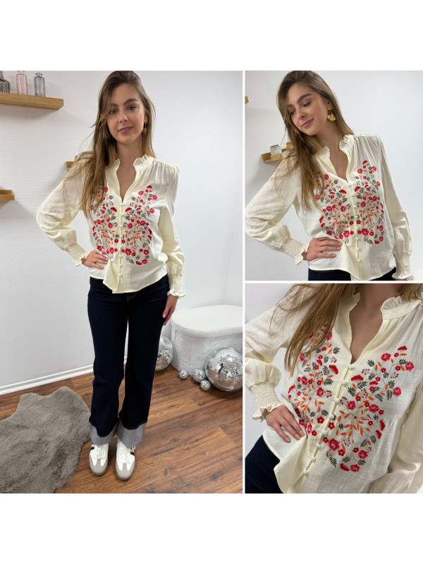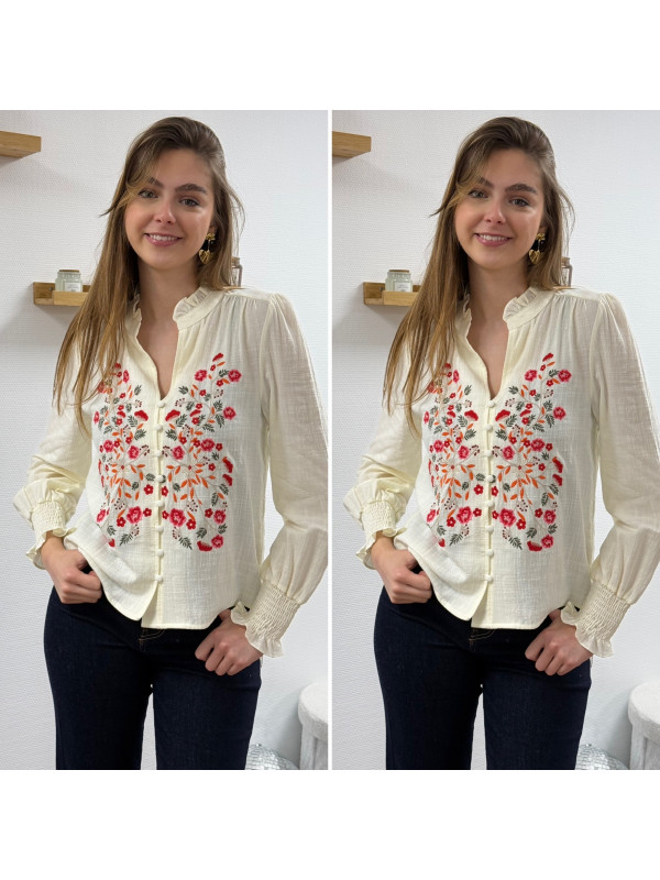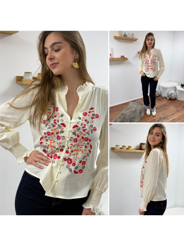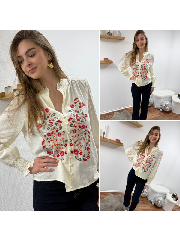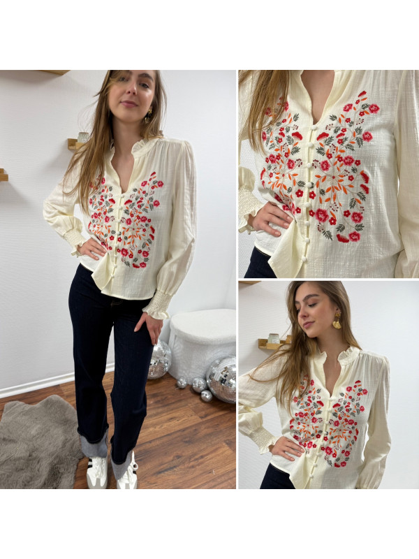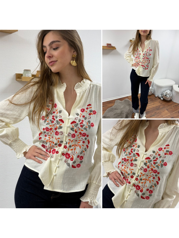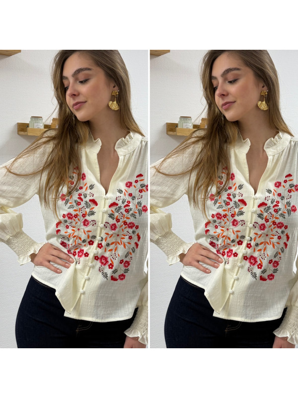Chemise col V avec broderie fleurie colorée et col volant resserrée aux poignets