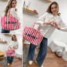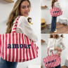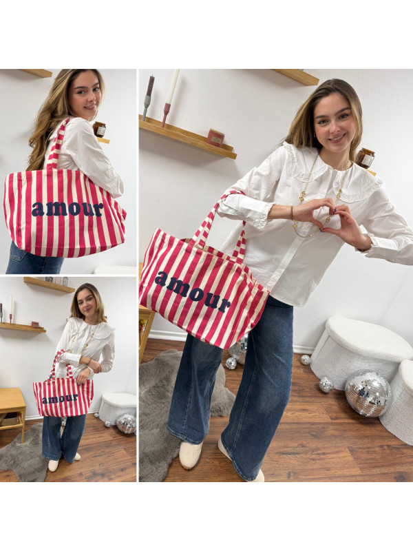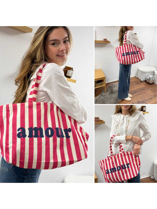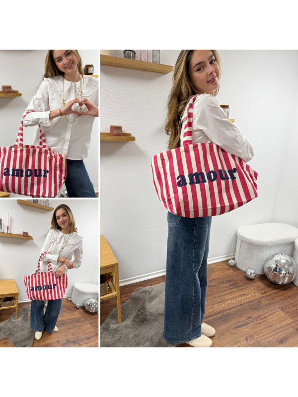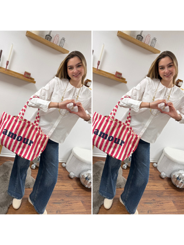 Tote bag en tissu épais à rayures blanches et roses et écriture amour bleu marine