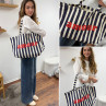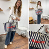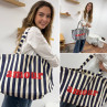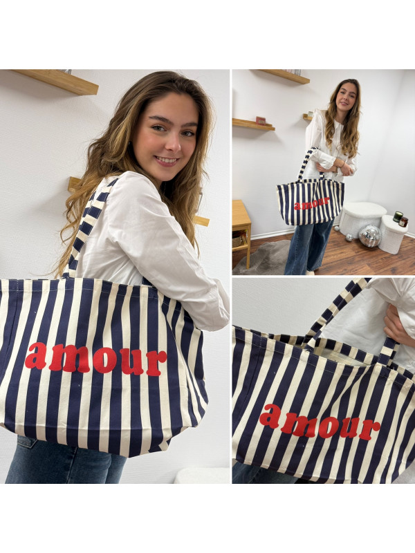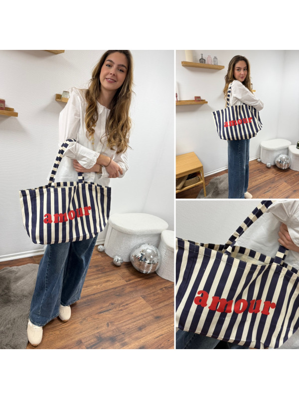 Tote bag en tissu épais à rayures blanches et bleu marine et écriture amour rouge