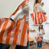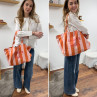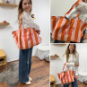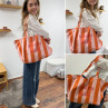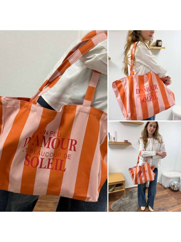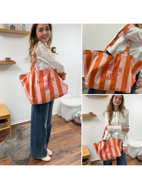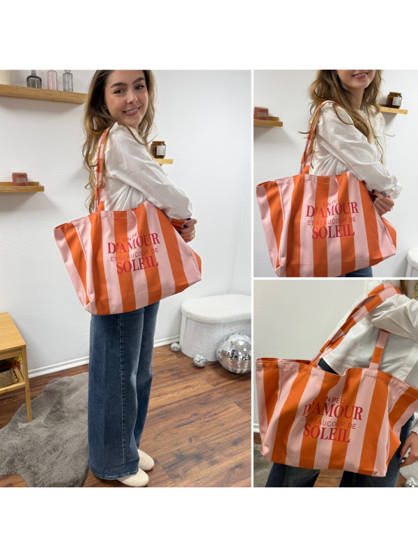 Tote bag en tissu épais à rayures roses et oranges avec écriture "un peu d'amour et beaucoup de soleil" rouge