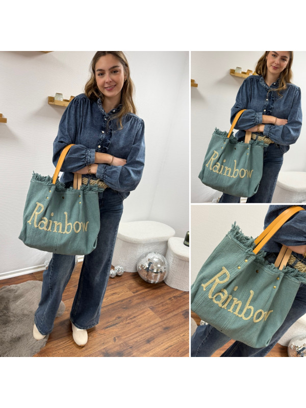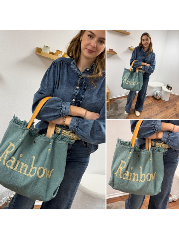 Sac cabas à franges vert d'eau avec écriture Rainbow doré (uniquement dispo en boutique)