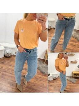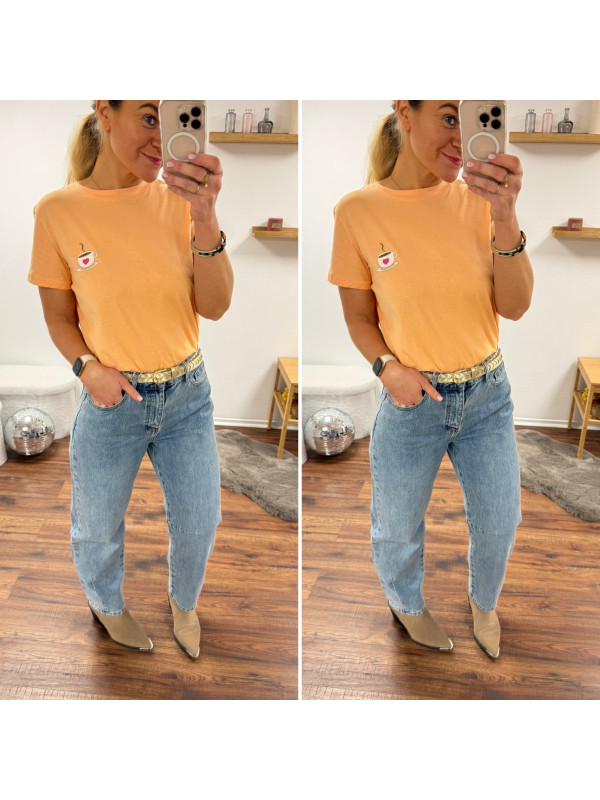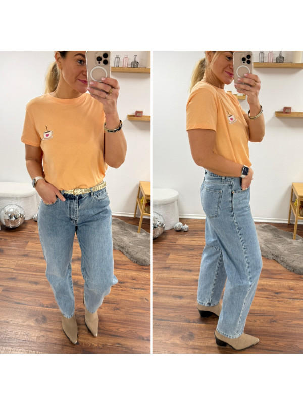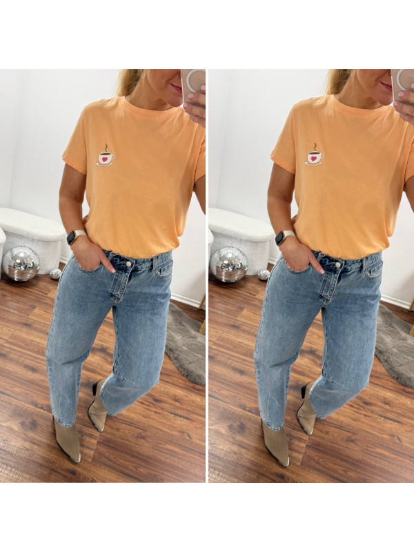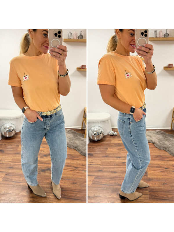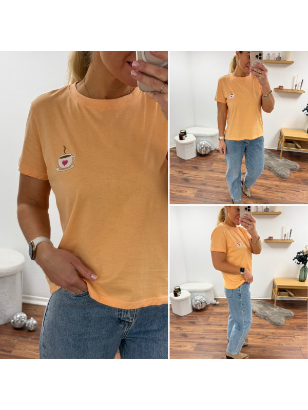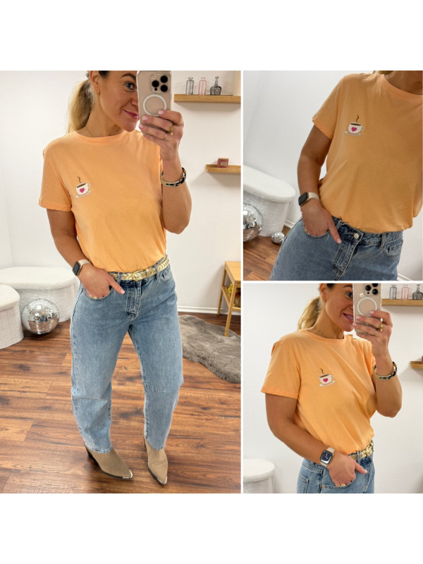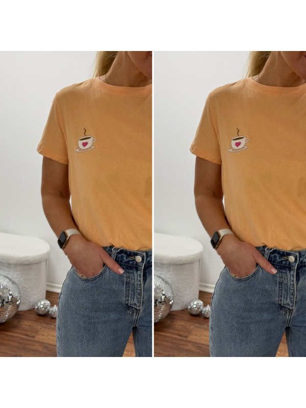 Tee shirt orange avec une tasse à café et un petit coeur