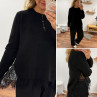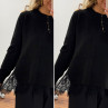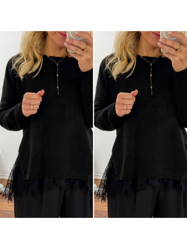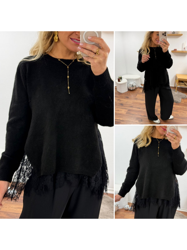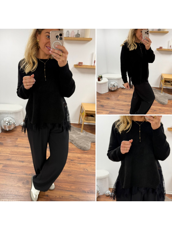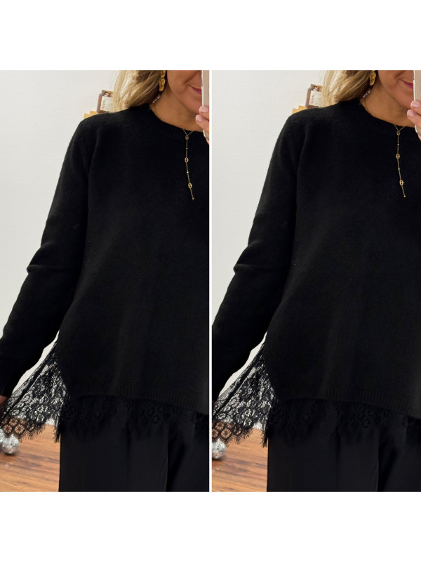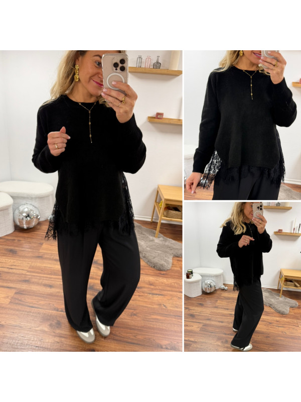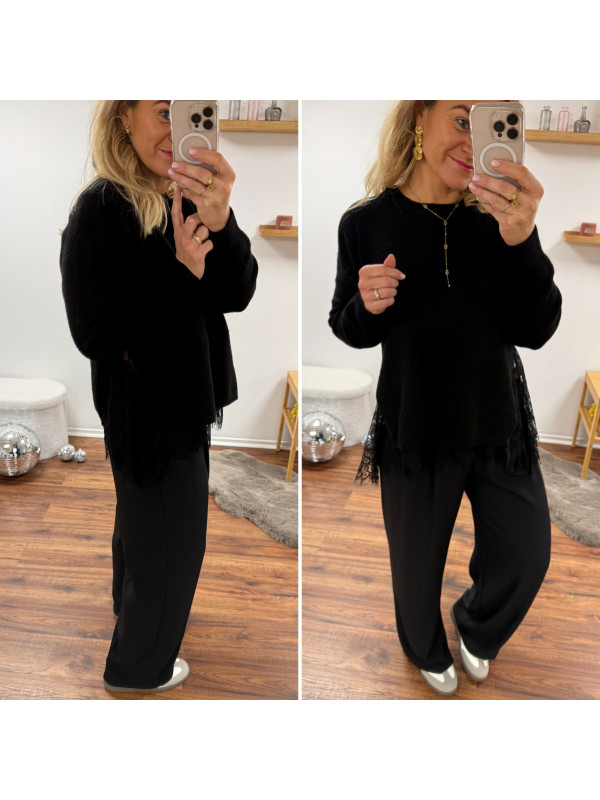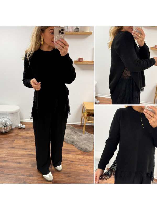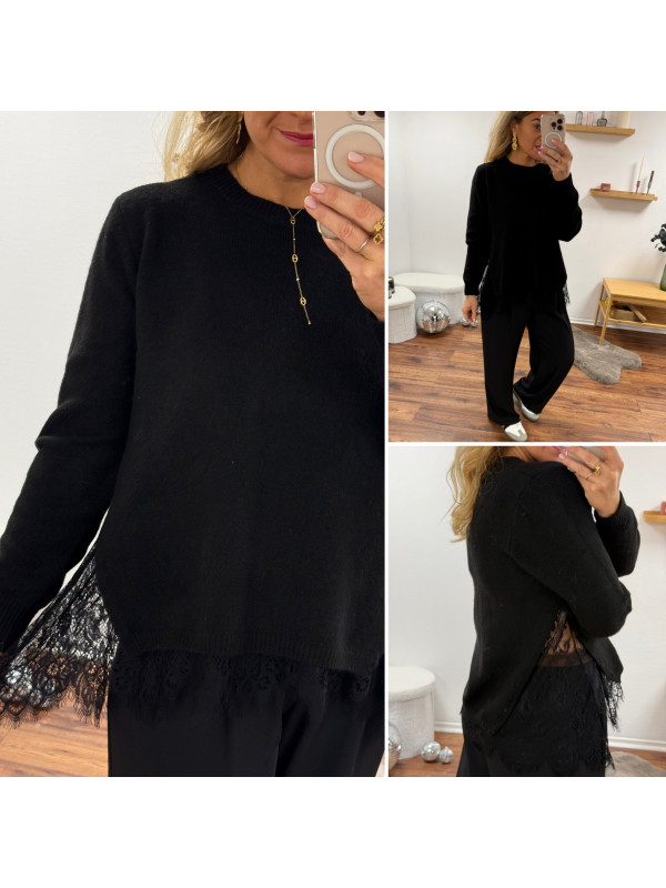 Pull noir avec de la dentelle dans le bas et ouverture en dentelle sur les côtés