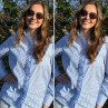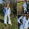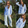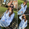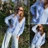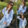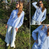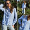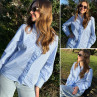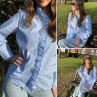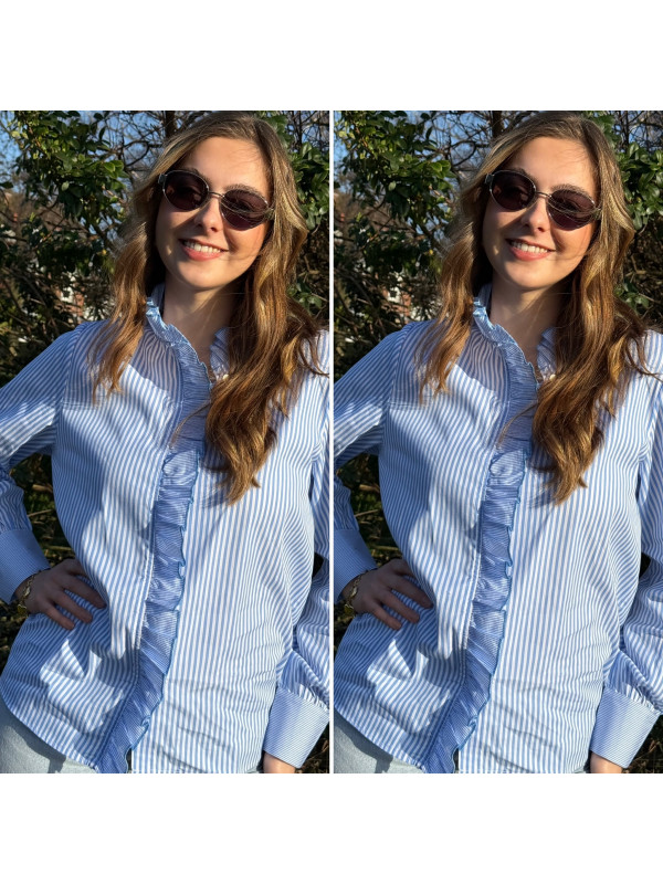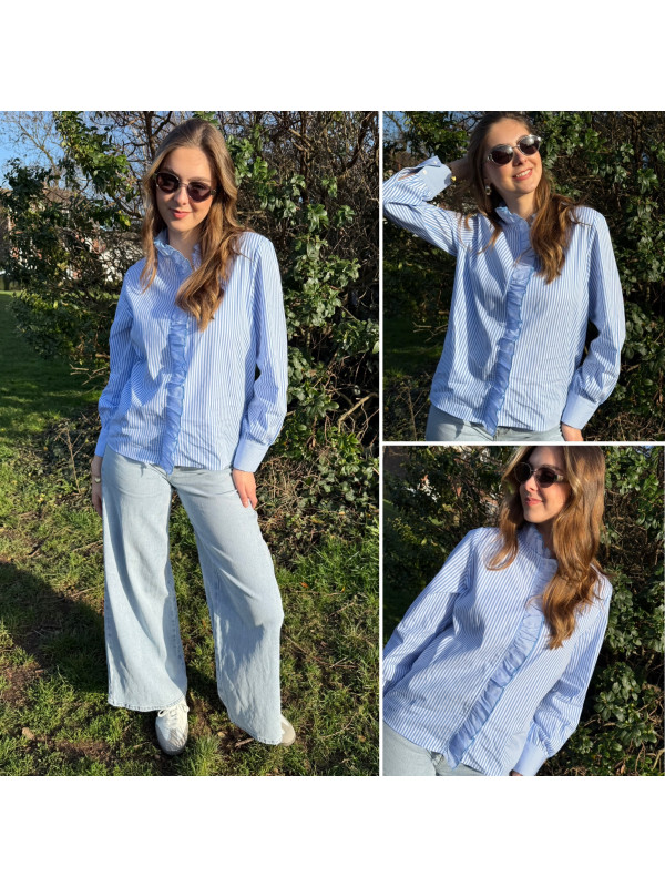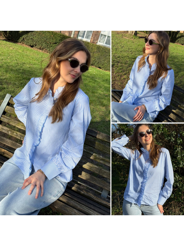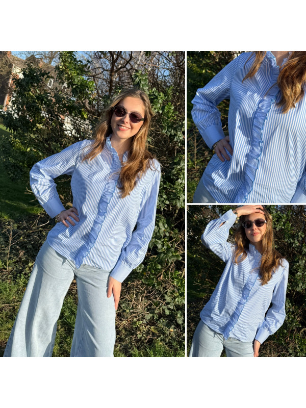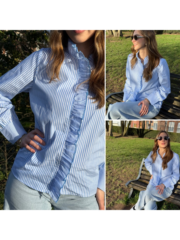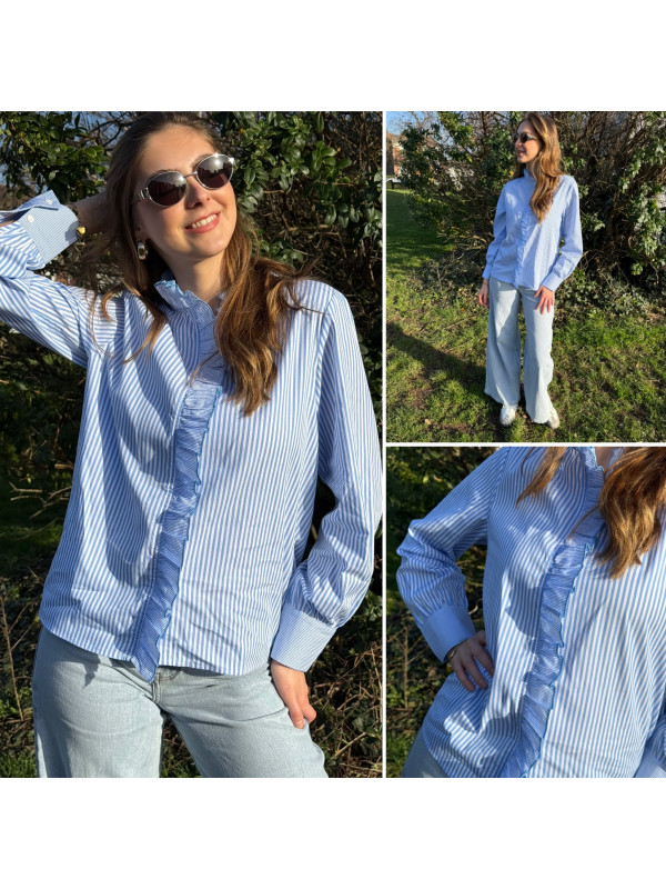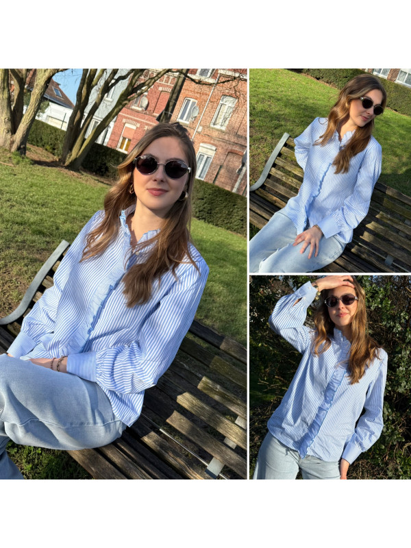 Chemise rayée bleus et blanches avec 2 sortes de rayures et volants sur le col et la boutonnière
