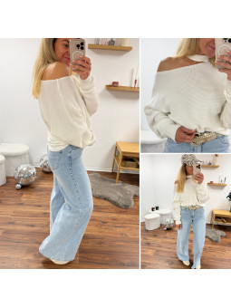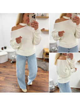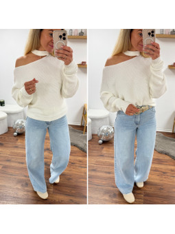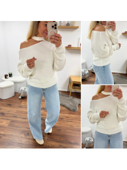 Pull nid d'abeille blanc avec ouverture asymétrique sur le...