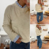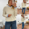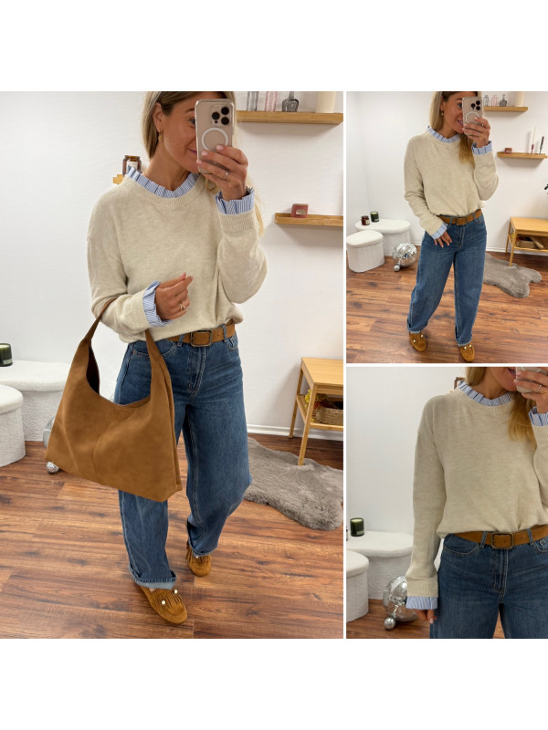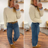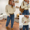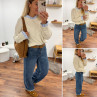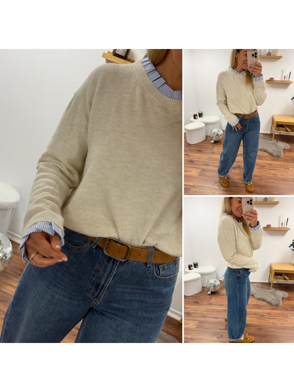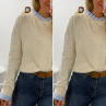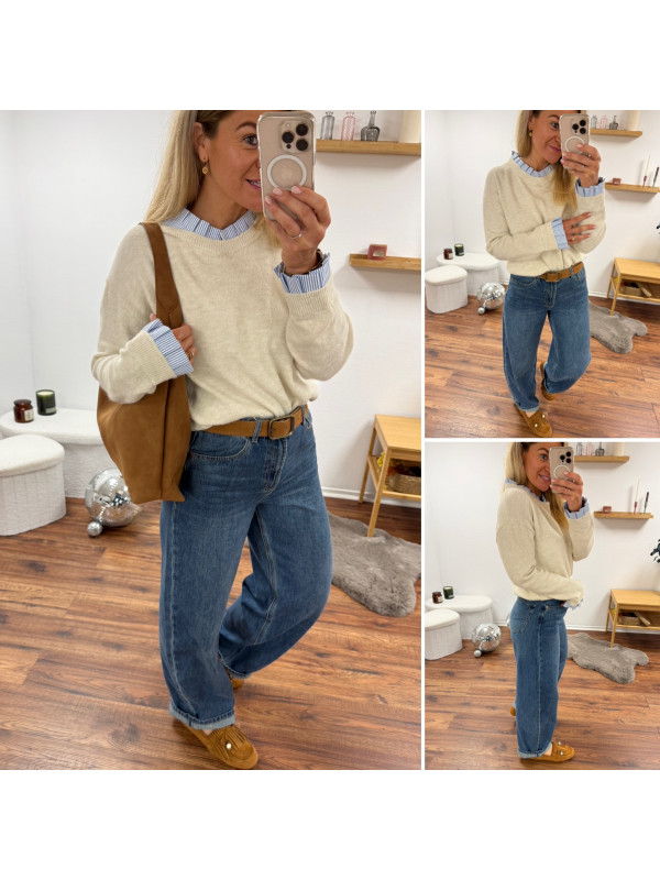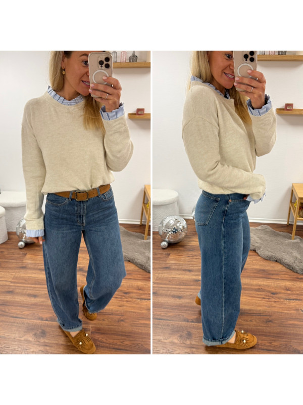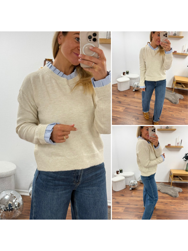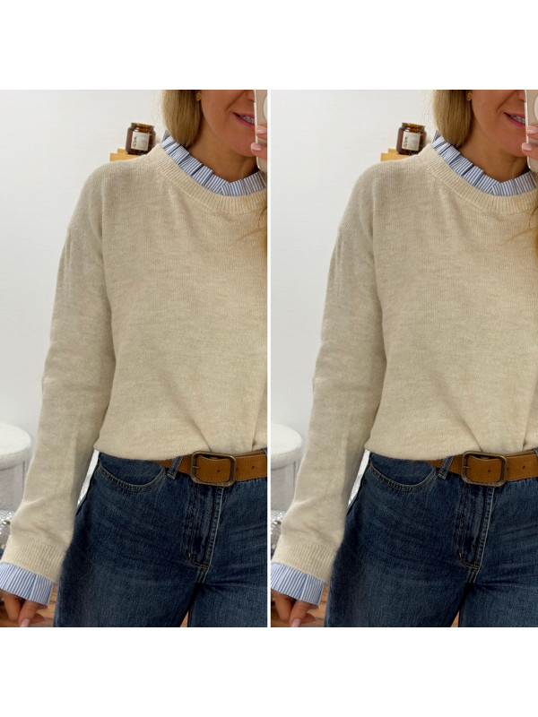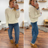 Pull écru avec col et poignets rayées blancs et bleus