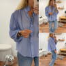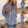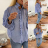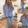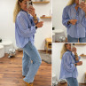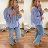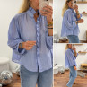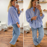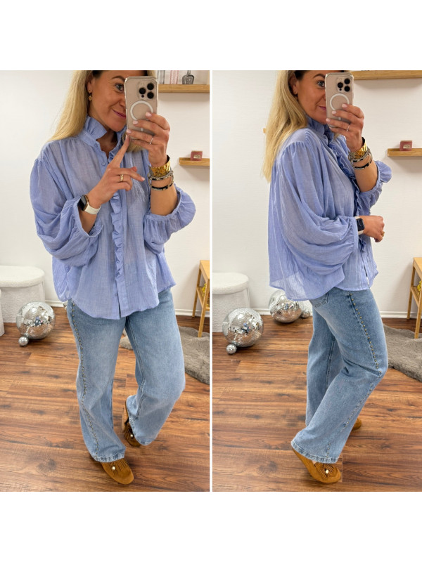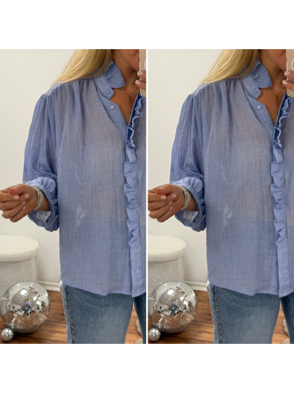 Chemise bleue en voile fluide vaporeuse avec manches évasées et volants sur le col et la boutonnière