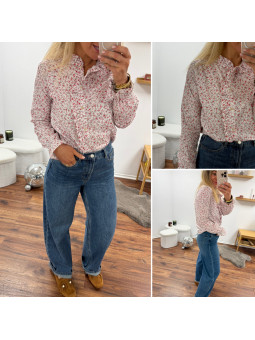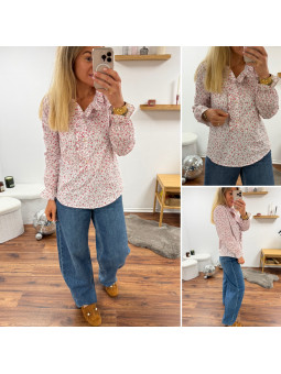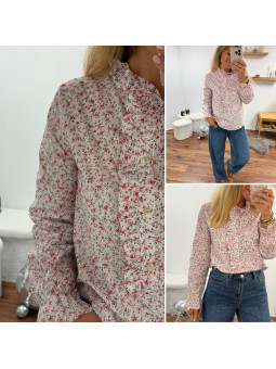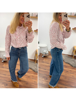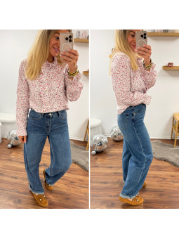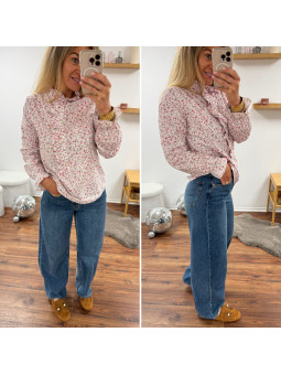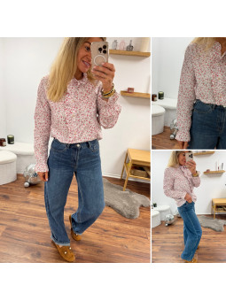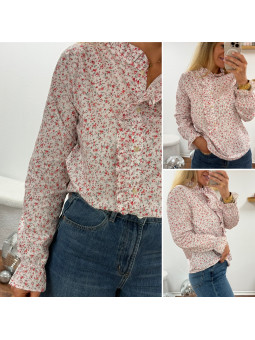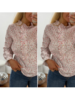 Blouse blanche avec motif fleurie rouge et vert et volants sur...