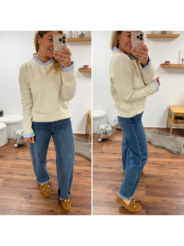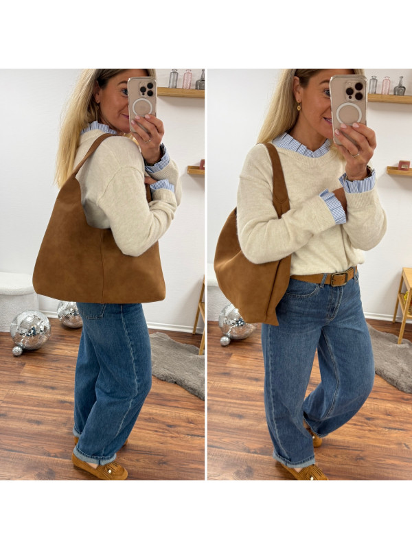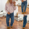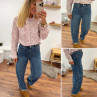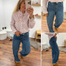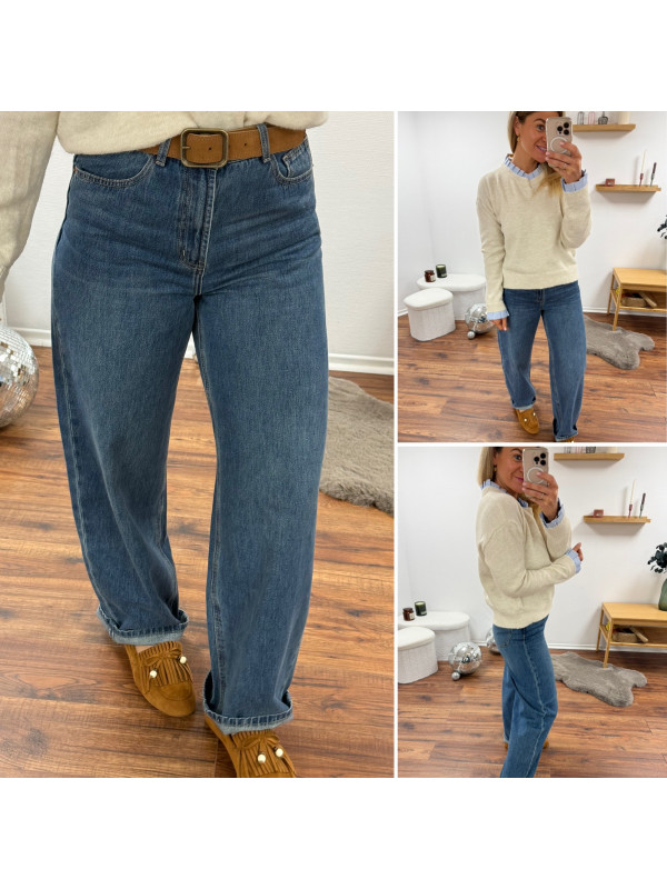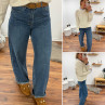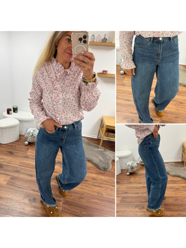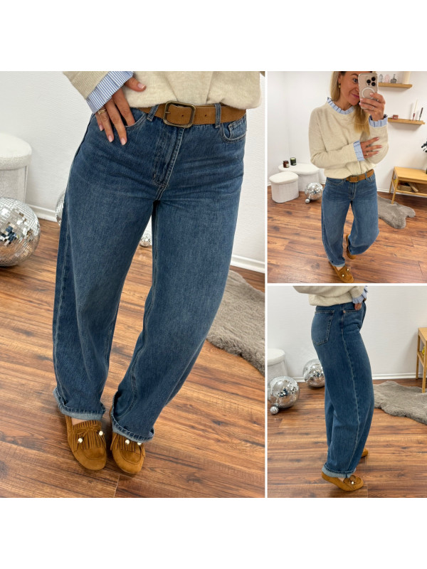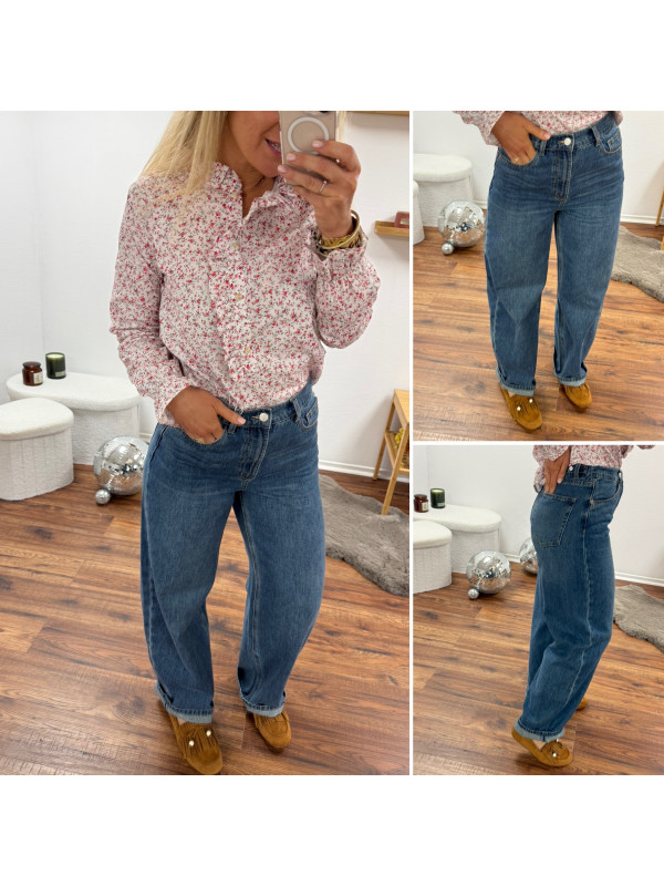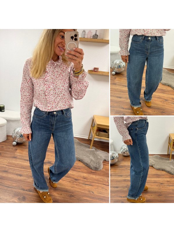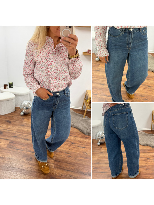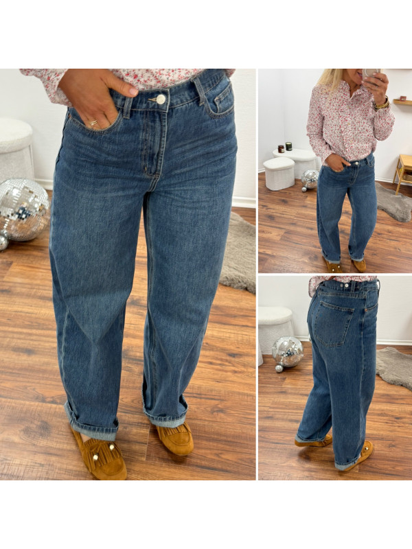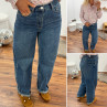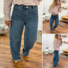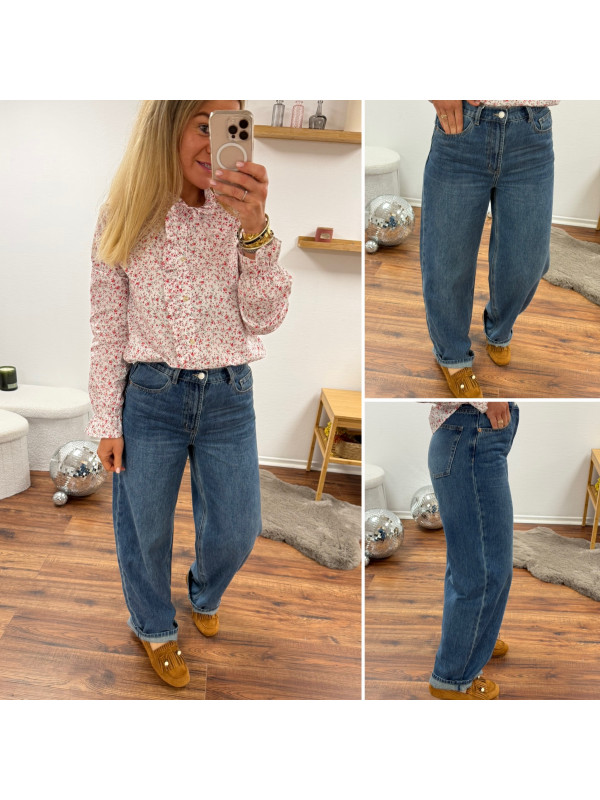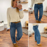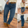 Jean ballon bleu denim avec petites pinces dans le dos sur la ceinture