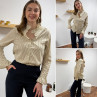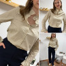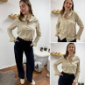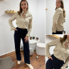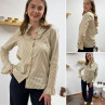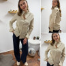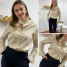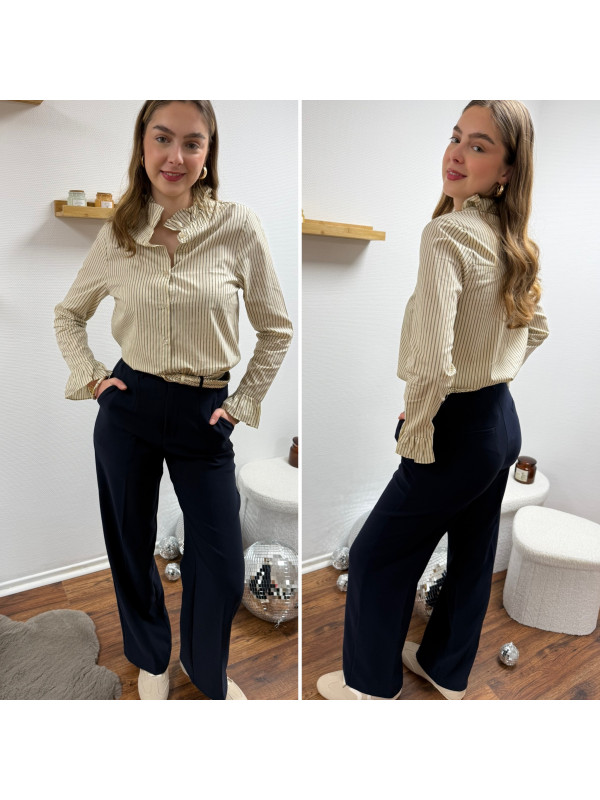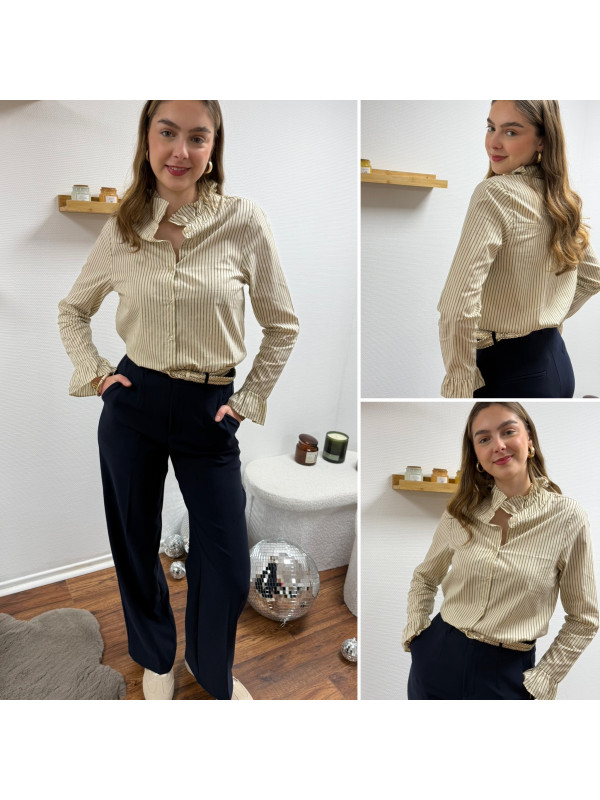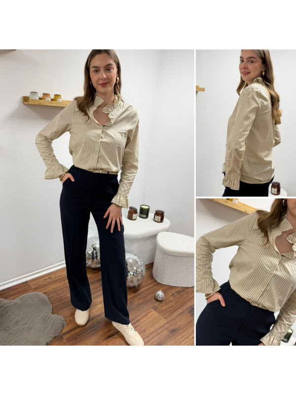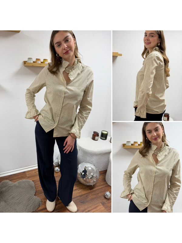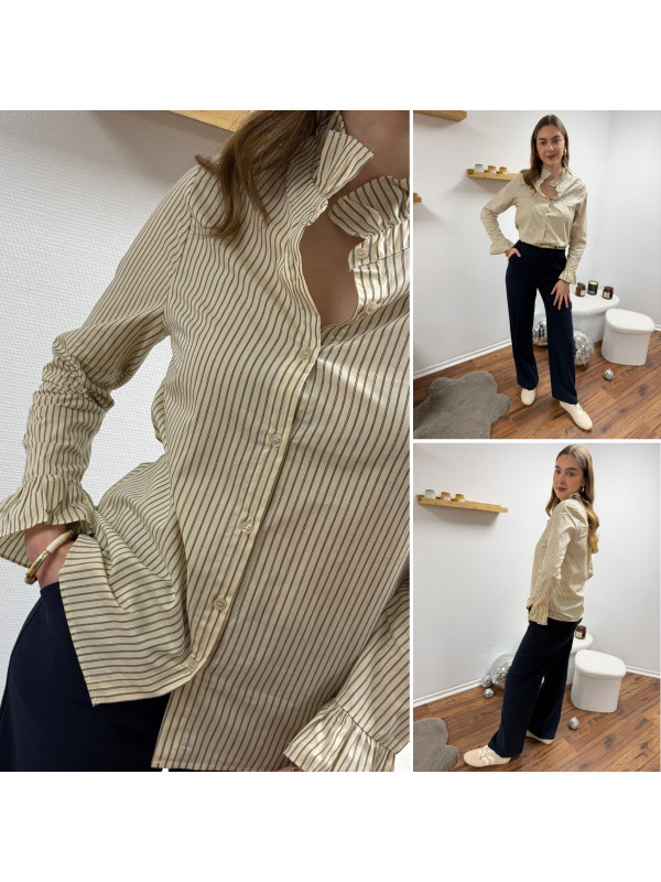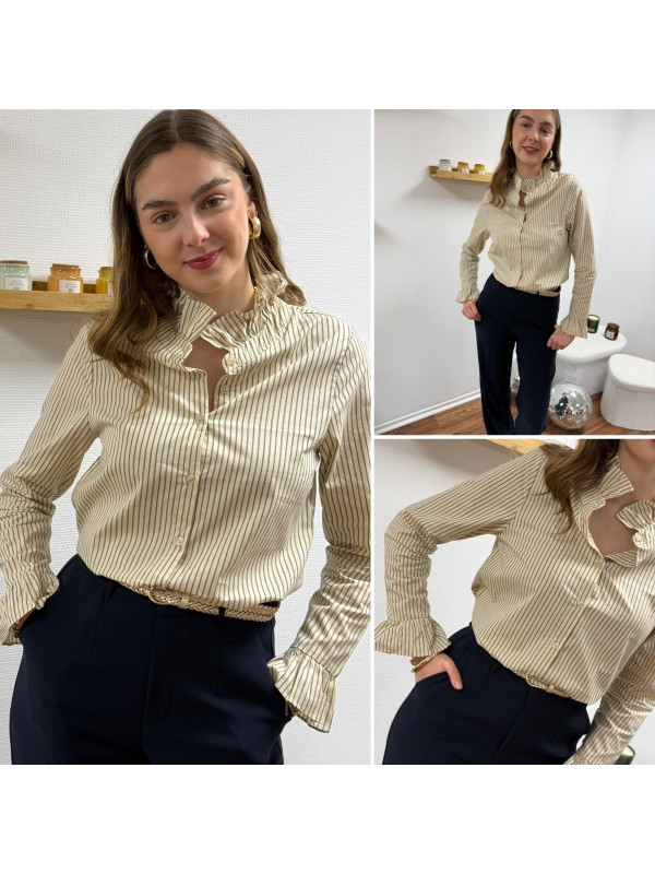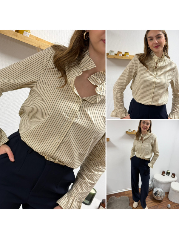 Chemise écrue à rayures grises et taupes avec col volant