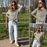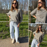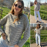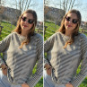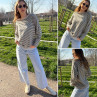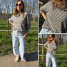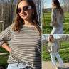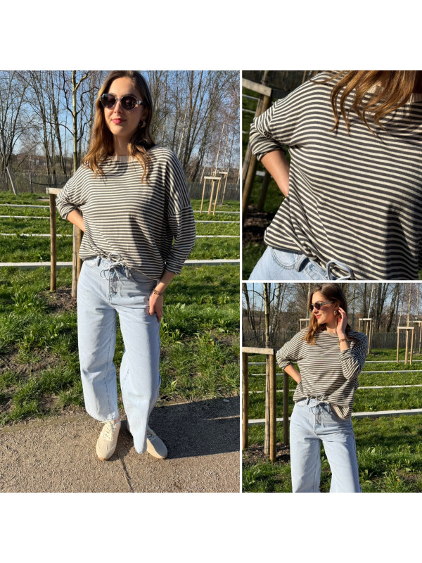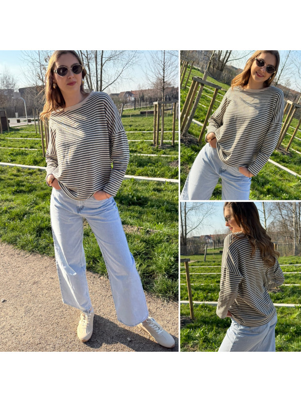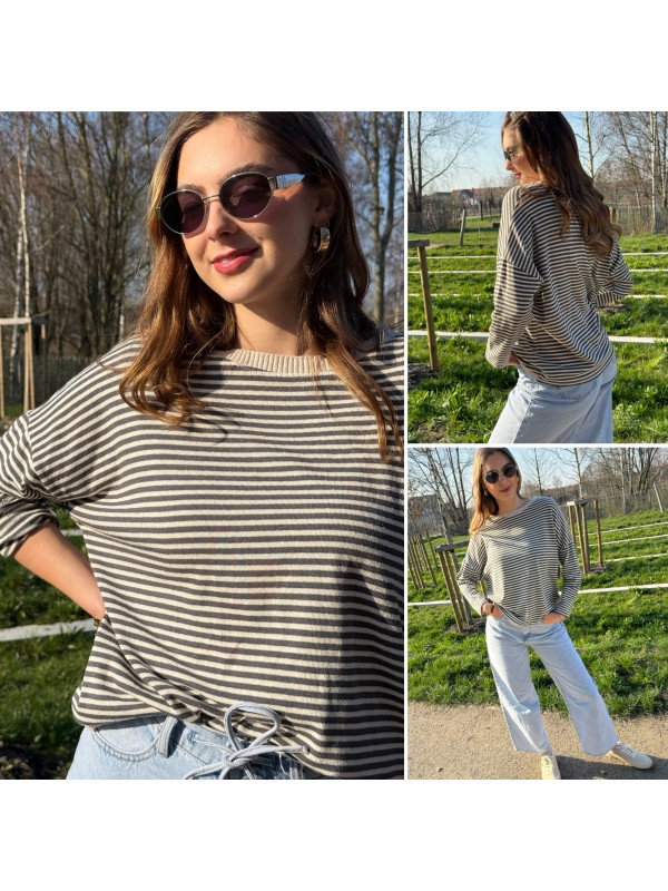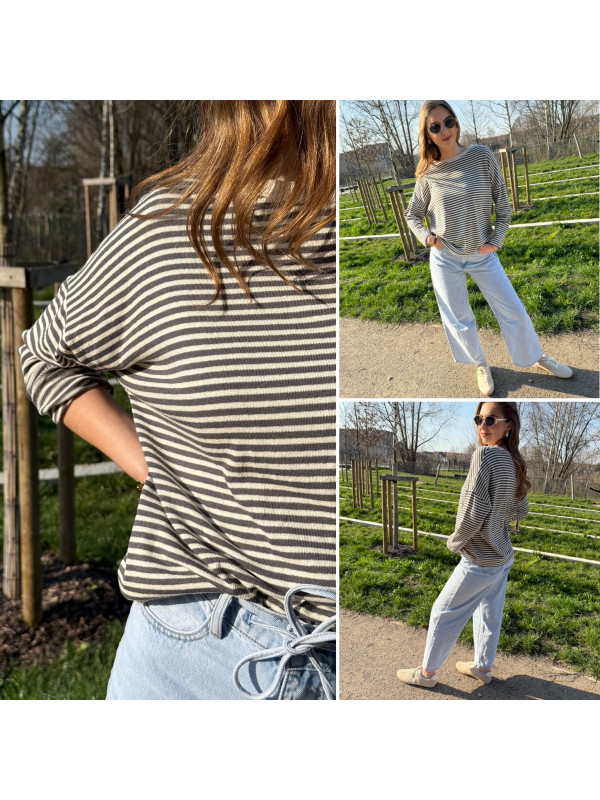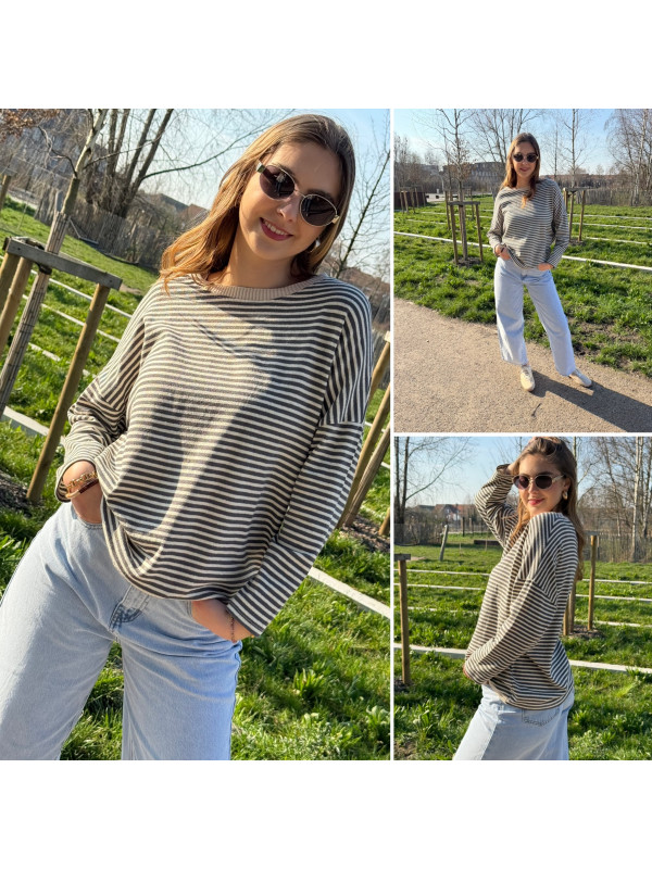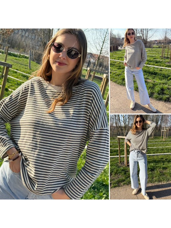 Pull fin à manches longues marinière rayé gris foncé et beige