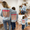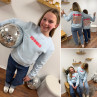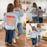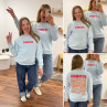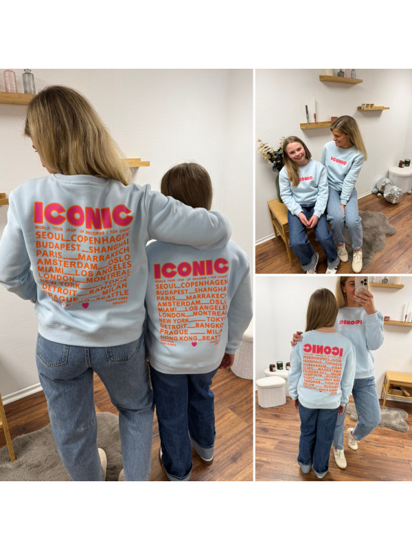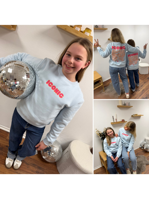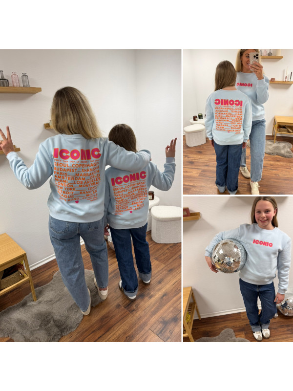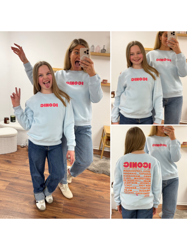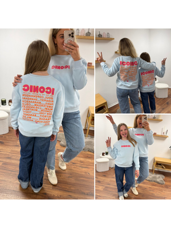 Sweat bleu ciel iconic avec écritures roses et oranges fluo dans le dos