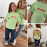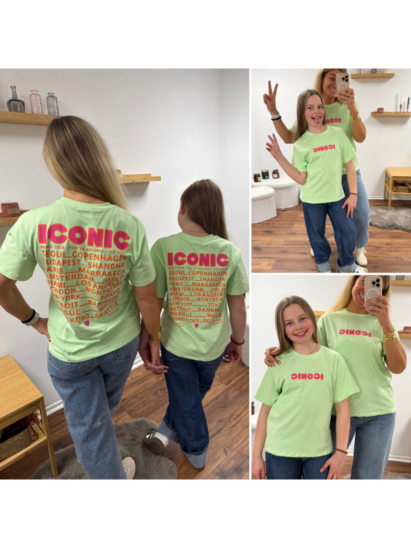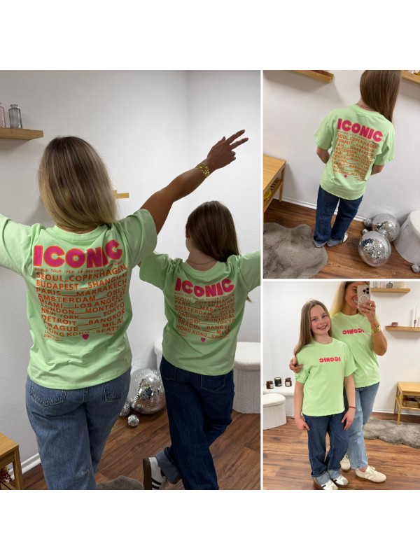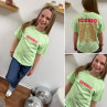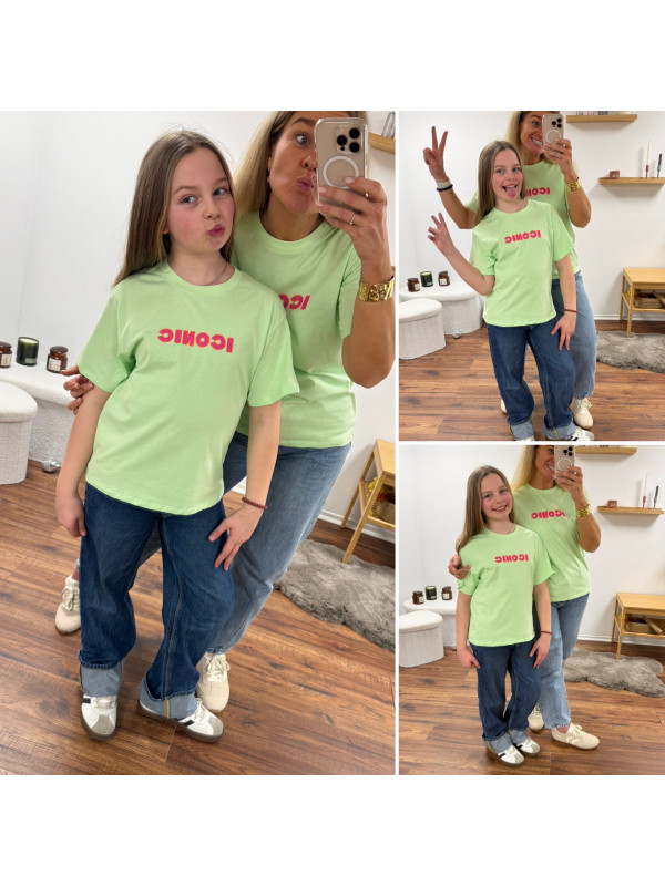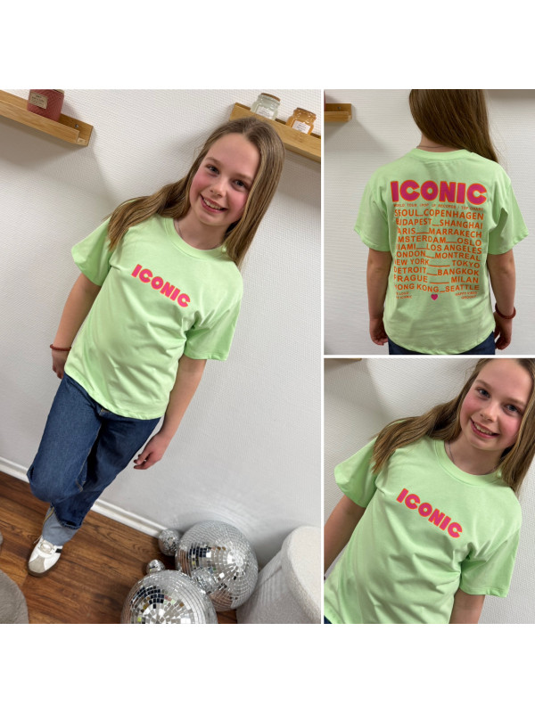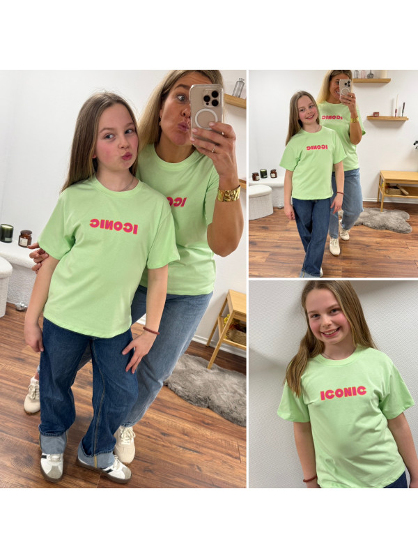 Tee shirt vert amande iconic avec écritures roses et oranges fluo dans le dos (enfant)