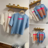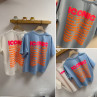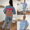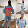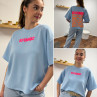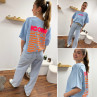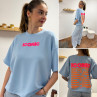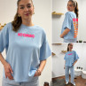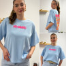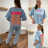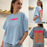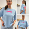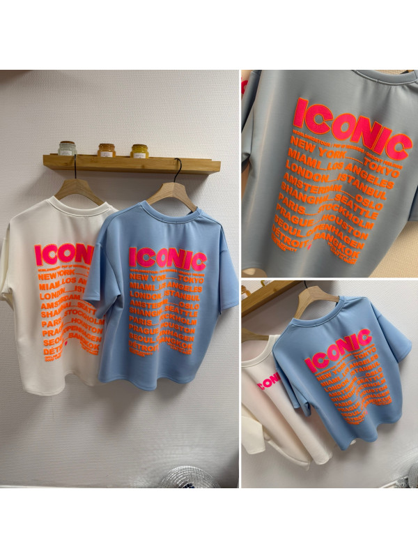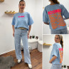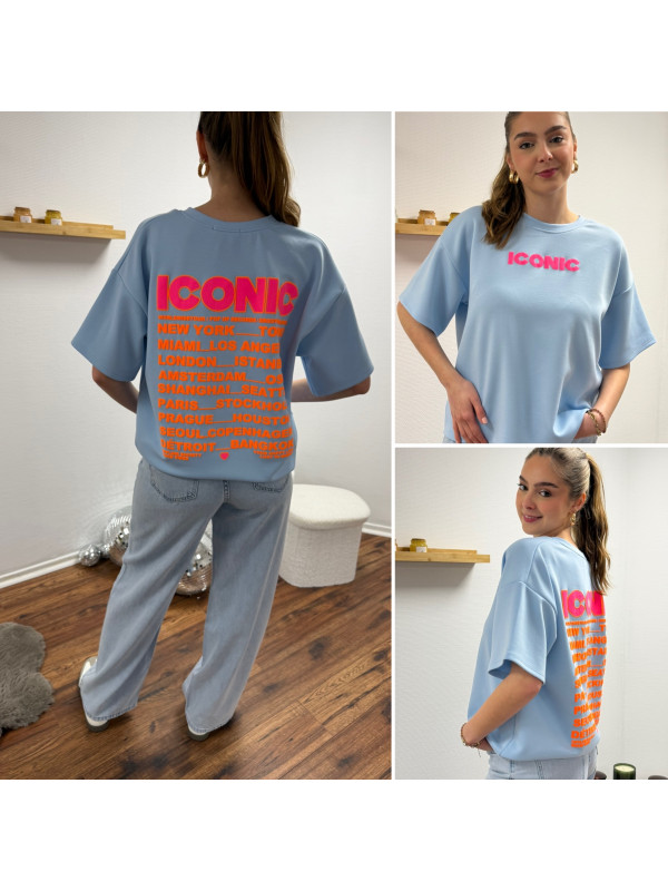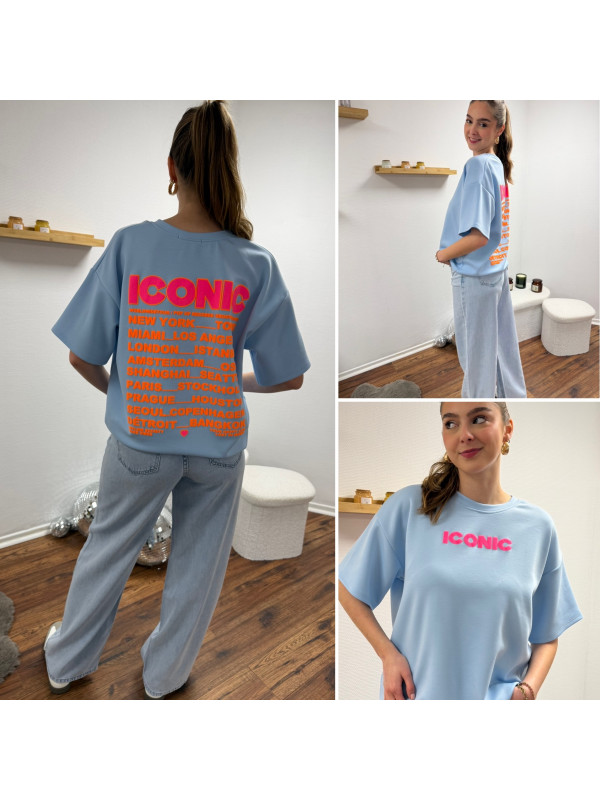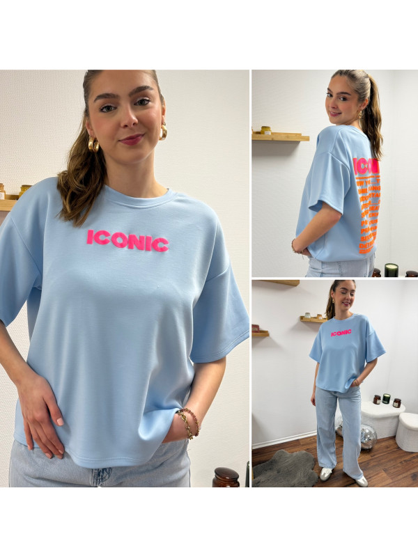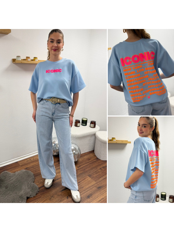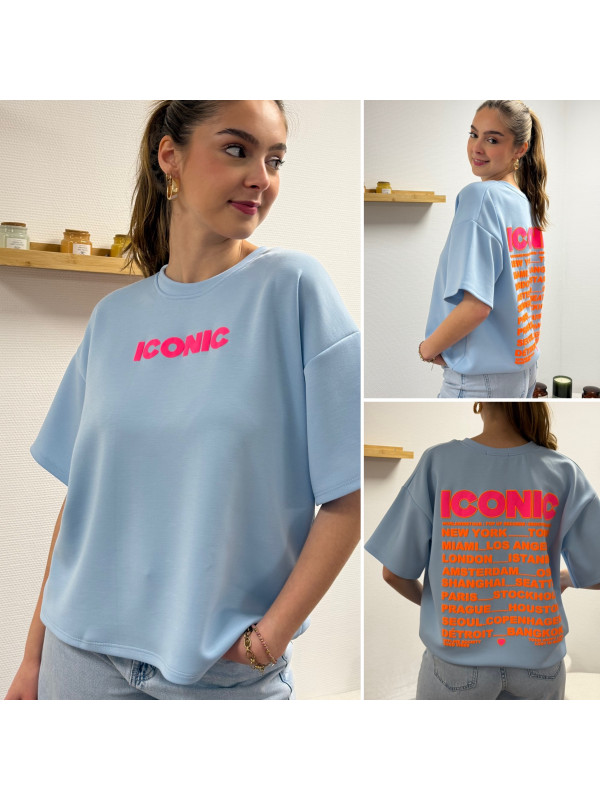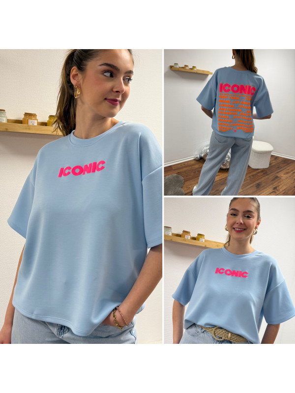 Tee shirt façon sweat fin bleu ciel iconic avec écritures oranges et roses fluo dans le dos