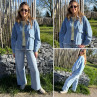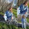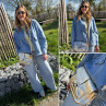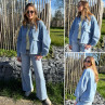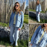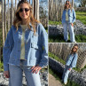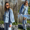 Veste en jean bleu clair avec poches plaquées sur le devant, lien à la taille et bas effiloché