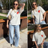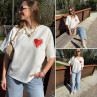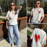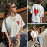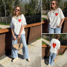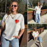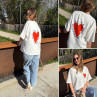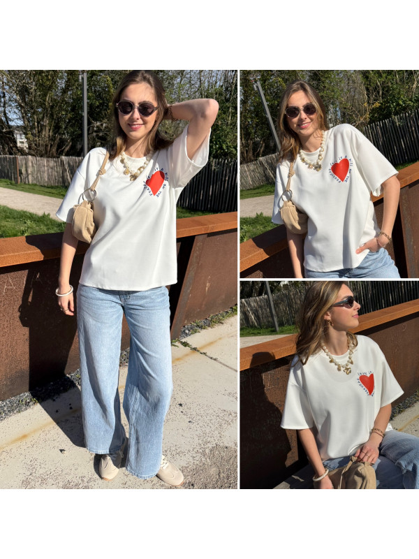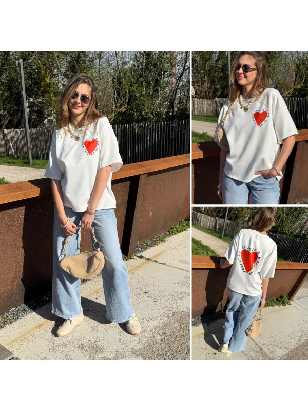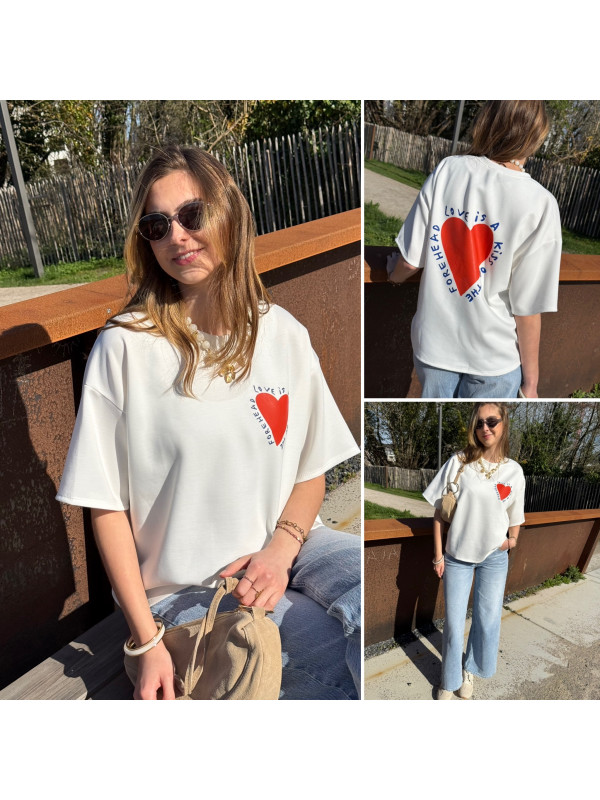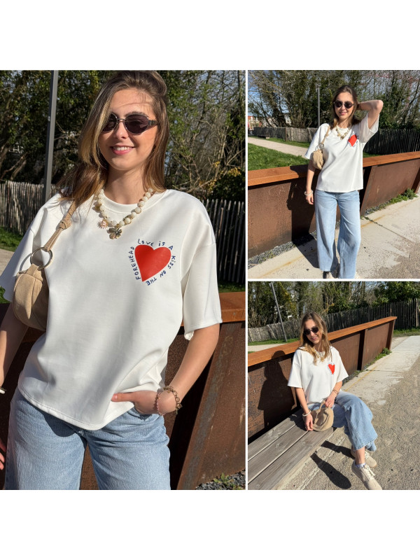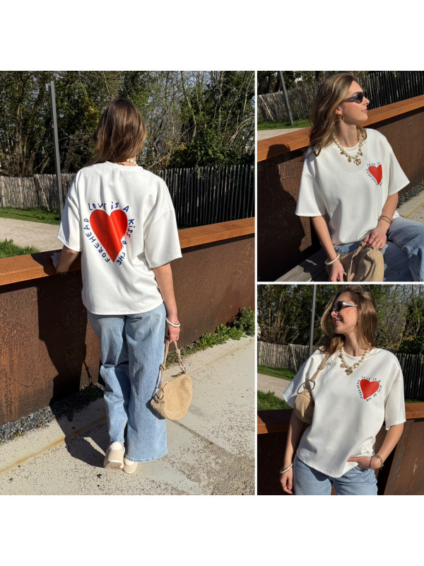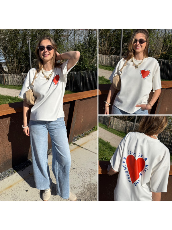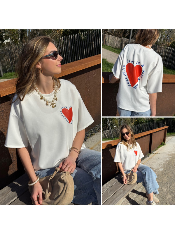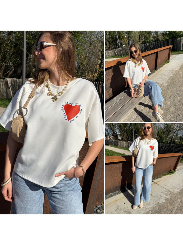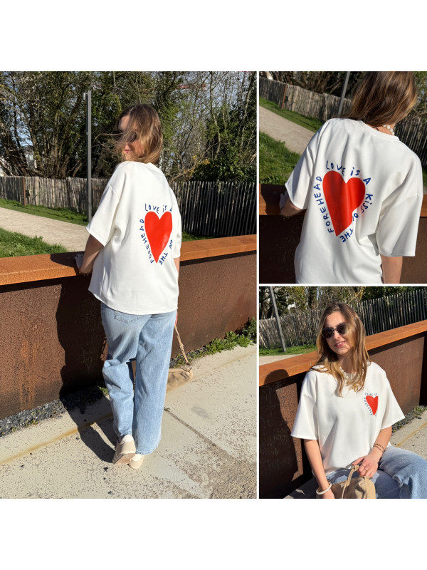 Tee shirt façon sweat fin blanc avec coeur rouge et écritures bleu marine "Love is a kiss on the forehead"