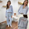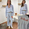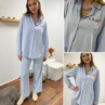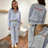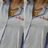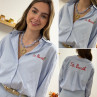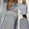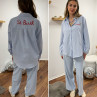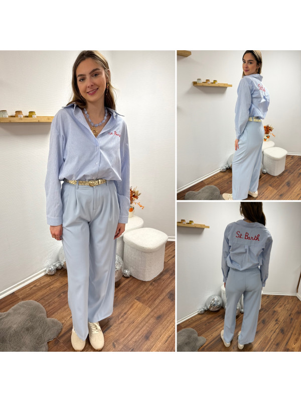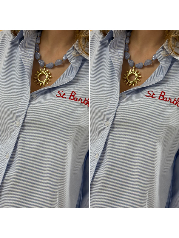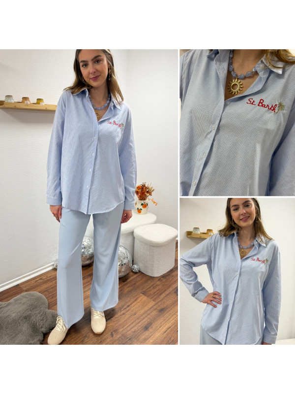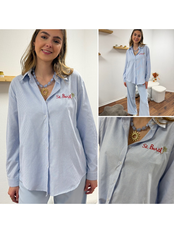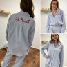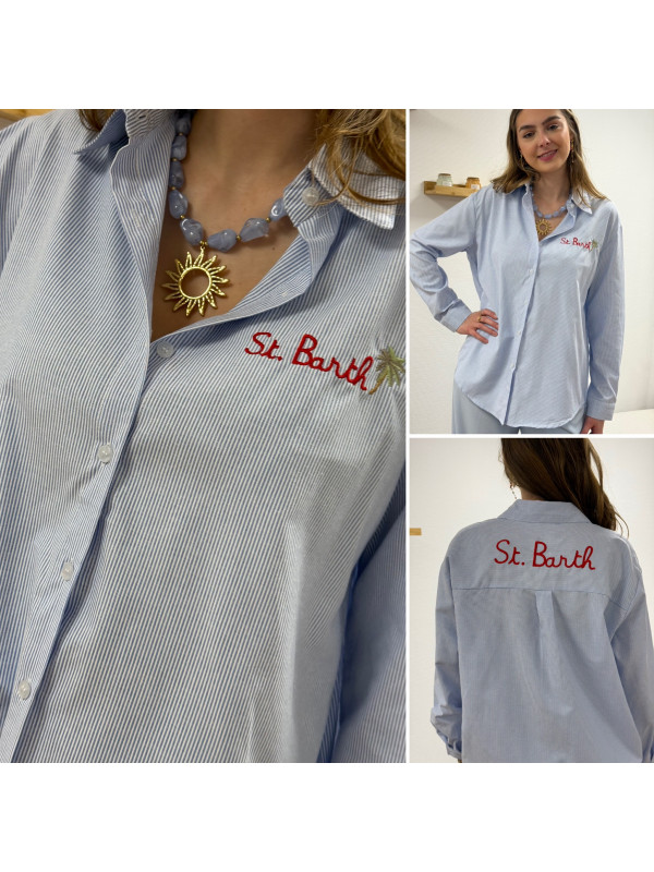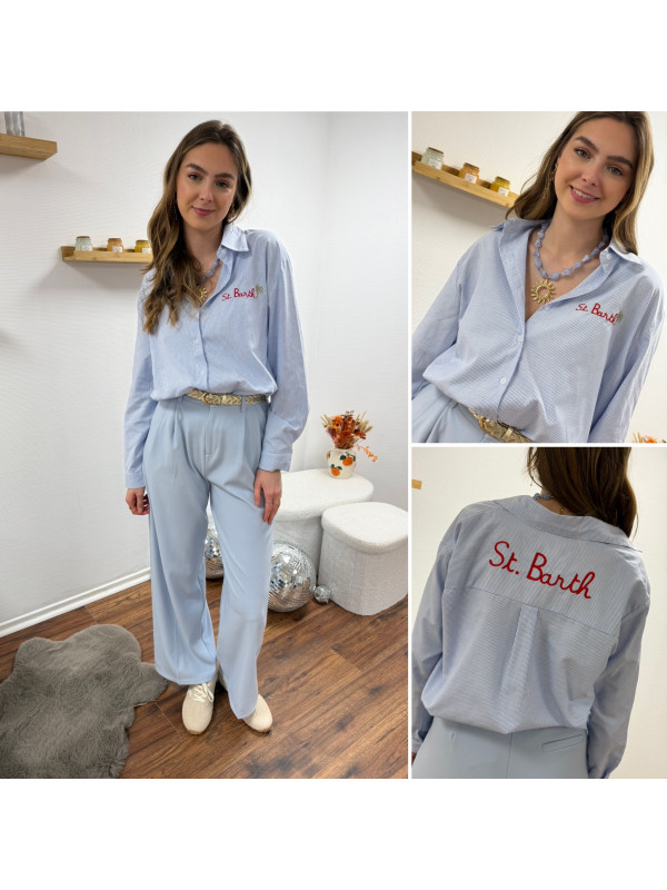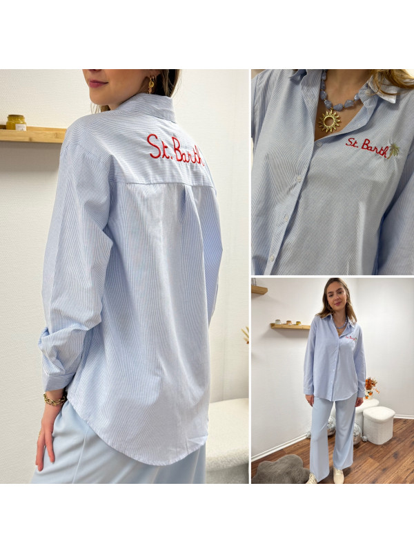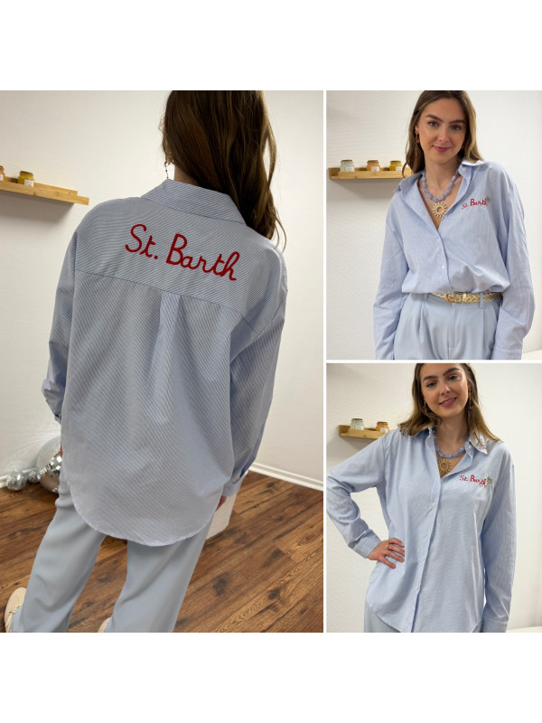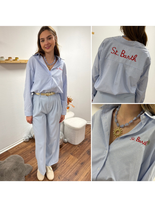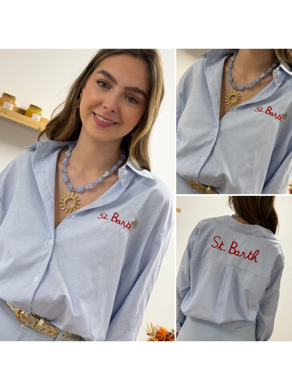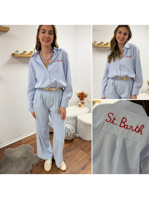 Chemise blanche à rayures bleues avec écriture st Barth rouge devant et dans le dos