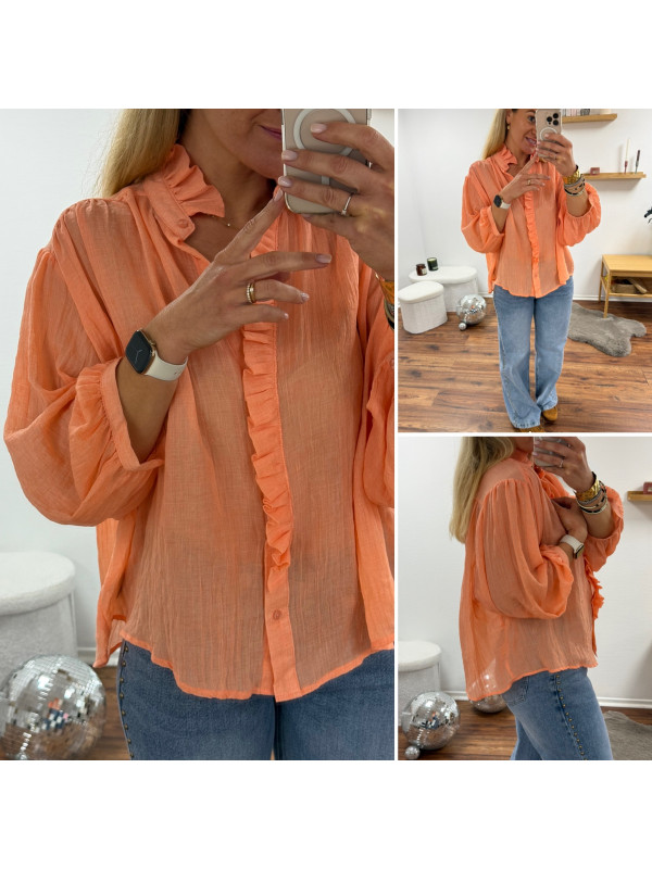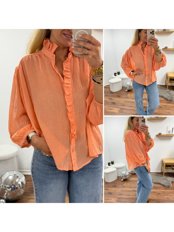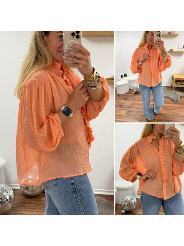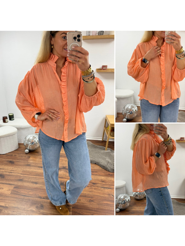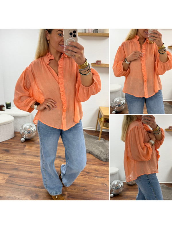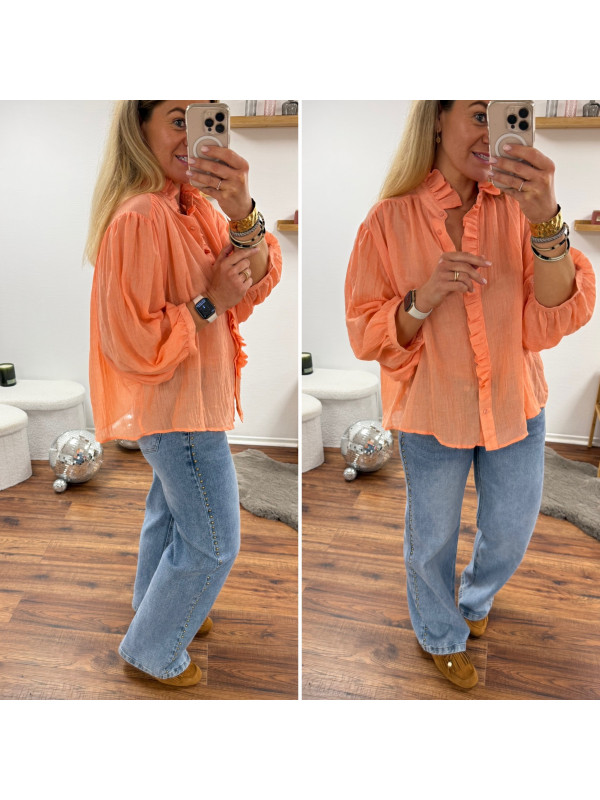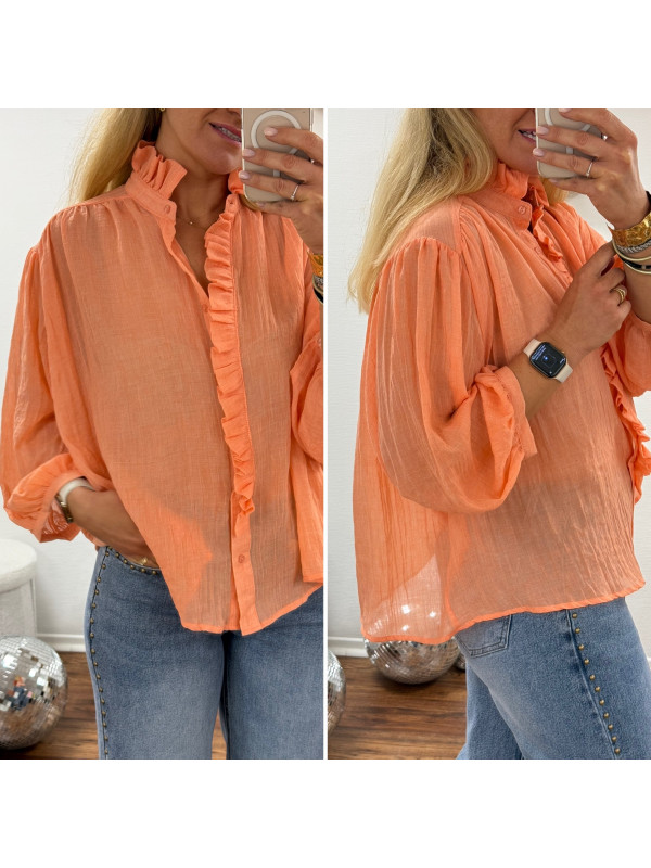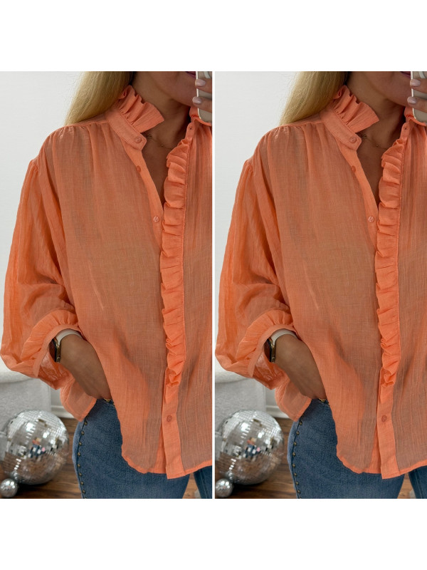 Chemise orange saumon en voile fluide vaporeuse avec manches évasées et volants sur le col et la boutonnière
