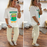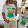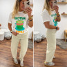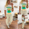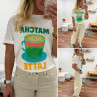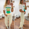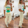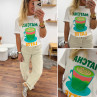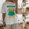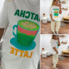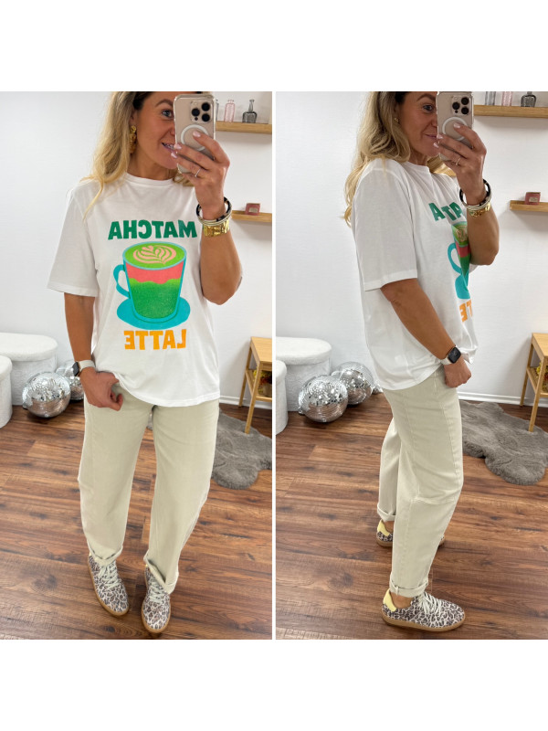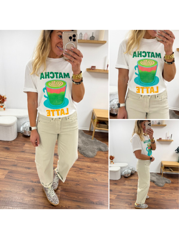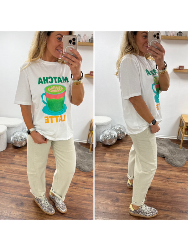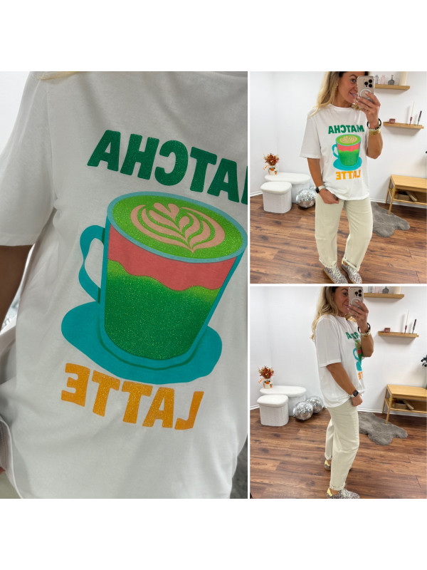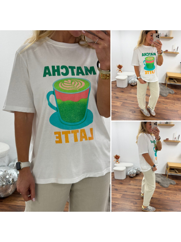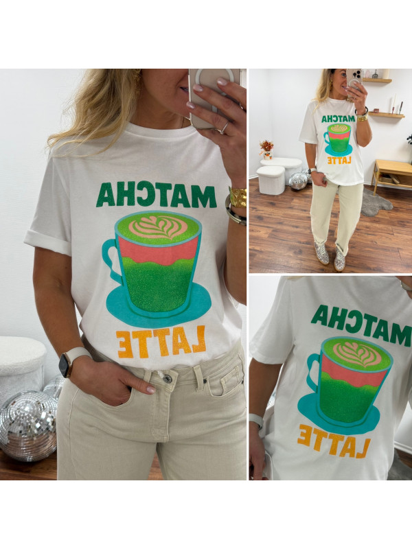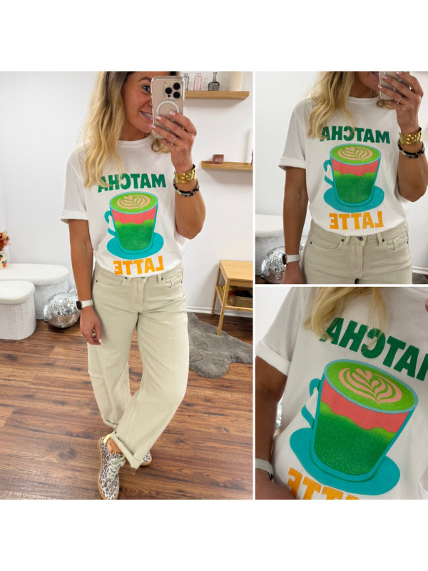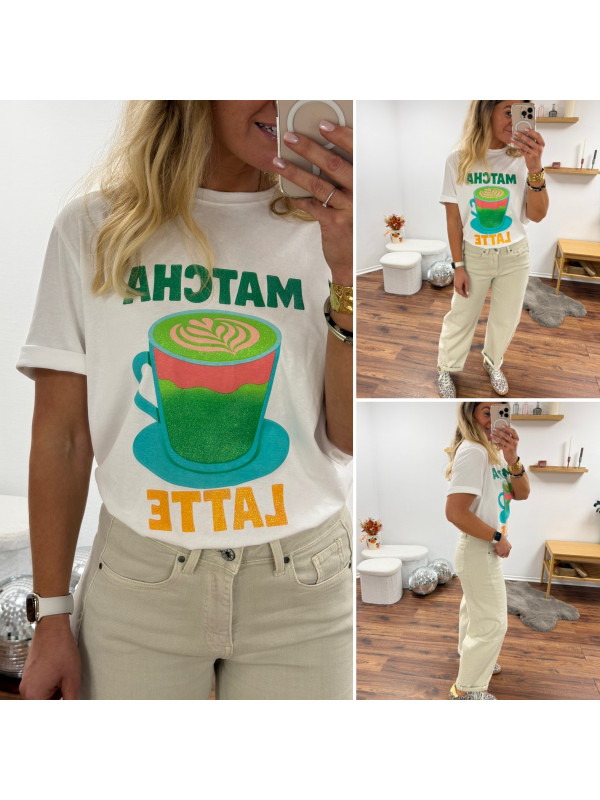 Tee shirt blanc avec inscription et dessin matcha latte vert pailleté