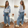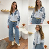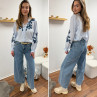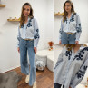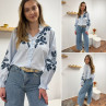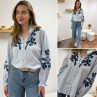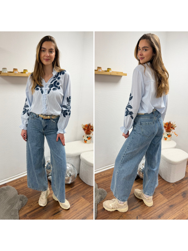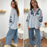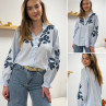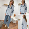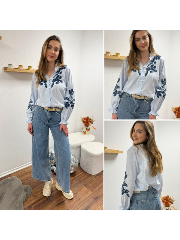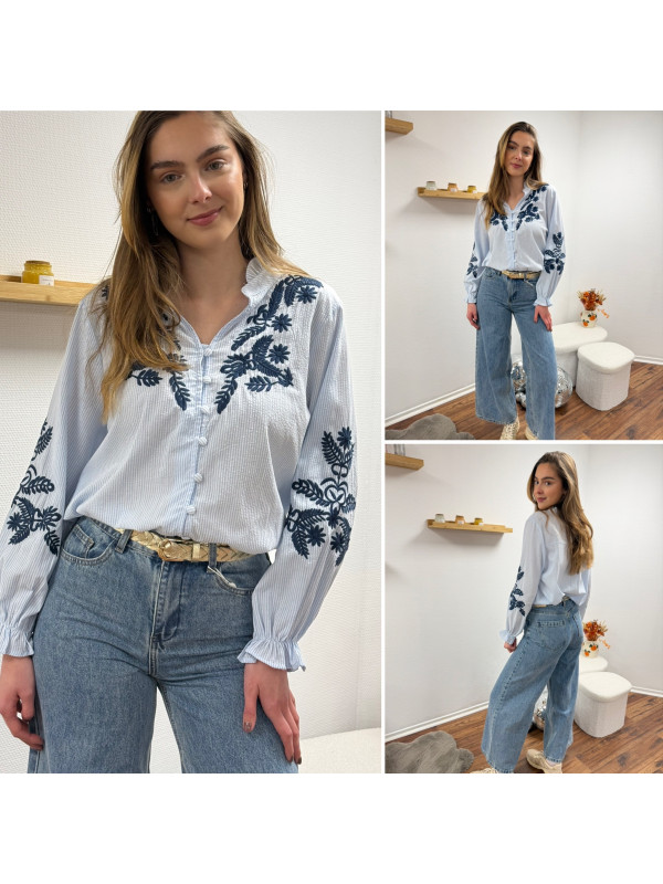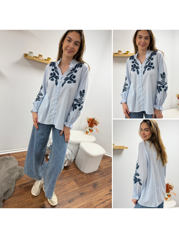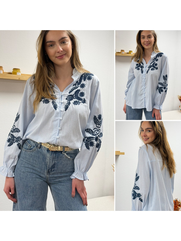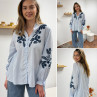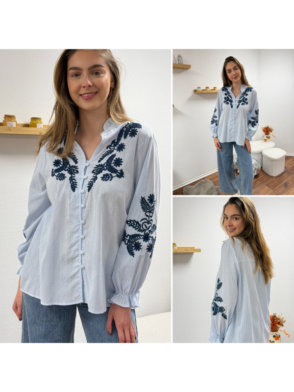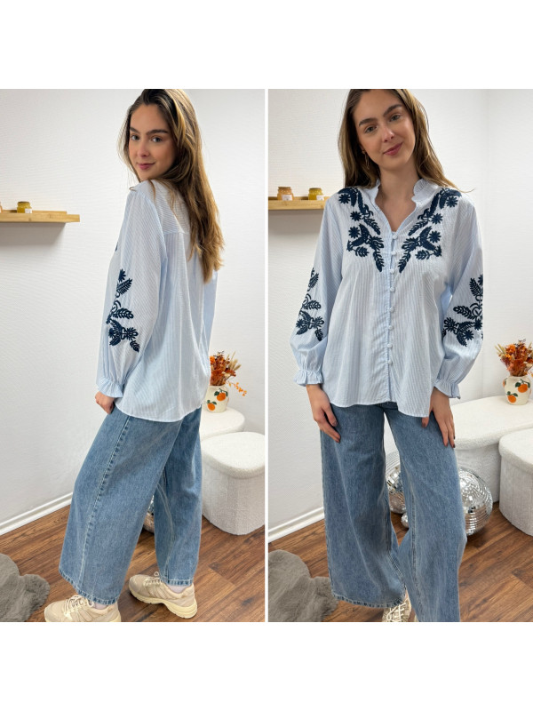 Chemise blanche à rayures bleues col V avec broderies bleues marine