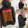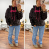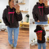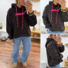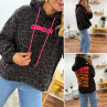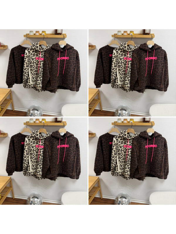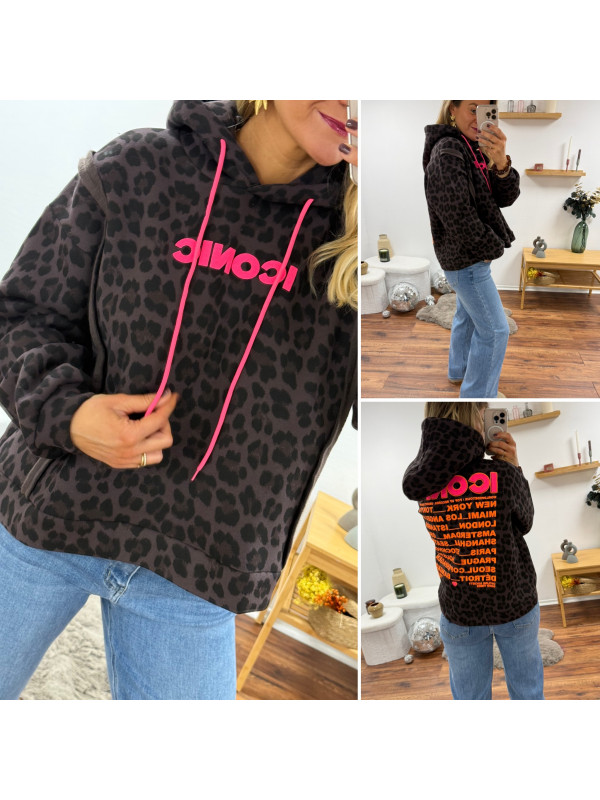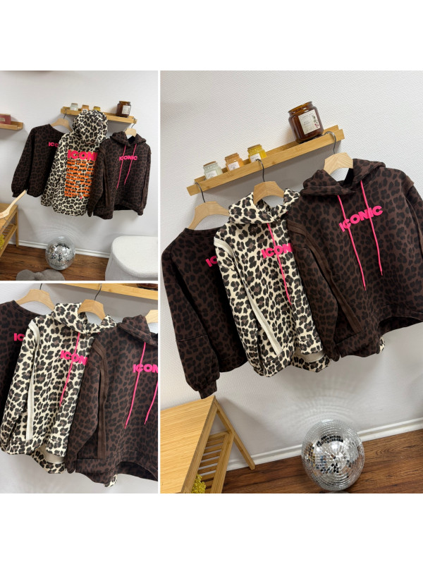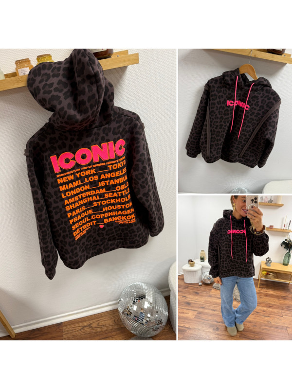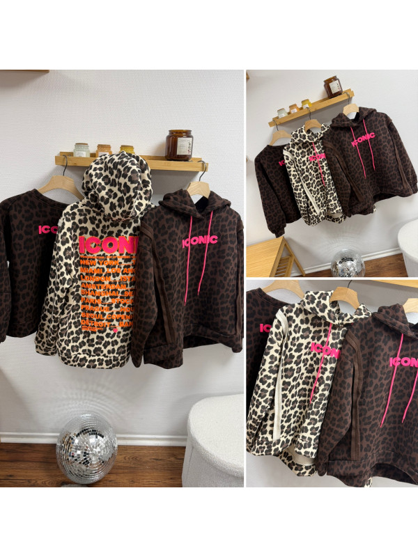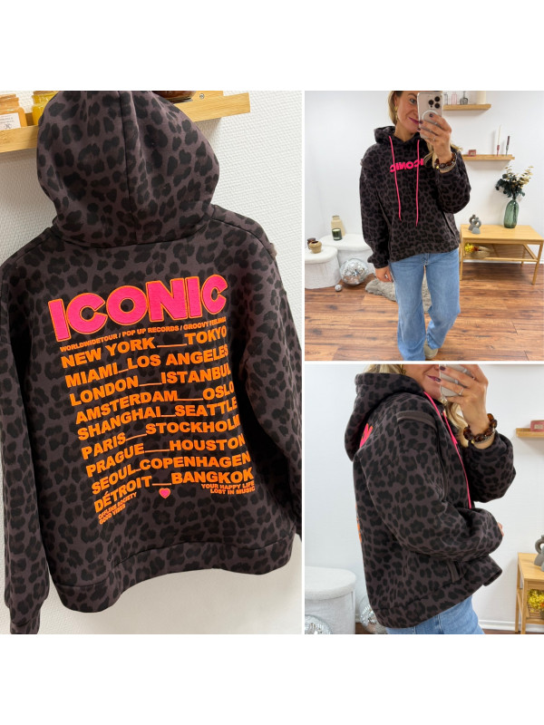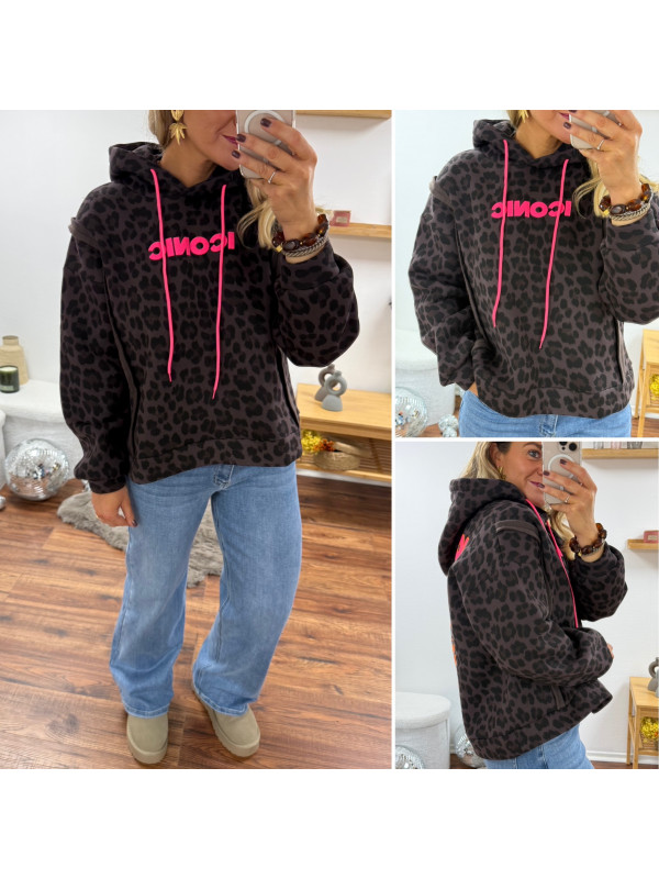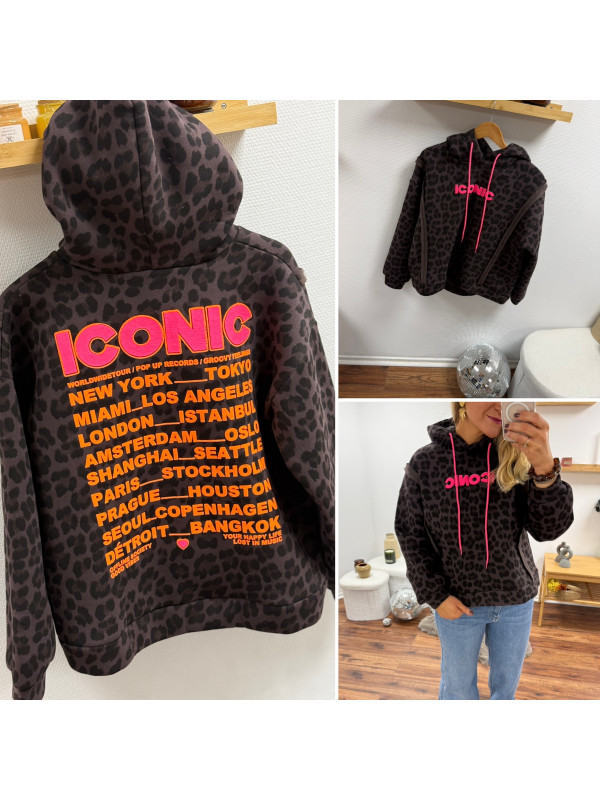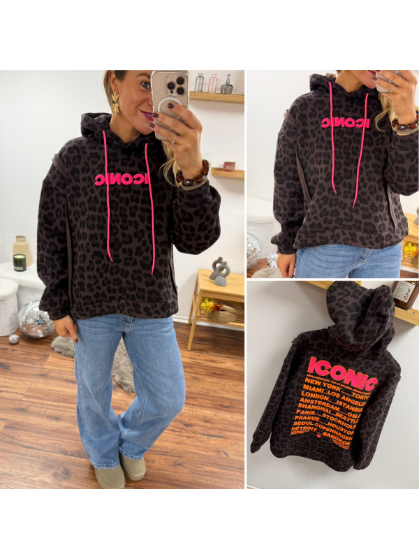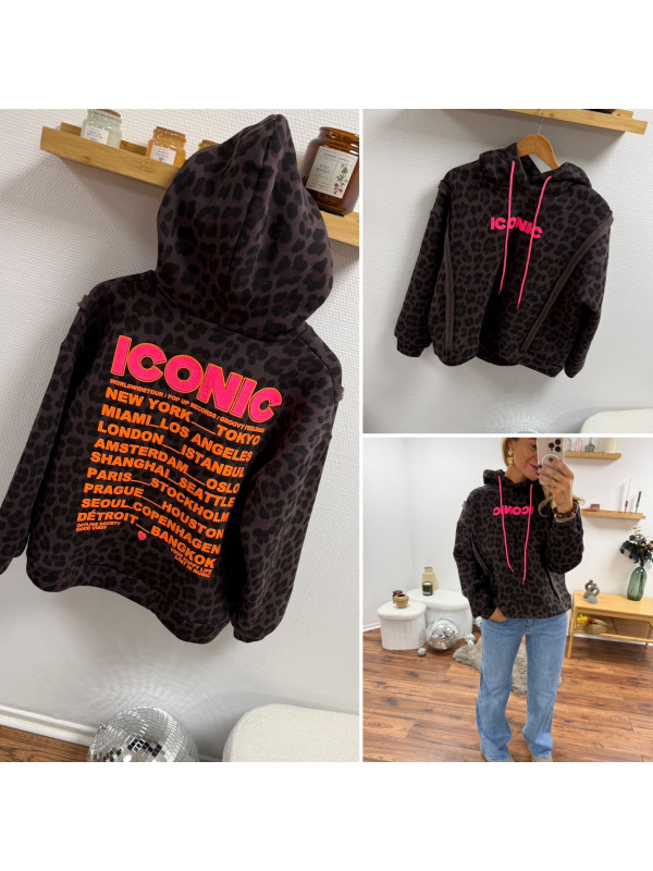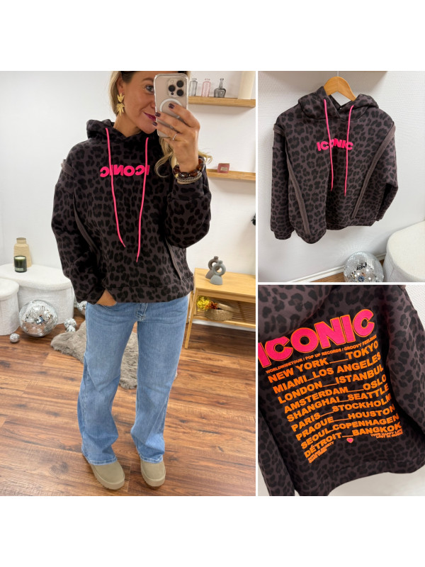 Sweat léopard chocolat à capuche avec logo "iconic" et écriture dos