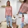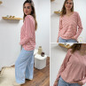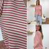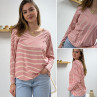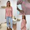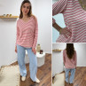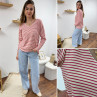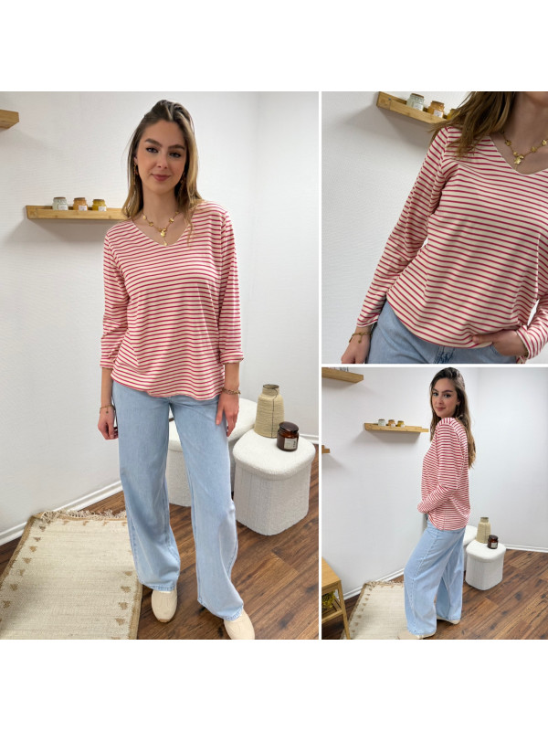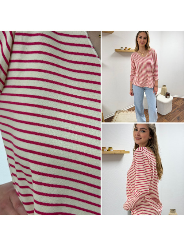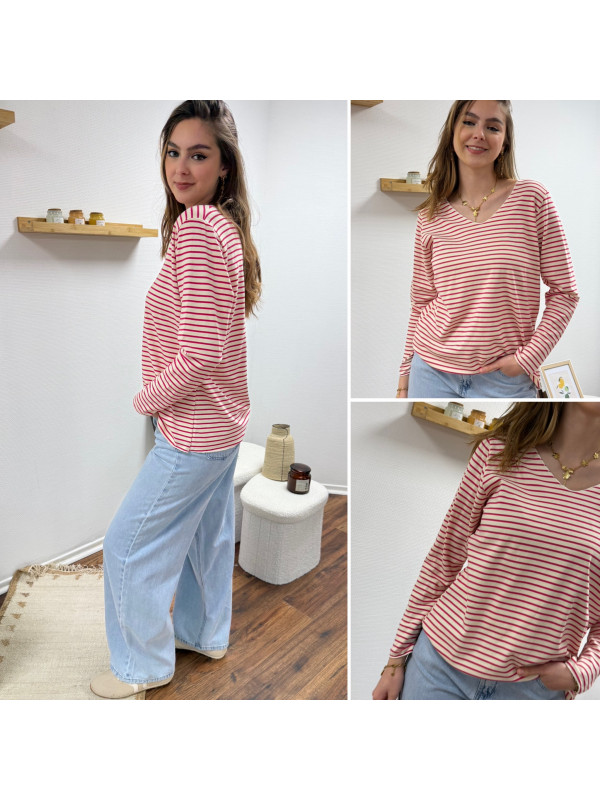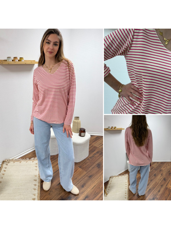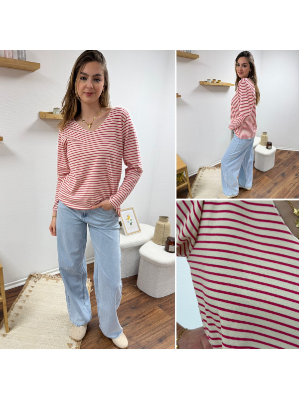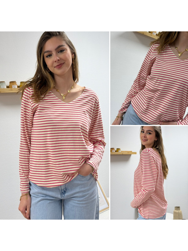 Tee-shirt manches longues col V marinière fuchsia et écru