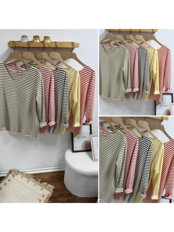 Tee-shirt manches longues col V marinière bleu marine et écru...